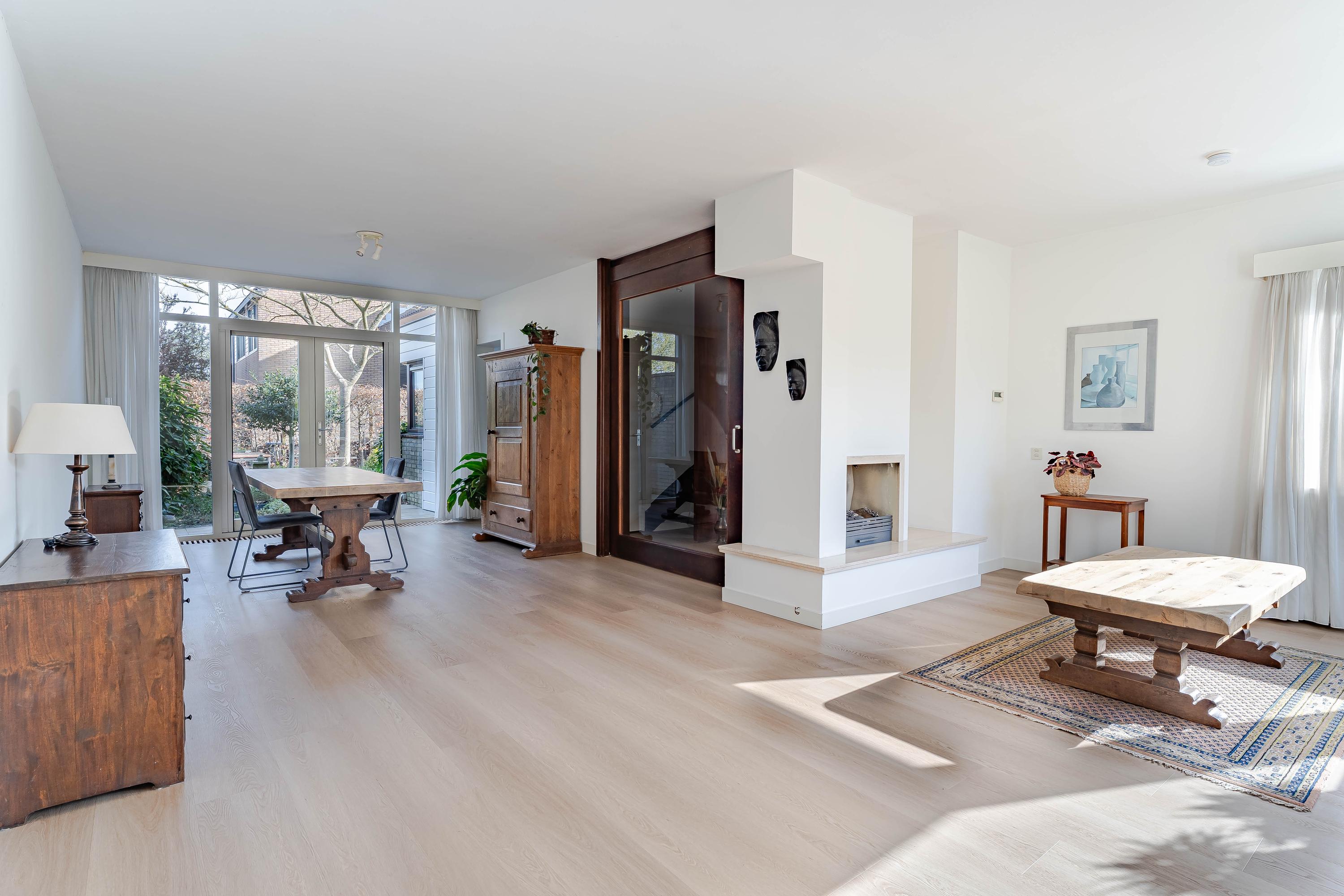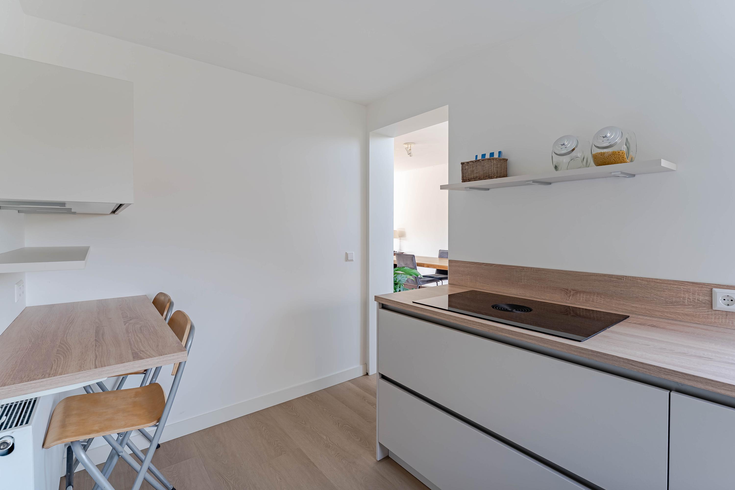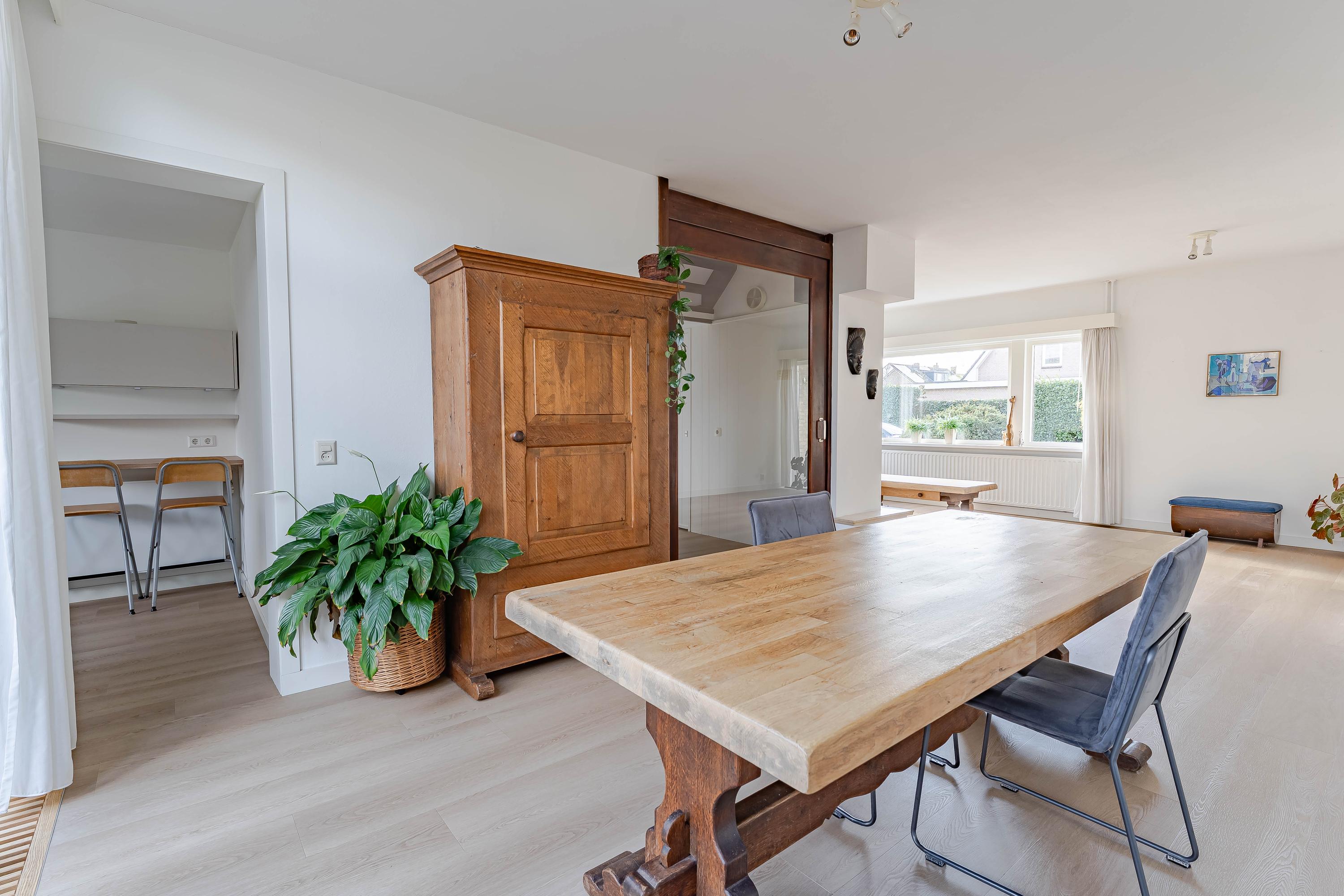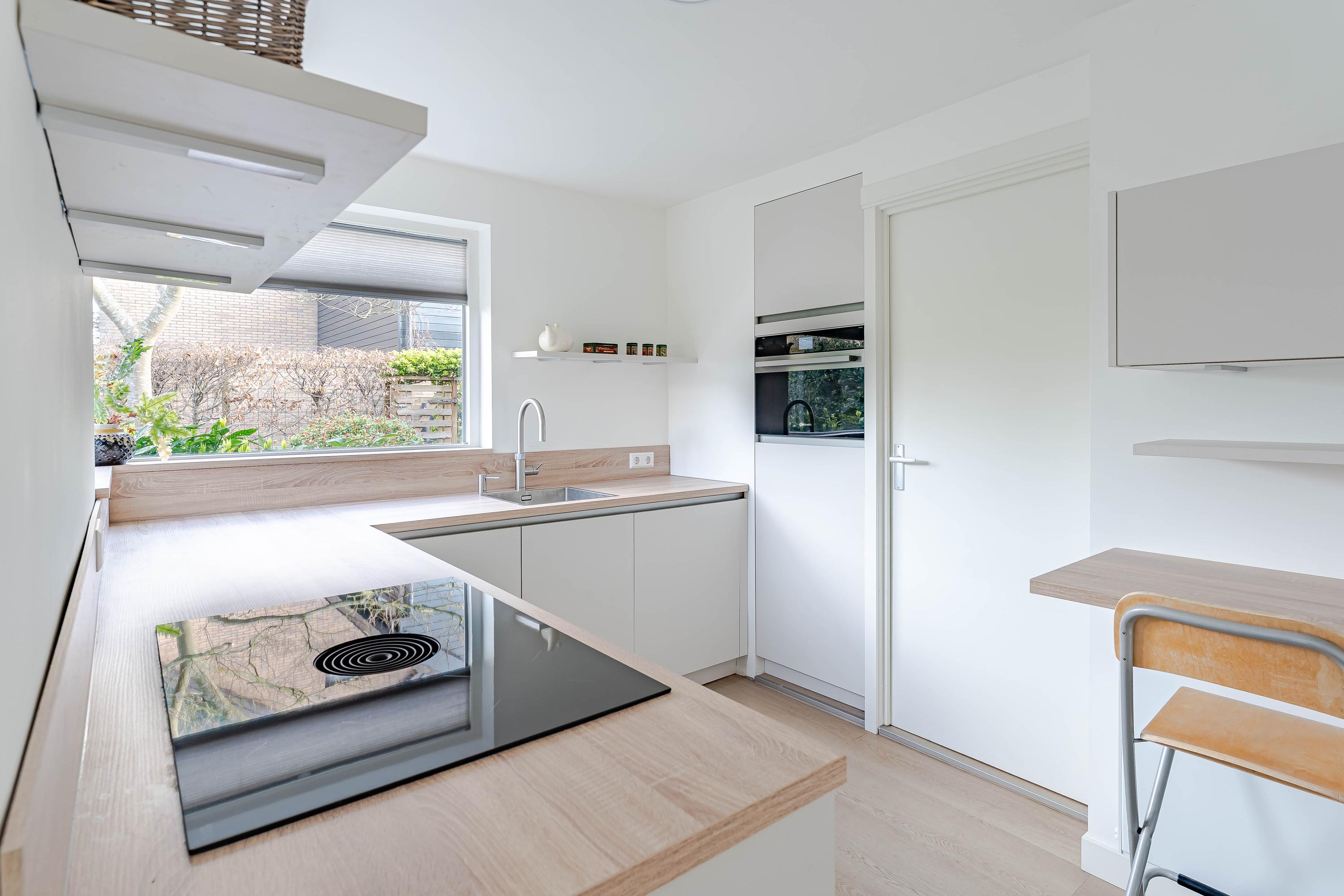 Aan de achterzijde van de woonkamer is er ruimte voor een gezellige eethoek. Hier kunt u heerlijk dineren met een grote groep vrienden/familie. De openslaande deuren zorgen voor directe toegang naar de achtertuin. De keuken is in 2023 vernieuwd, heeft een moderne en tijdloze uitstraling en is voorzien van luxe inbouwapparatuur. Er is een combioven, koelkast, Quooker en een 4-pits inductiekookplaat met geïntegreerde afzuiging van het merk BORA geplaatst. Aansluitend aan de keuken vindt u de bijkeuken, voorzien van een praktische aansluiting voor wasapparatuur en ruimte voor een vriezer. In deze ruimte staat ook een compact keukenblok met een elektrische boiler voor het warm water. Dezelfde stijlvolle PVC-vloer die in de woonkamer en keuken ligt, is hier doorgelegd, waardoor een uniforme uitstraling ontstaat. Vanuit de bijkeuken heeft u direct toegang tot de berging en, via de kunststof loopdeur, tot de achtertuin.