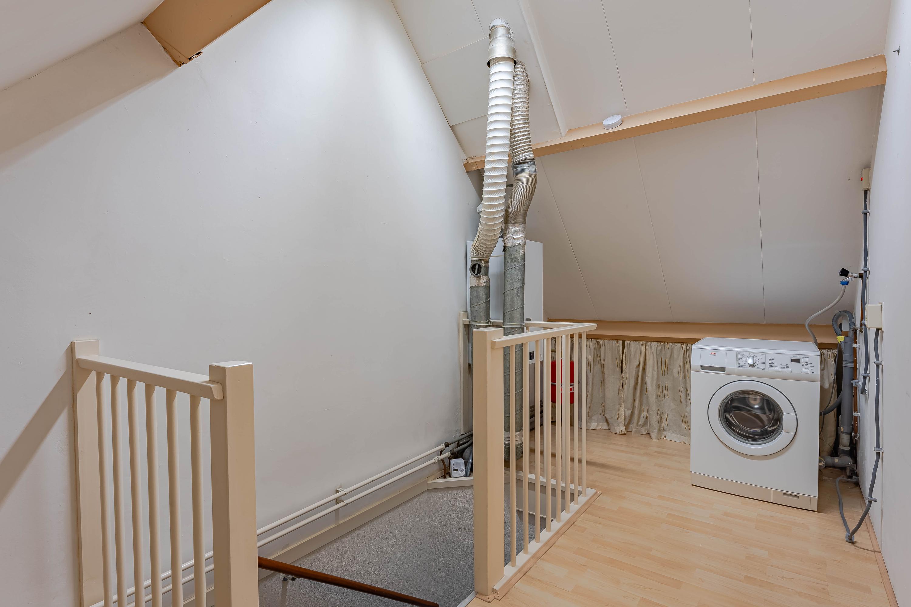 Overloop met opstelling van de CV-ketel en was-/drogeraansluitingen. Verder is er achter de knieschotten voldoende bergruimte.