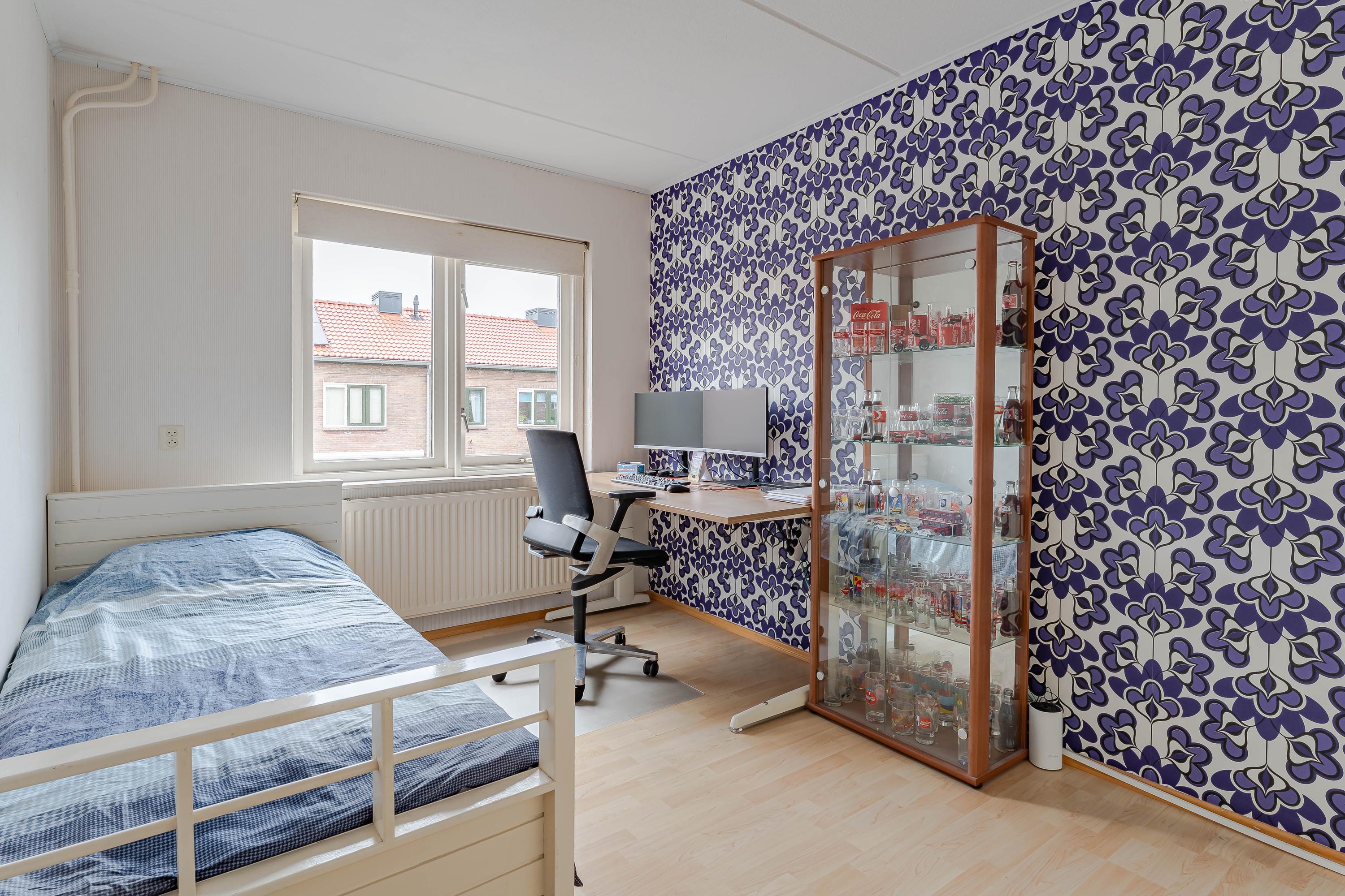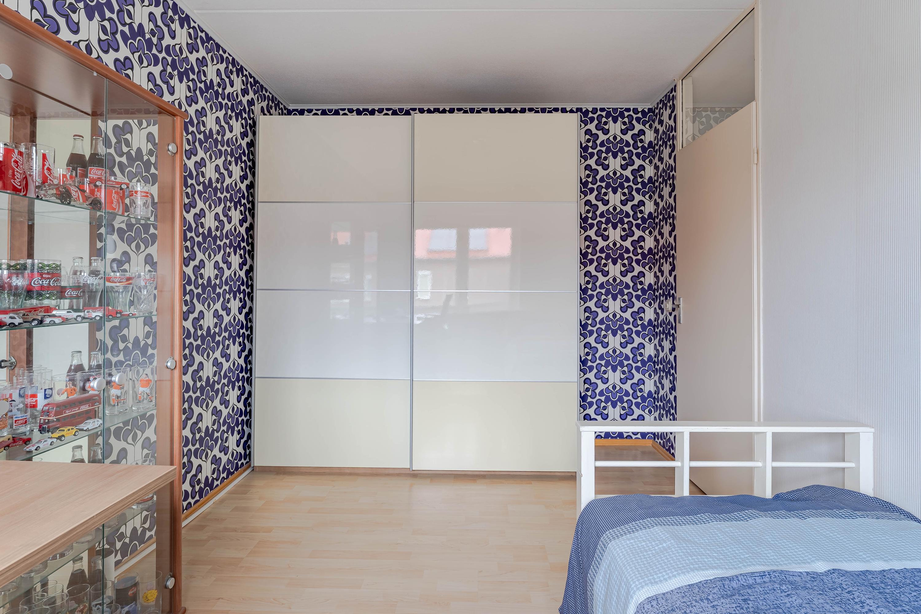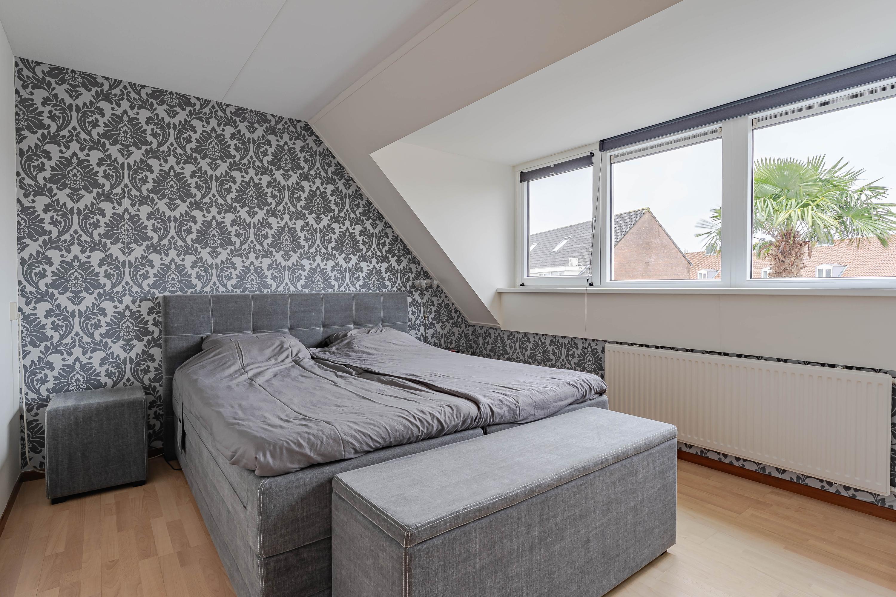 Overloop met toegang tot de twee slaapkamers, badkamer en trapopgang naar de tweede verdieping. De slaapkamer aan de achterzijde is in 2023 vergroot met een kunststof dakkapel, daardoor is deze slaapkamer extra ruim. De vloer is afgewerkt met laminaat, de wanden zijn behangen en er zijn elektrische rolluiken geplaatst. De tweede slaapkamer bevindt zich aan de voorzijde van de woning, een ideale werkruimte of extra slaapkamer.