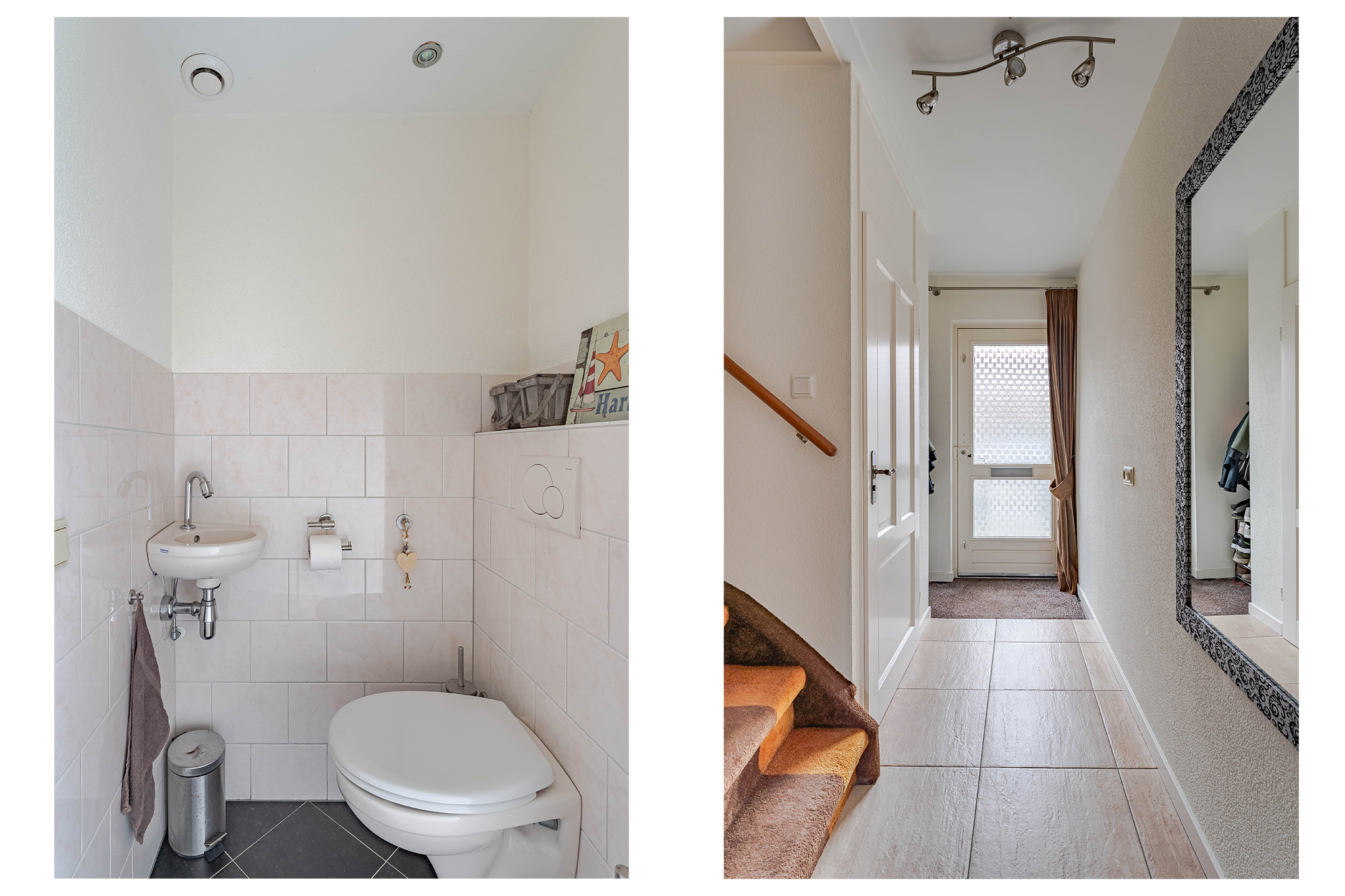 Entree via de voortuin in de hal met vernieuwde meterkast, modern toilet met fonteintje en toegang tot de woonkamer en eerste verdieping.