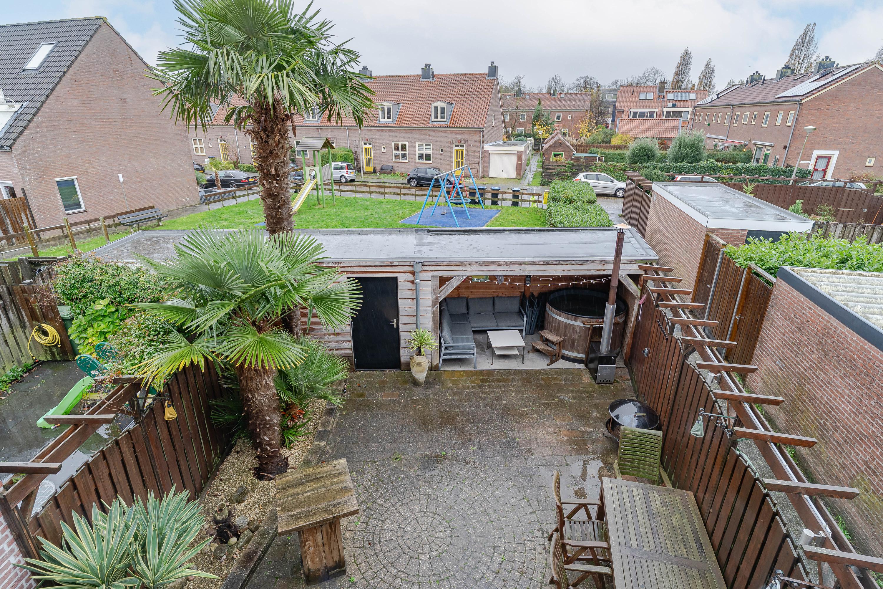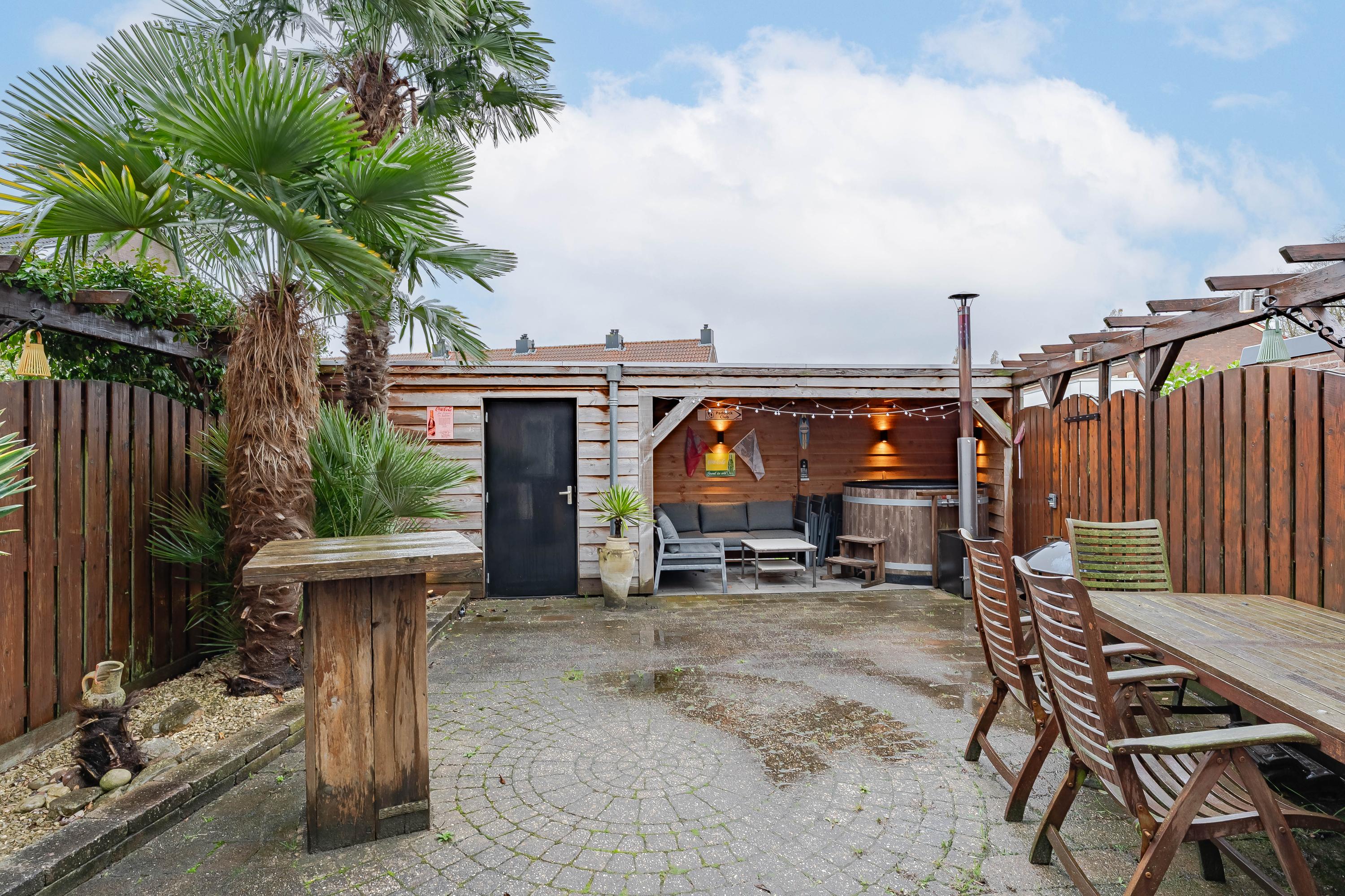 Door de openslaande deuren in de woonkamer is er toegang tot de ruime en zonnige achtertuin gelegen op het zuiden met berging en achterom. De in 2020 geplaatste overkapping is een heerlijke plek om te genieten van de lange zomeravonden.