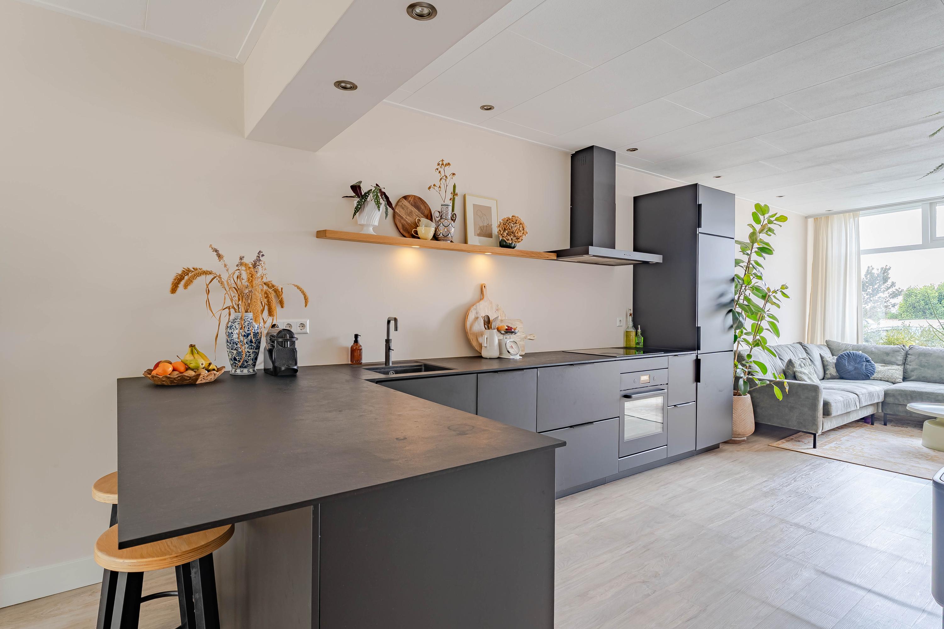 De open keuken verbindt de woonkamer en eethoek. De matzwarte keuken is modern en voorzien van een vaatwasser, inductiekookplaat, afzuigkap, oven en een Quooker. Vanuit de keuken is er toegang tot het souterrain.