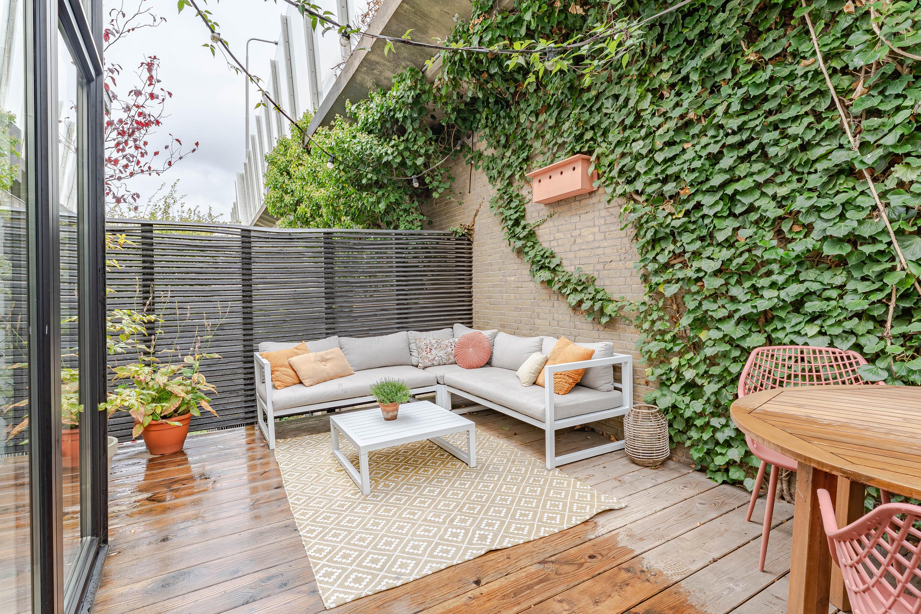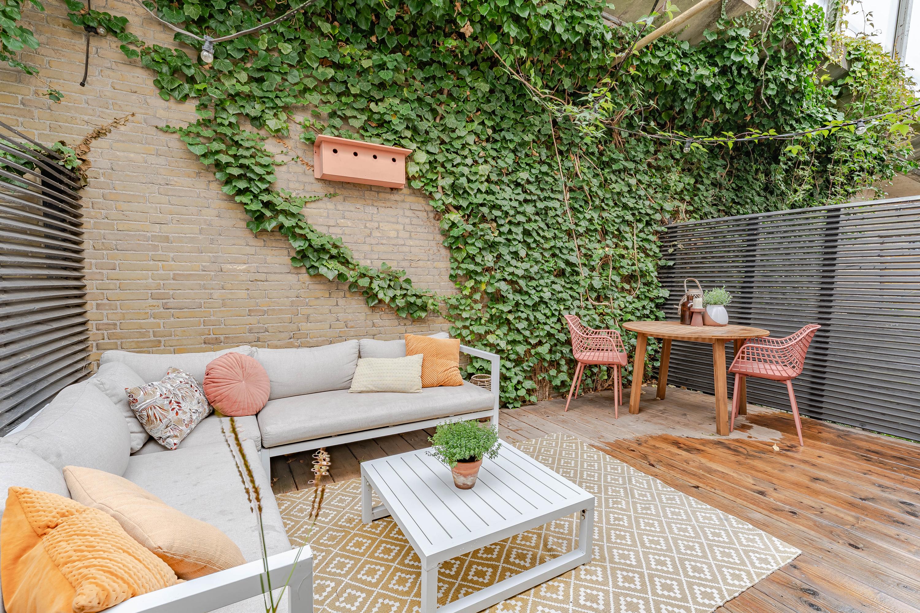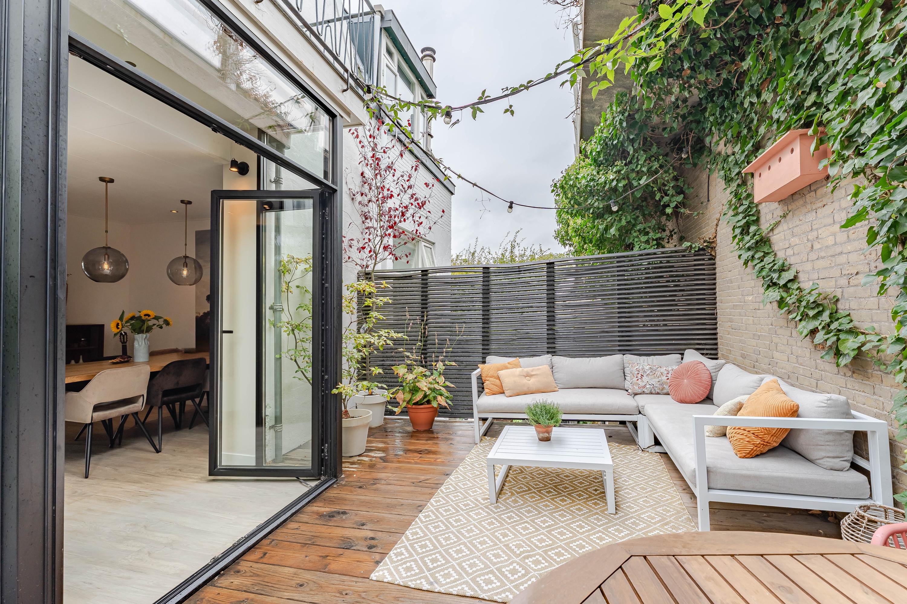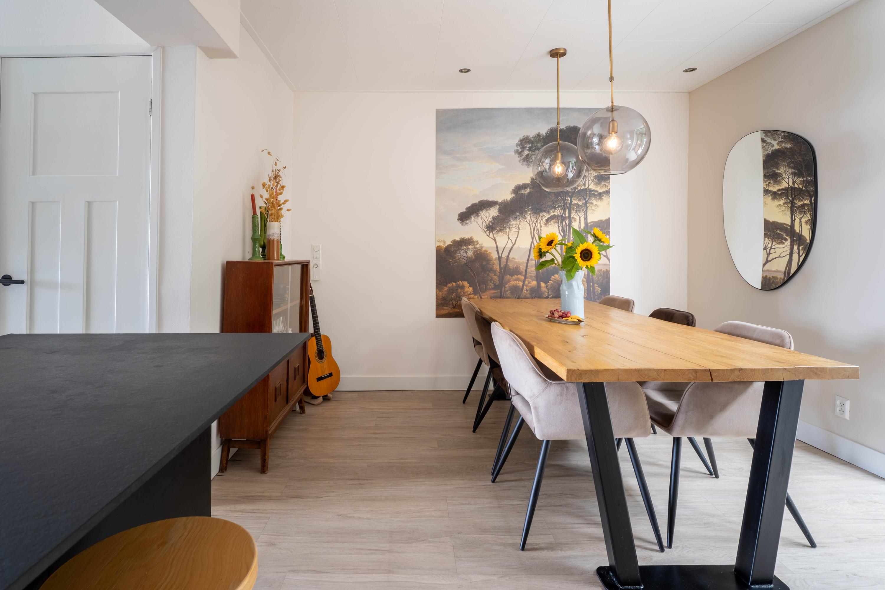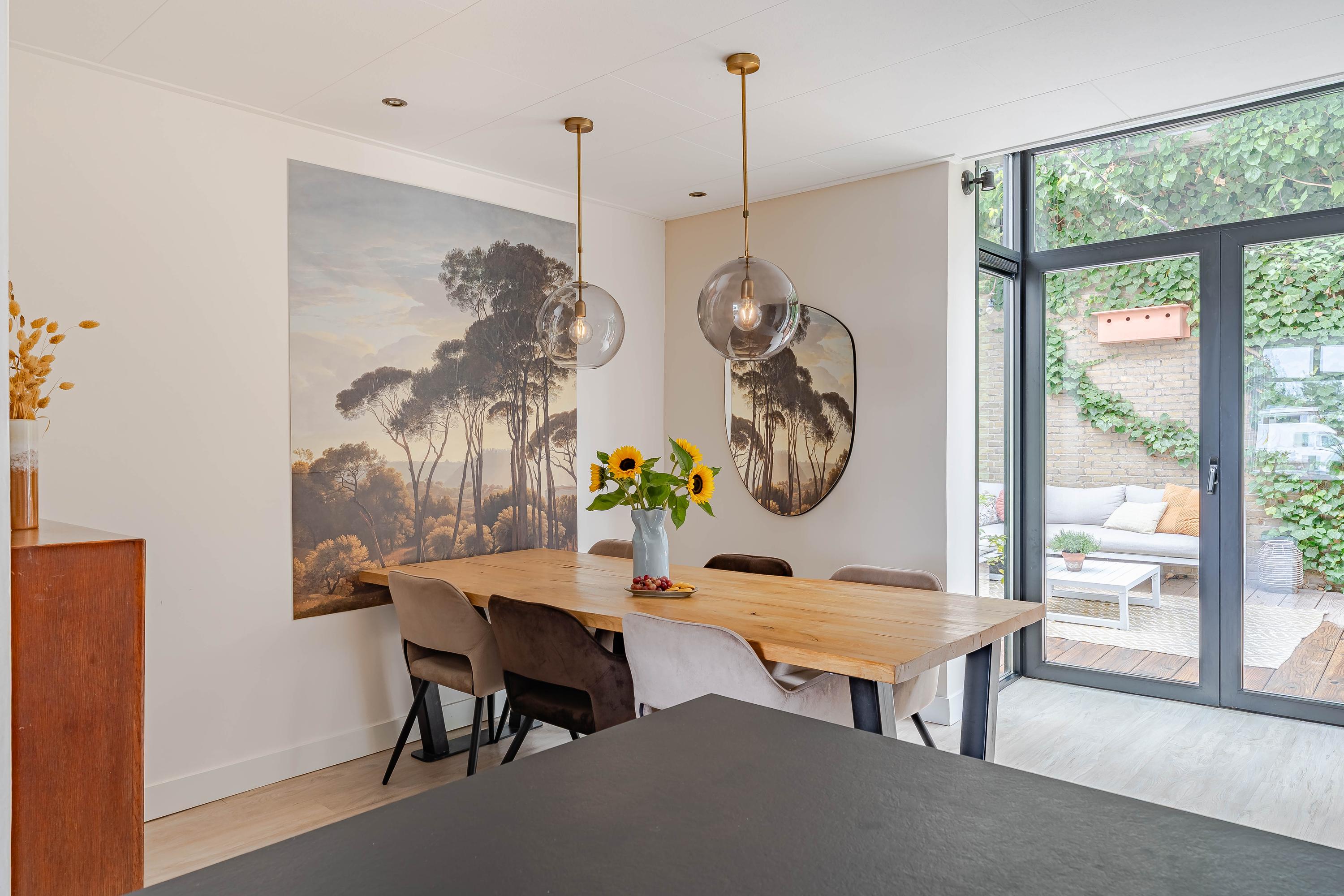 Aan de achterkant is in 2022 een nieuwe pui geplaatst welke zorgt voor veel lichtinval. Er is een ruime eethoek gecreëerd en u stapt zo naar buiten het terras op. Een heerlijke plek voor een kopje koffie in de ochtendzon.