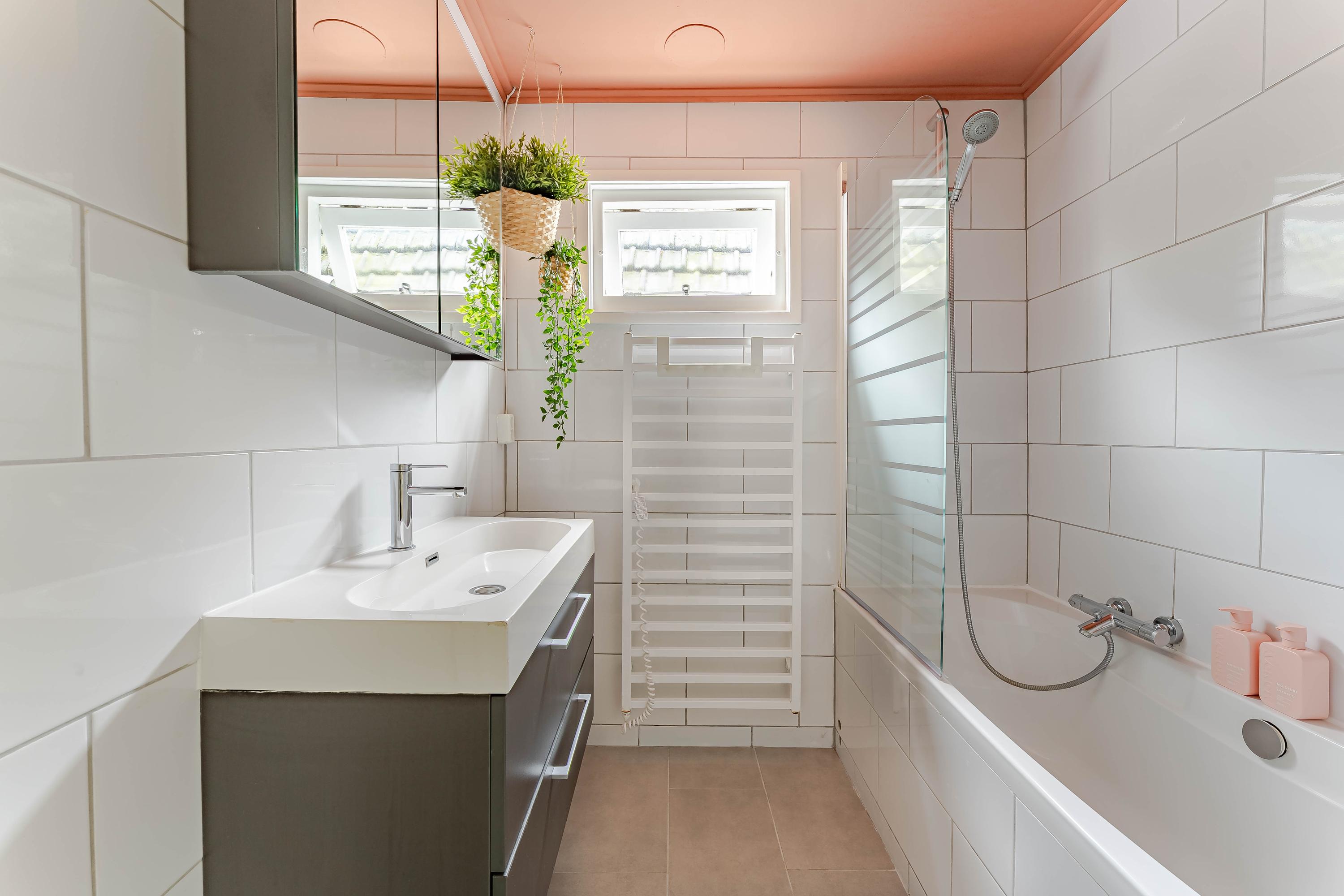 De badkamer is geheel betegeld en ingericht met een ligbad met douche, wastafelmeubel en designradiator.