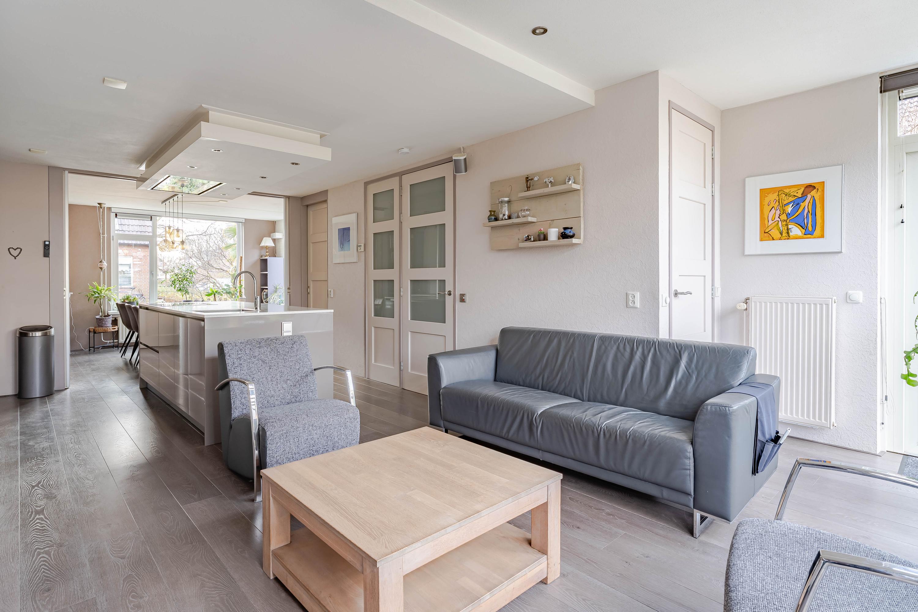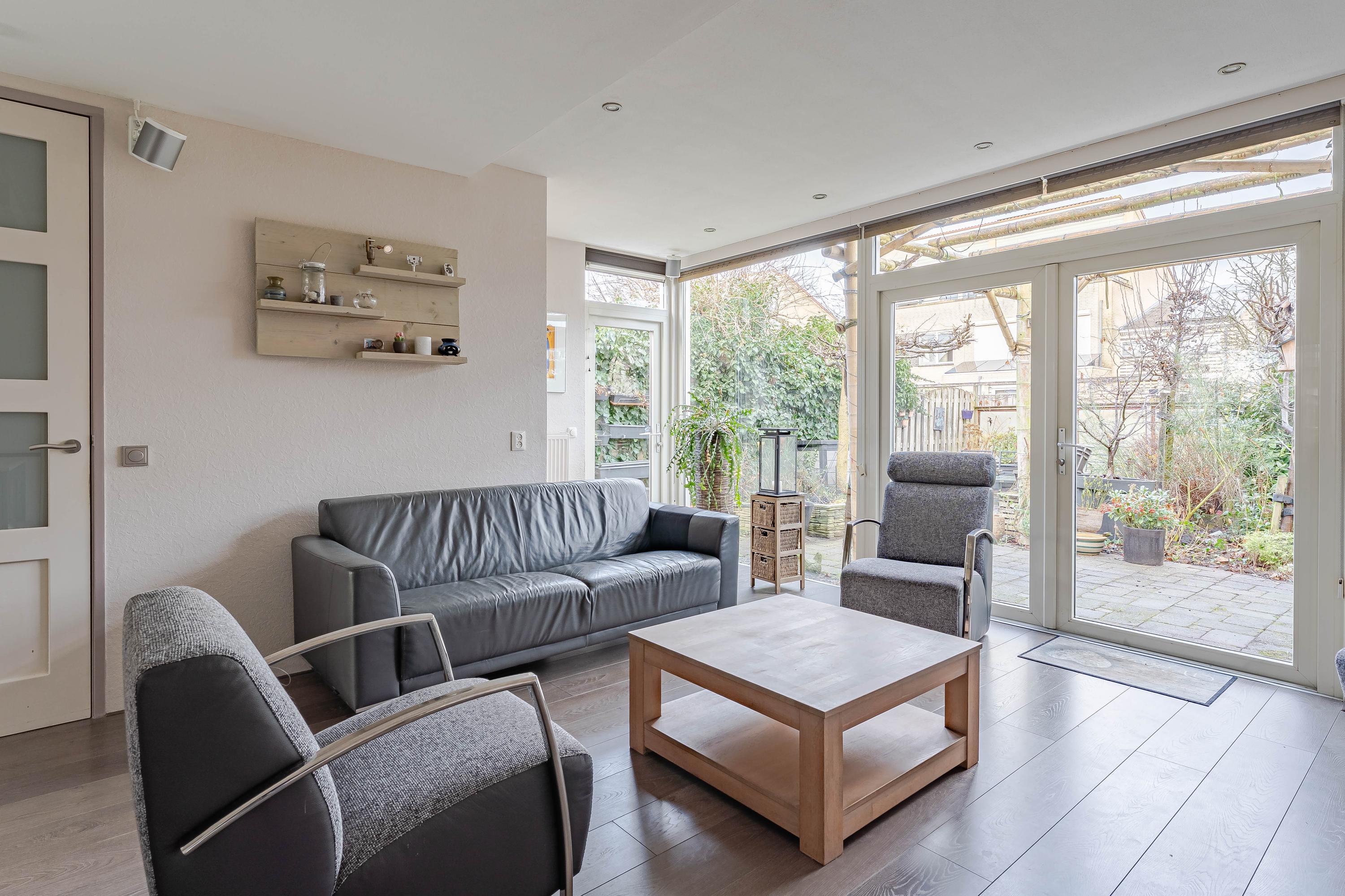 De uitgebouwde woonkamer ligt aan de achterzijde waardoor deze leuk uitkijkt op de tuin. Met de uitbouw is hier vloerverwarming gelegd. In de vaste kast vind u de CV-ketel van Nefit uit 2009.