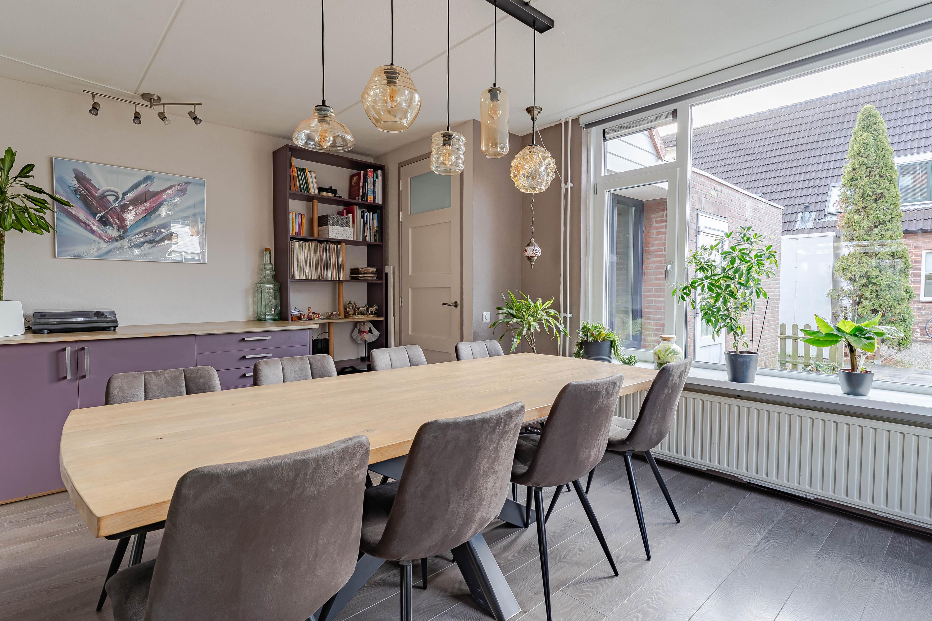Aan de voorzijde van de woning vindt u de eethoek, hier kunt u met gemak een tafel met 8 stoelen kwijt. Door de en-suite deuren is de eetkamer af te sluiten van de keuken en de woonkamer.