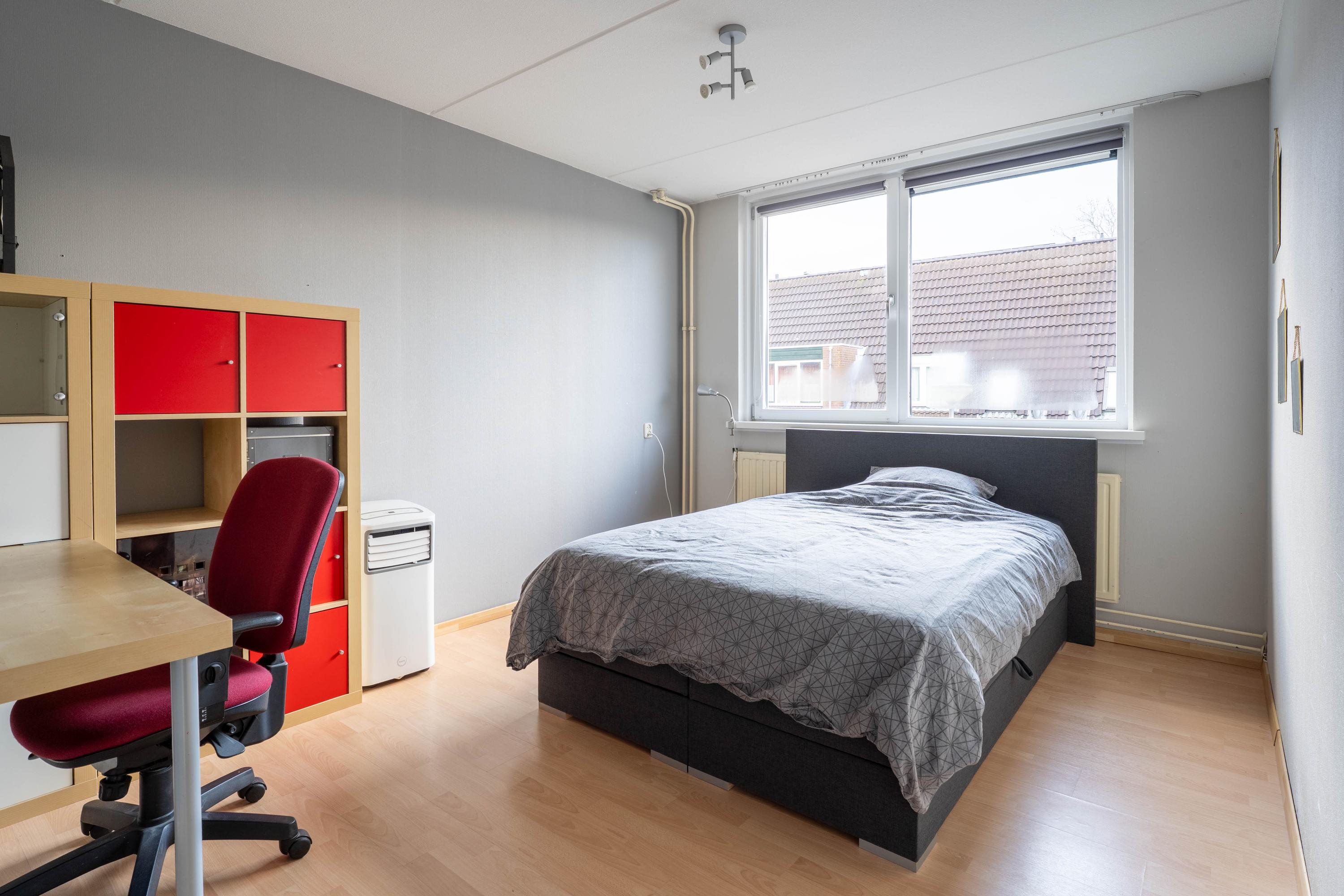Aan de voorzijde ligt de ruime masterbedroom en een tweede slaapkamer met vaste kast. Aan de achterzijde ligt de derde slaapkamer en de badkamer.