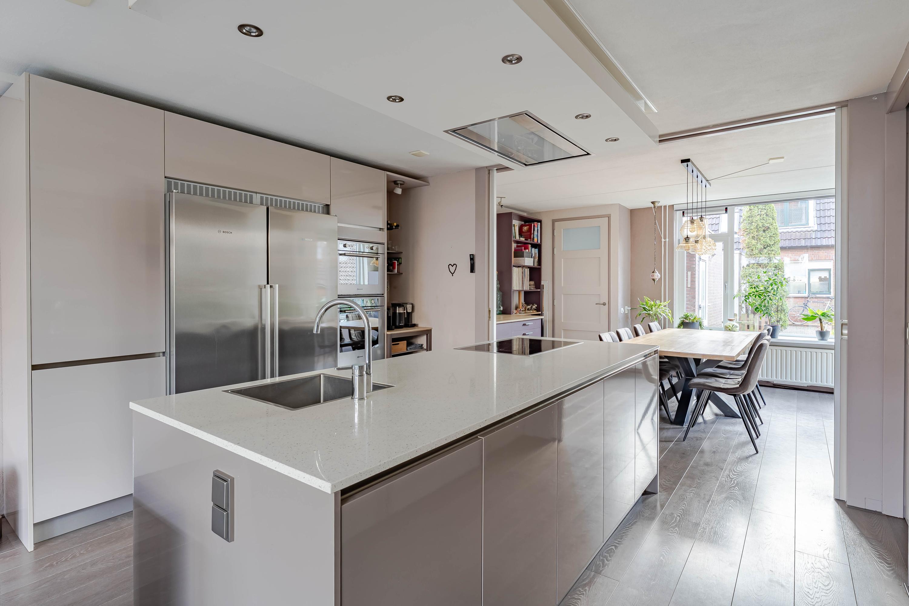 De moderne keuken met eiland is in het midden van de woning geplaatst, vernieuwd in 2015 en ingericht met een inductiekookplaat, afzuigkap, combimagnetron, oven, koelkast, vriezer en vaatwasser. De praktische trapkast geeft extra bergruimte.
