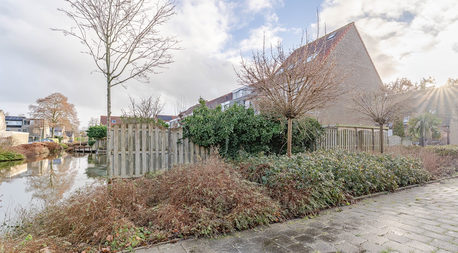 Vanuit de woonkamer is er toegang tot de ruime achtertuin met achterom. Door de ligging op het noordwesten een heerlijke plek om de hele dag van de zon te genieten. Aan de achterzijde grenst de tuin aan water, ook hier is een leuke zitgelegenheid gemaakt op de vlonder.