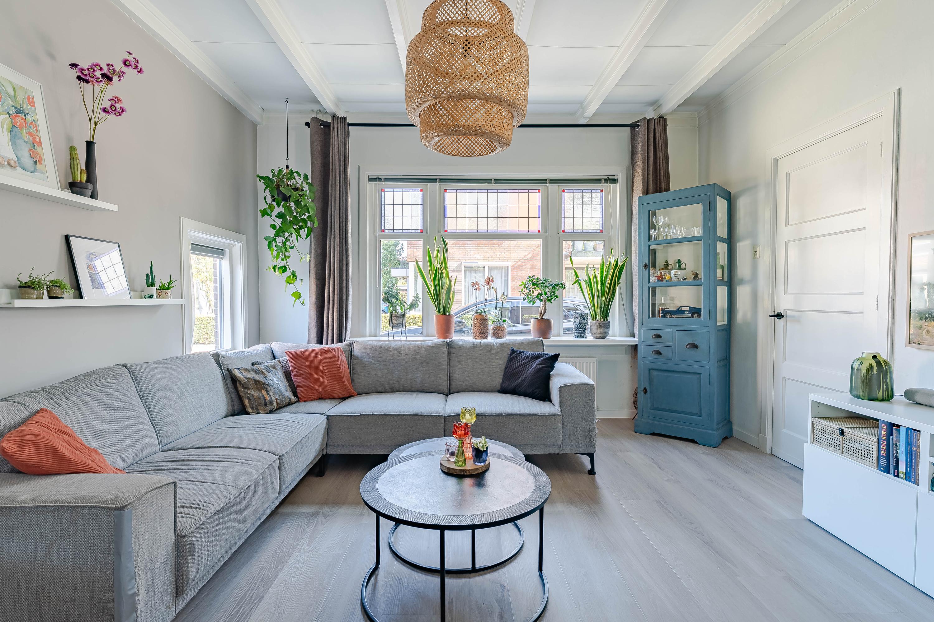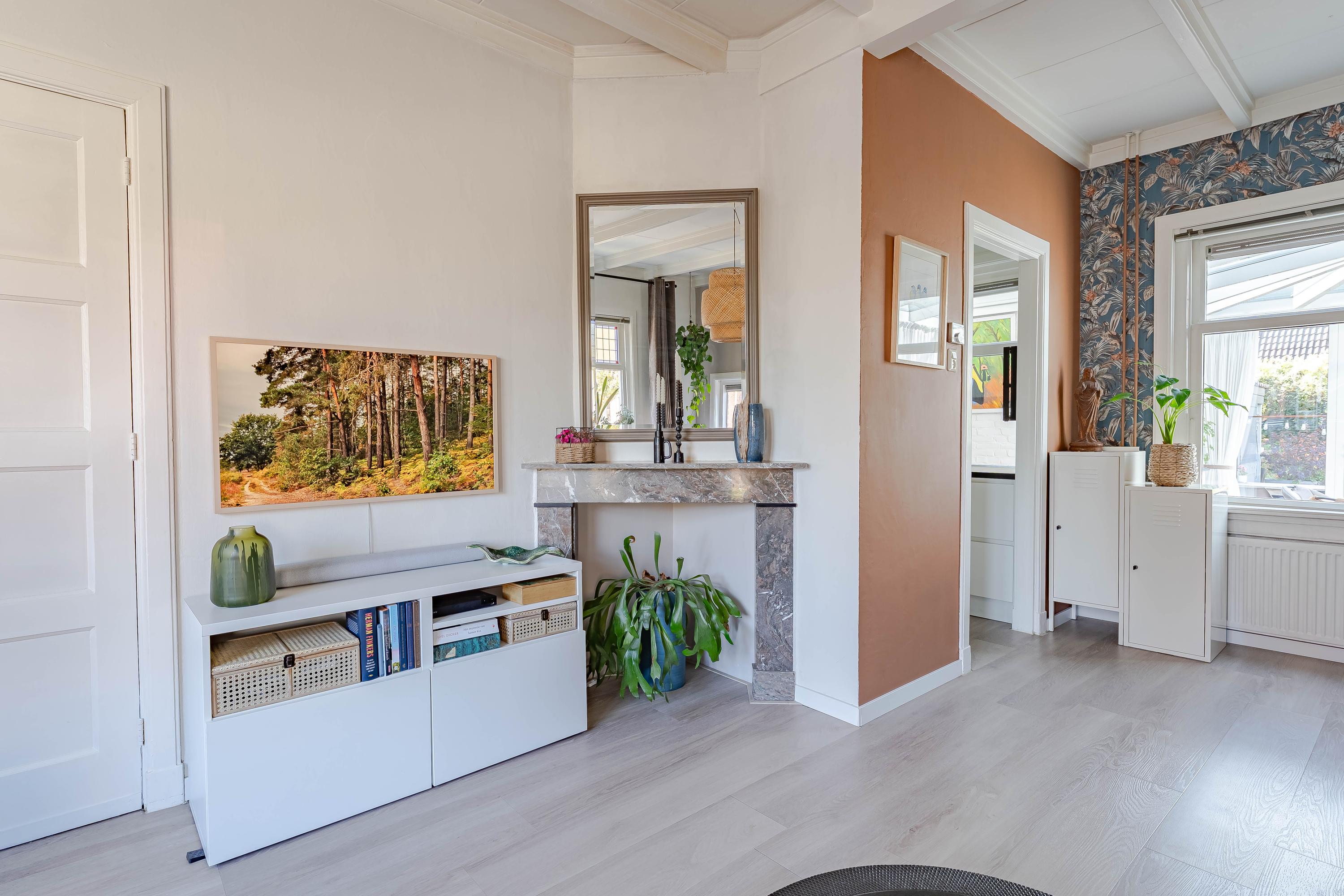 In de sfeervolle woonkamer zie je de jaren ’30 details terug in het balkenplafond, glas in lood en de schouw. De woonkamer is ruim en heeft door het zijraam extra veel lichtinval. De vloer is afgewerkt met PVC en de wanden zijn afgewerkt met stucwerk en behang.