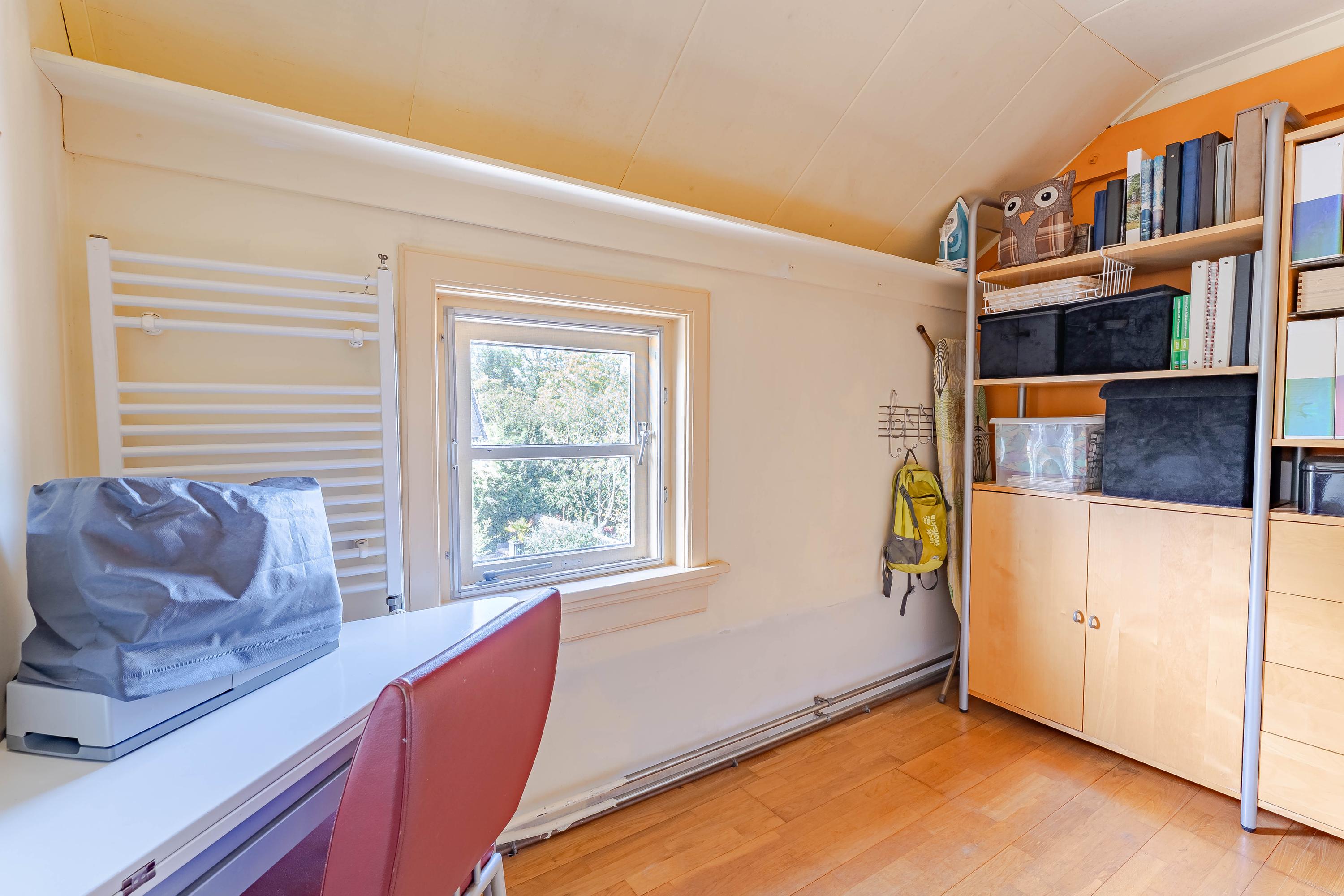 Aan de voorzijde bevinden zich twee slaapkamers. Een van de kamers is voorzien van een vaste kast. De vloeren zijn afgewerkt met zeil en de wanden zijn behangen. Dan is er nog een kleine kamer, ideaal als hobbykamer of kantoor.