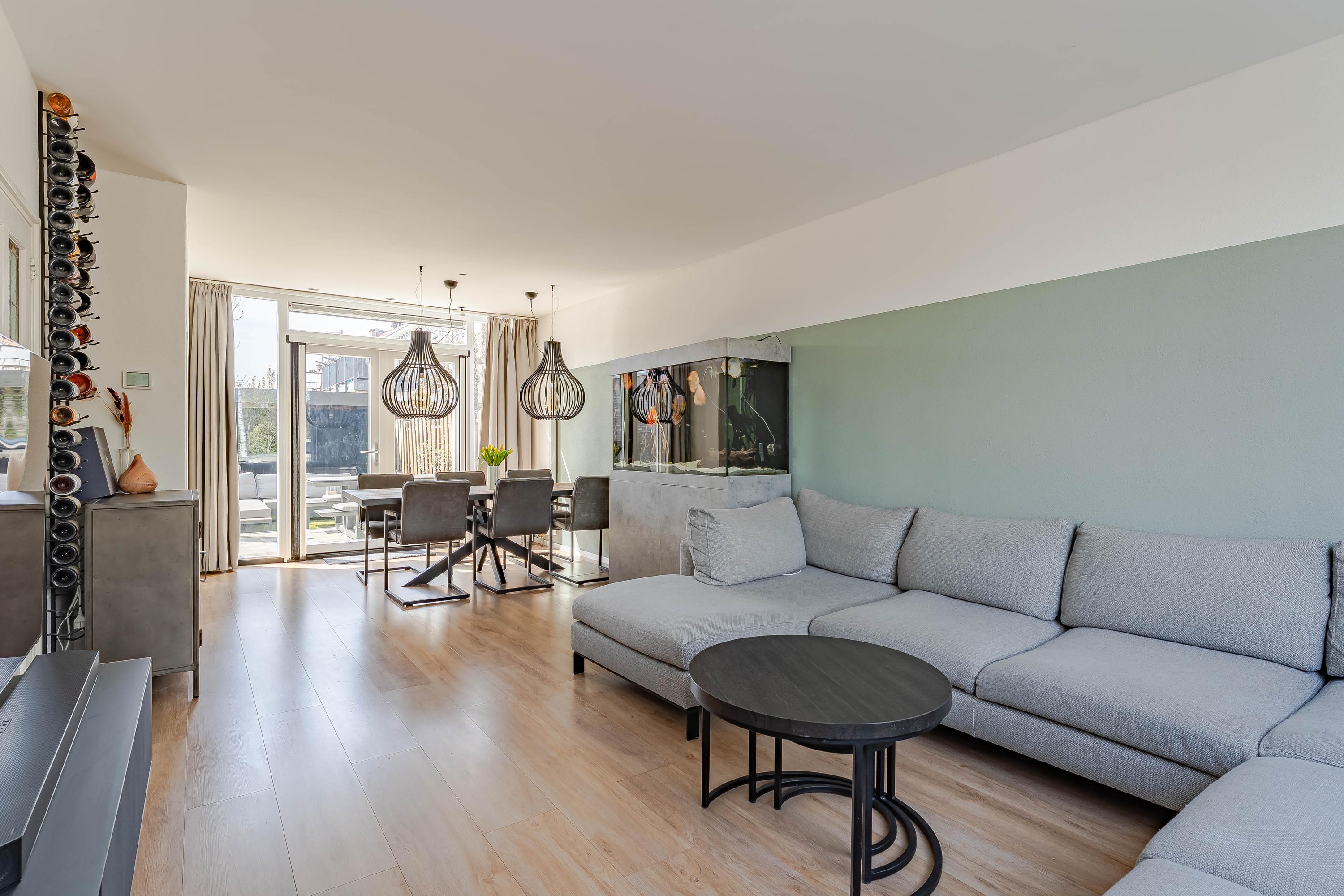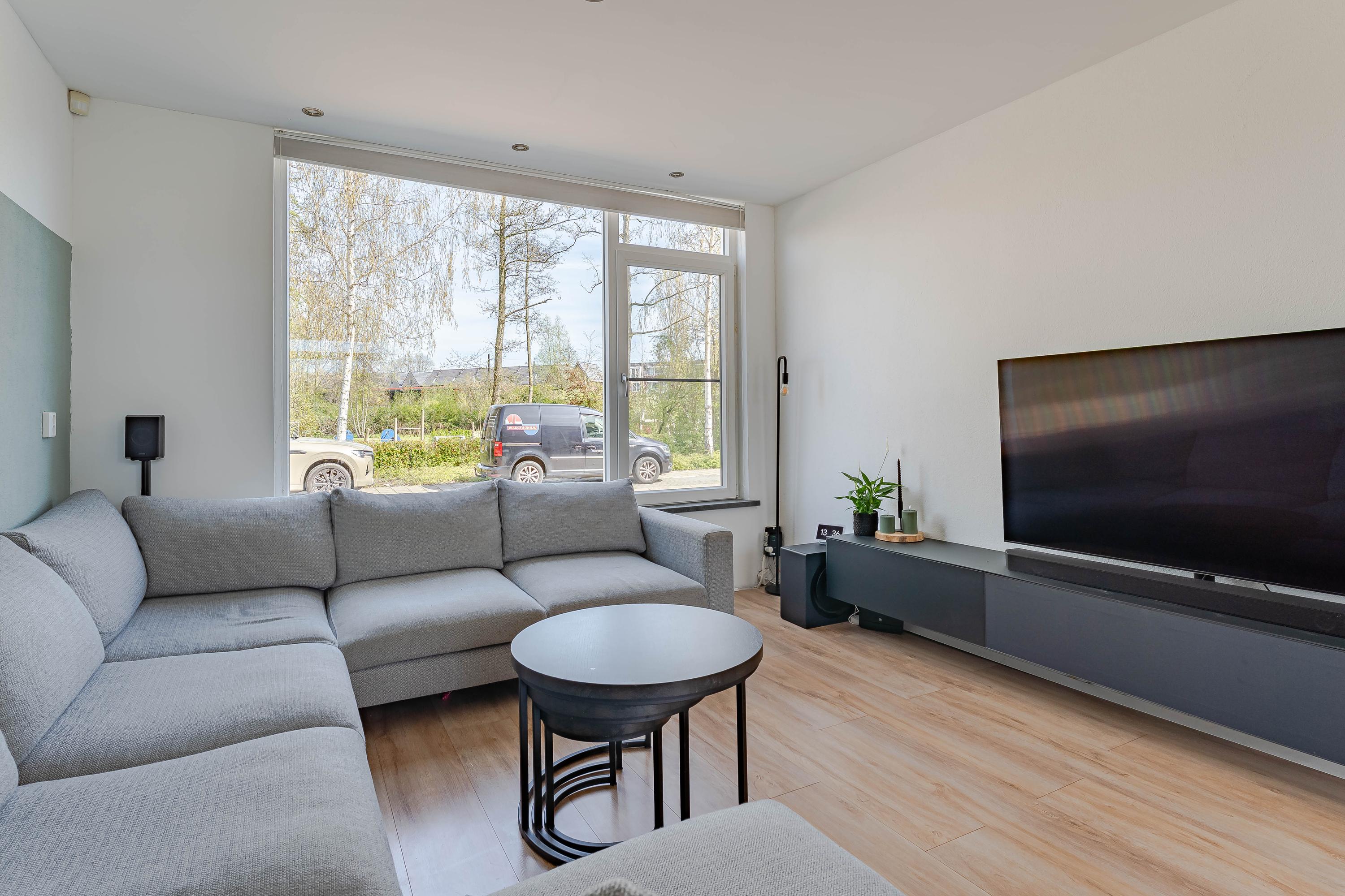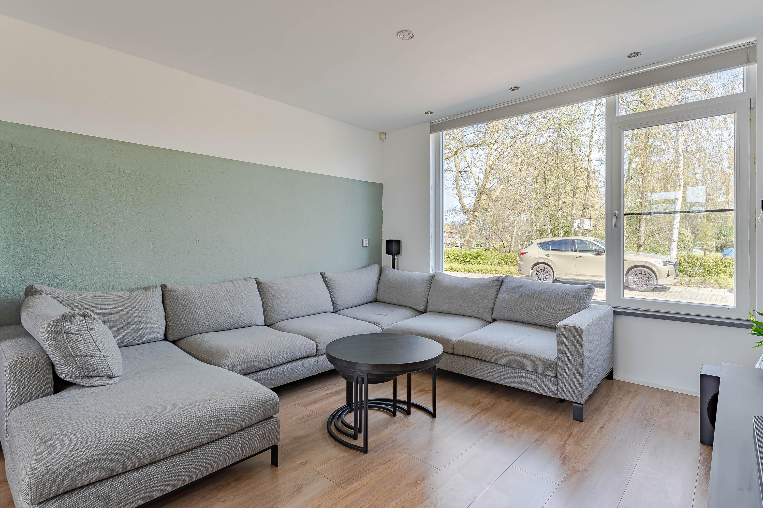 De woonkamer kijkt aan de voorzijde leuk uit over een groenstrook met speelveld. Op de vloer ligt laminaat en de wanden en plafonds zijn modern afgewerkt. Via de openslaande deuren bereikt u de tuin.