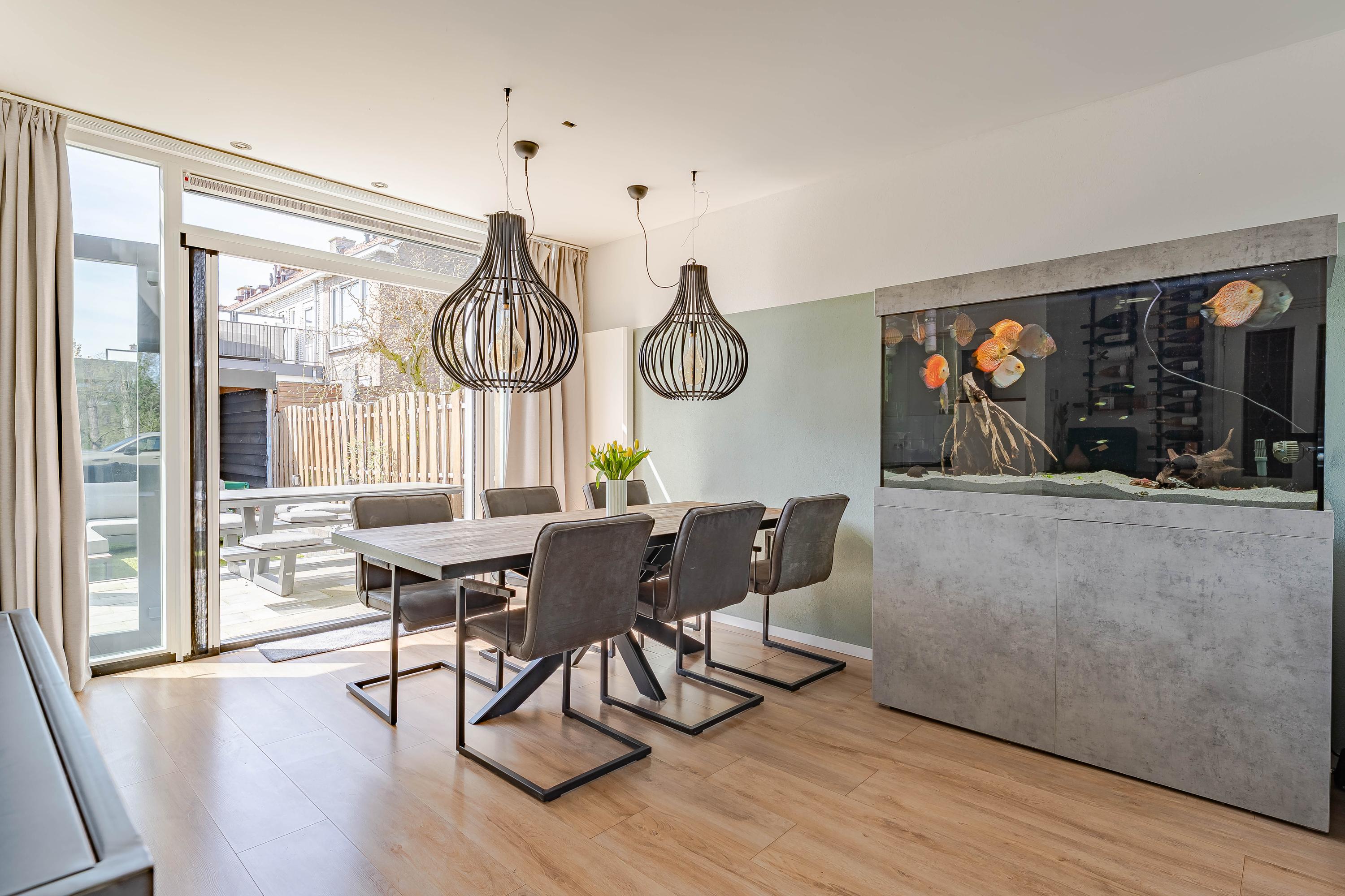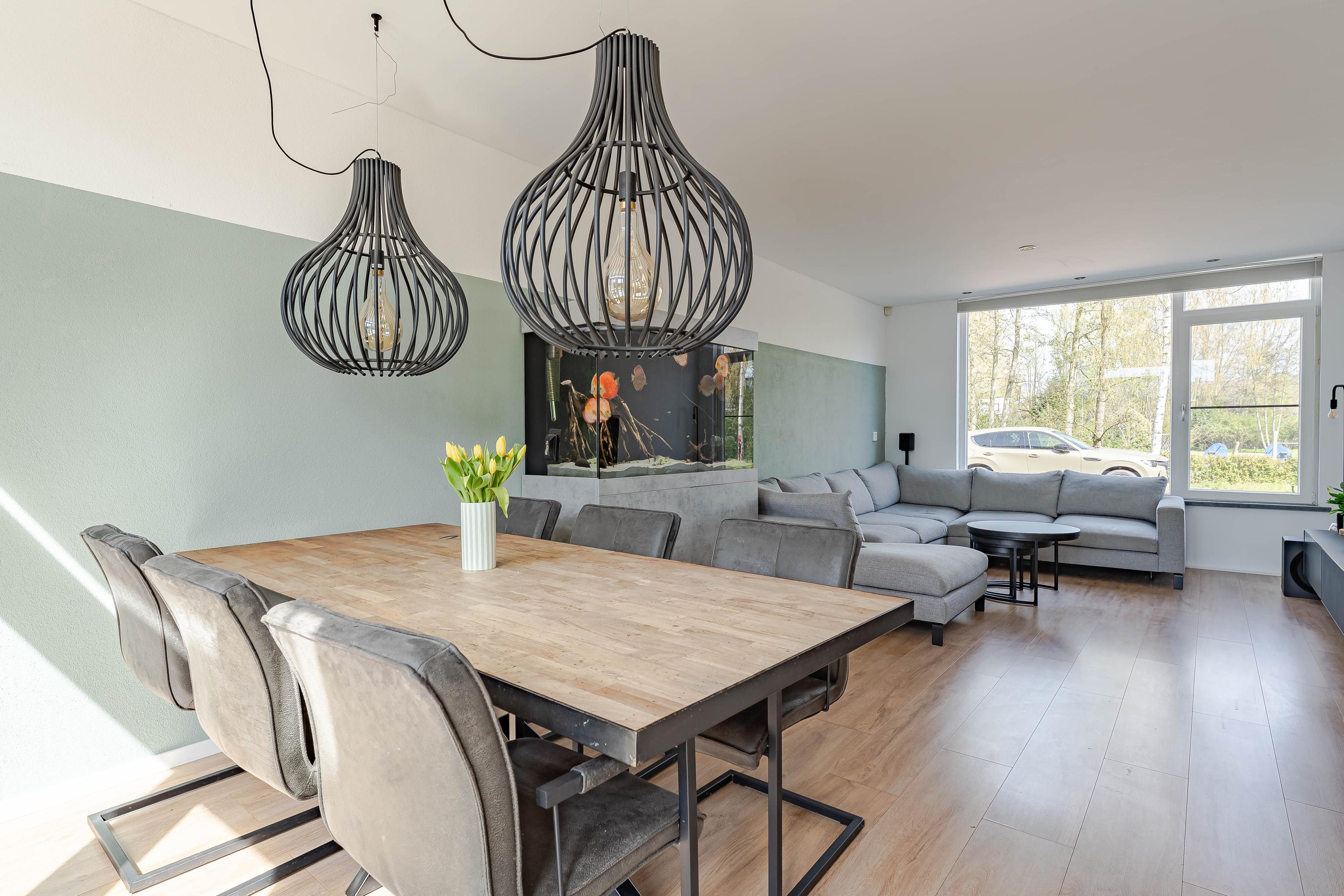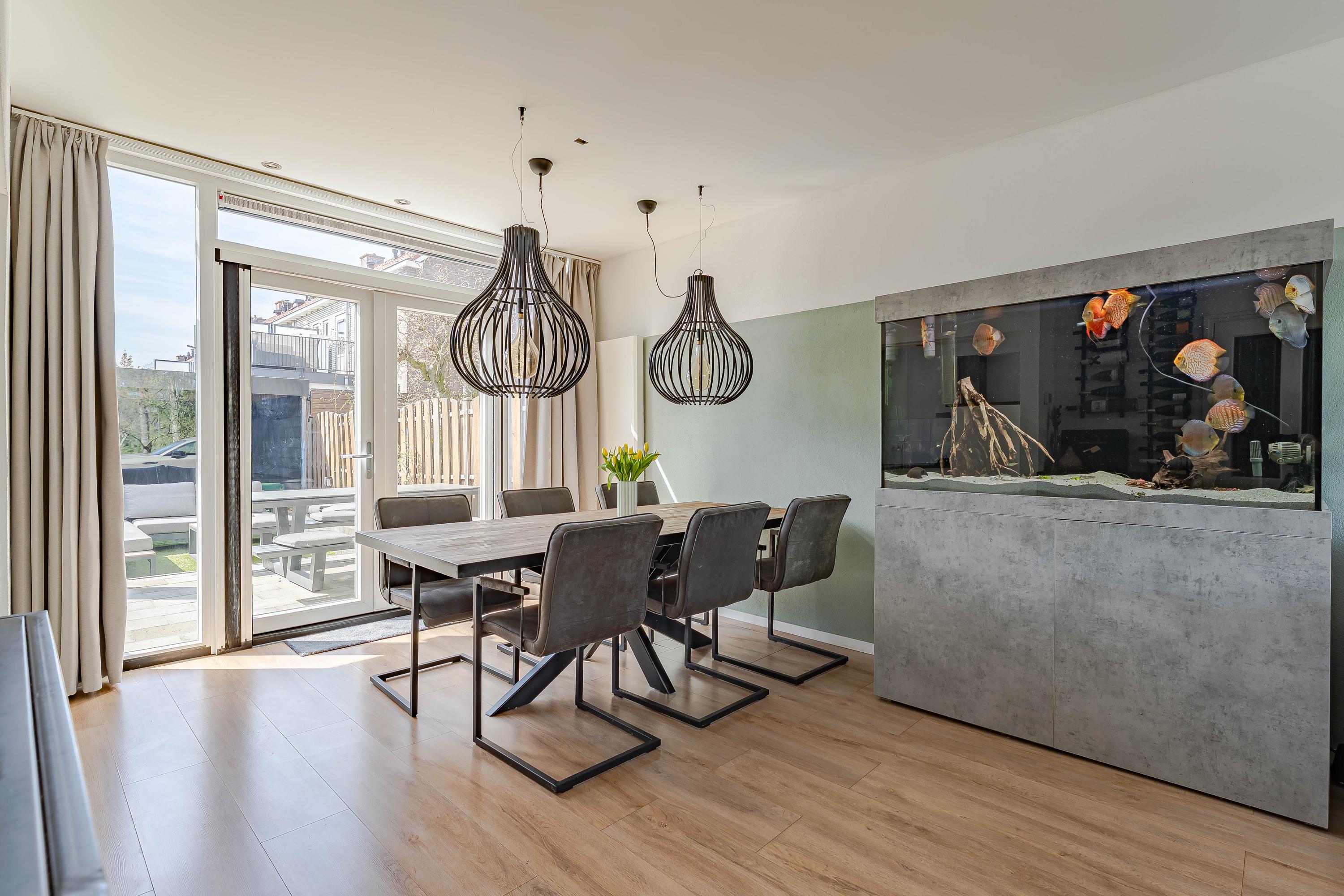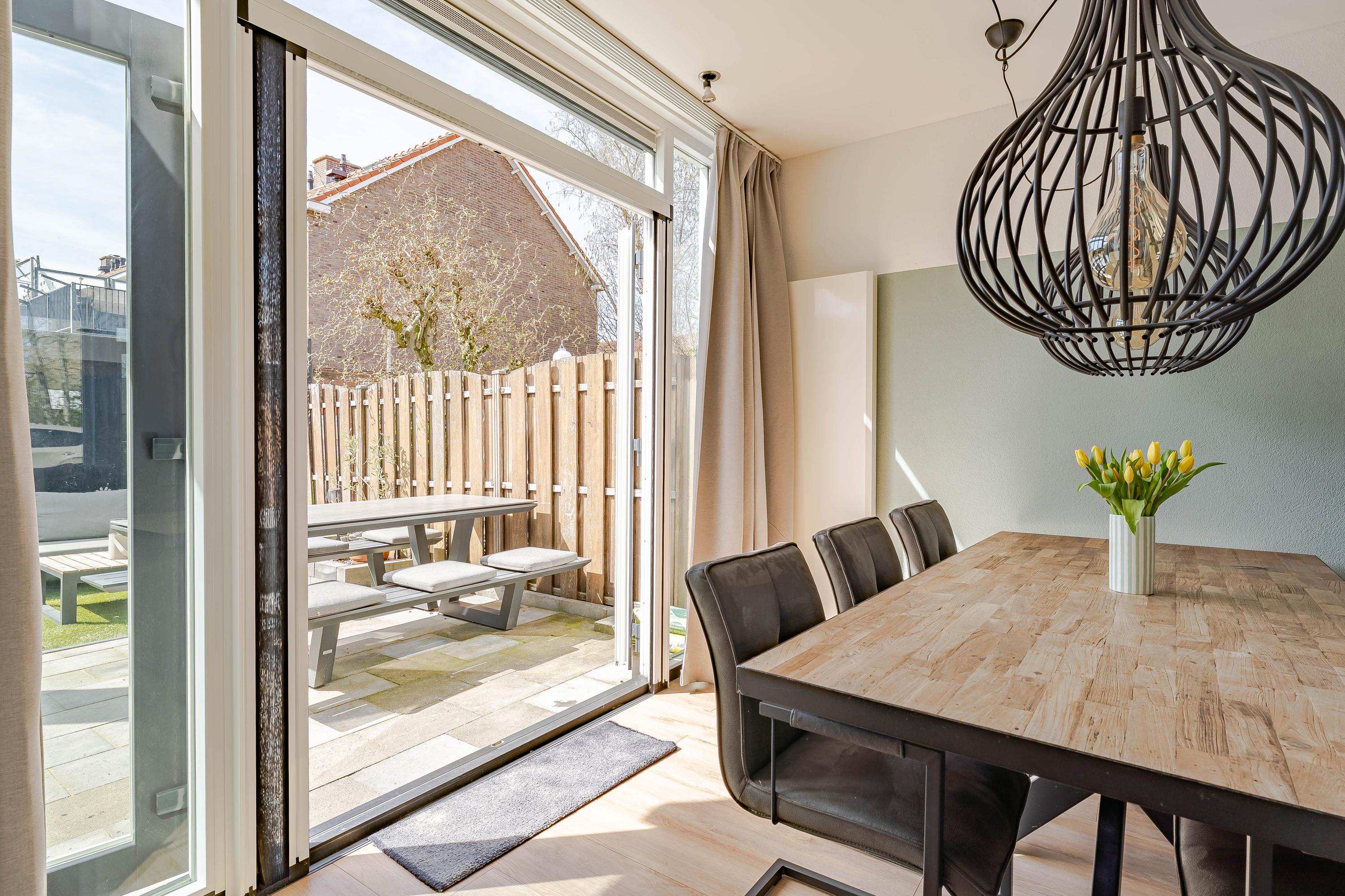 De woonkamer kijkt aan de voorzijde leuk uit over een groenstrook met speelveld. Op de vloer ligt laminaat en de wanden en plafonds zijn modern afgewerkt. Via de openslaande deuren bereikt u de tuin.