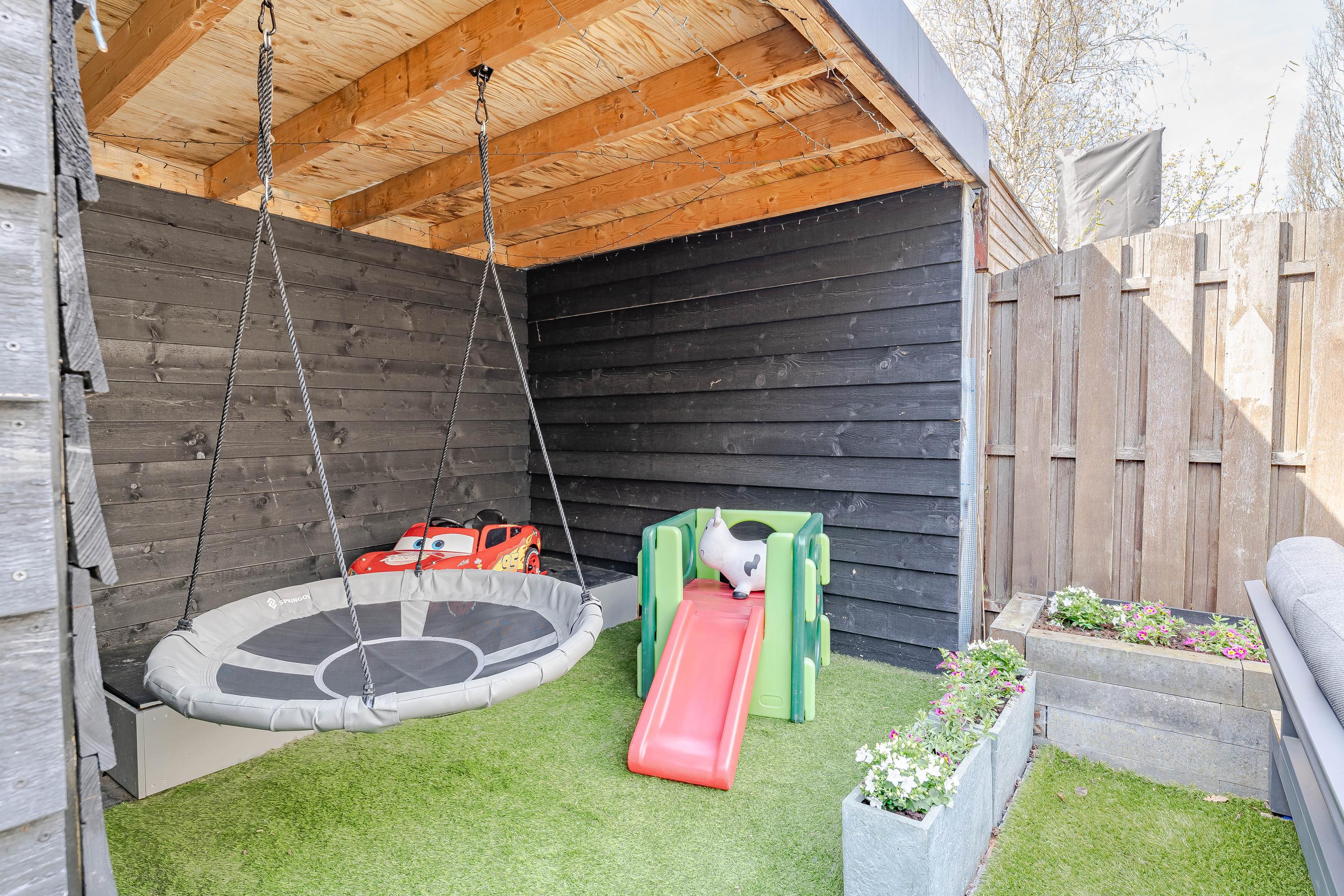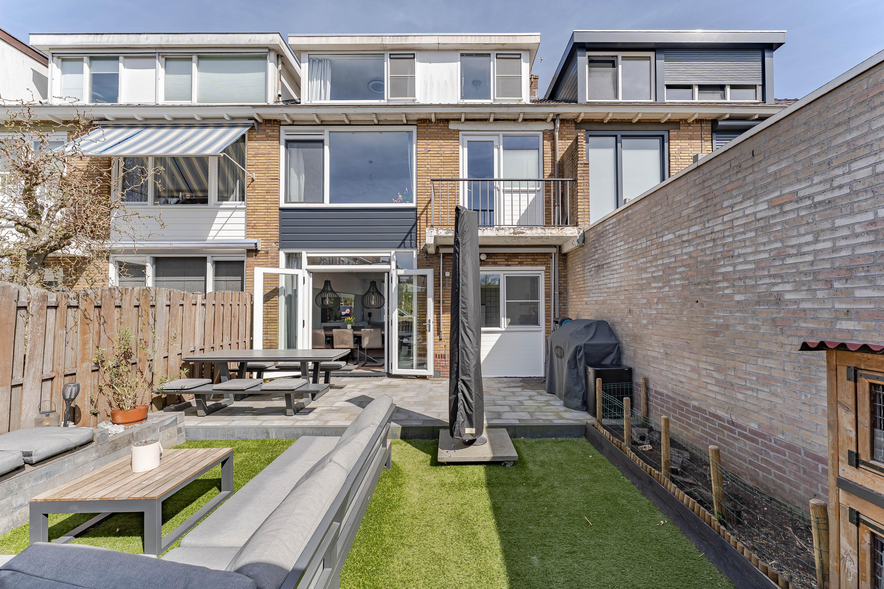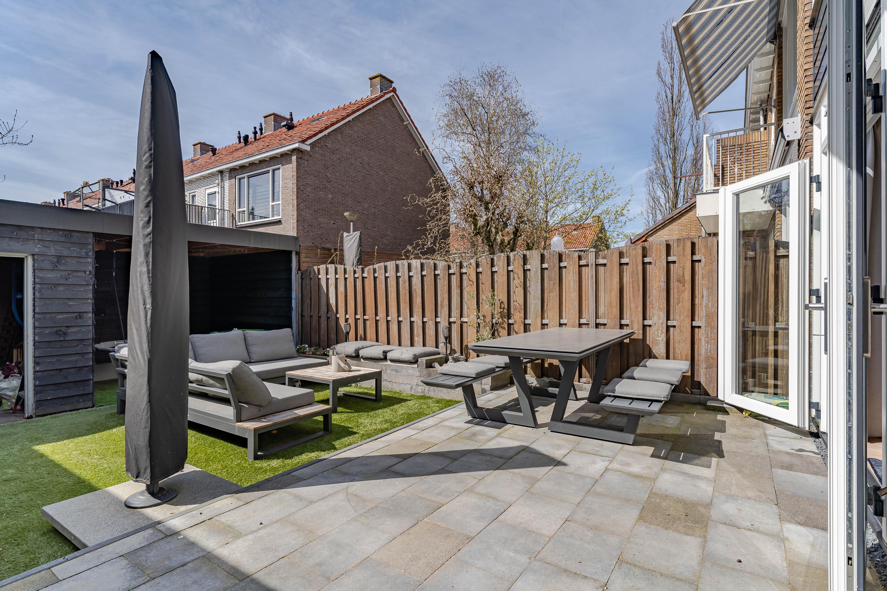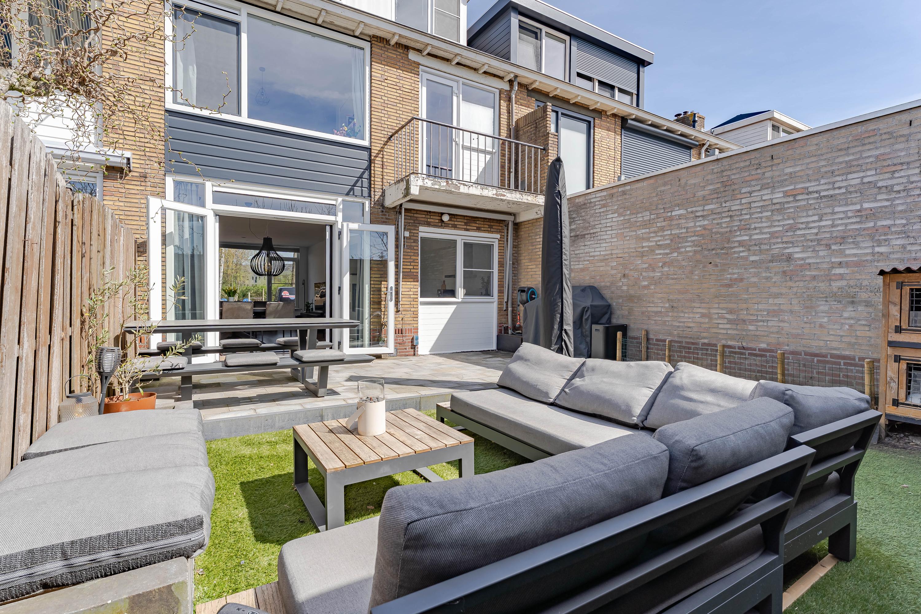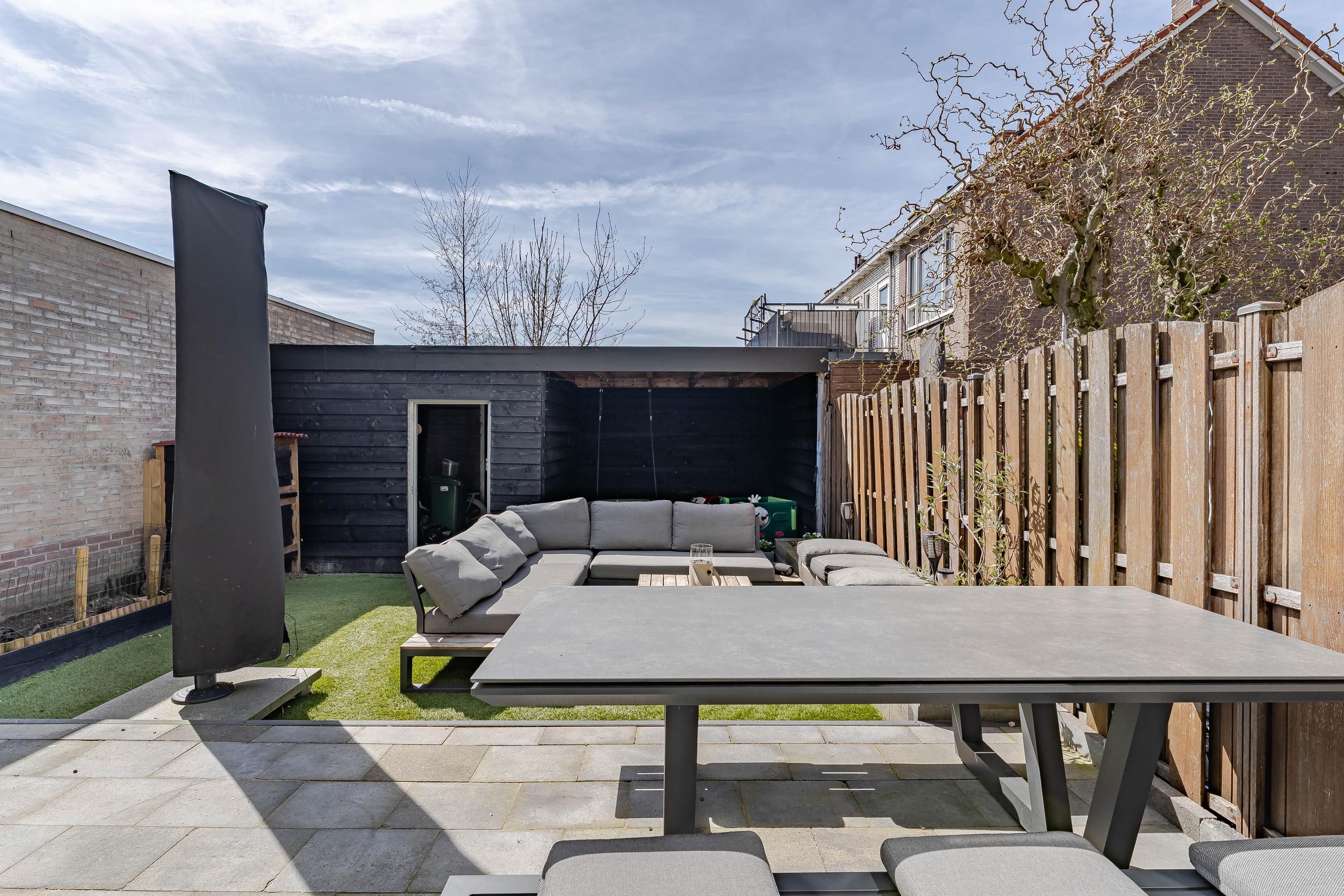 De zonnige tuin, gelegen op het zuidwesten, is in 2025 opnieuw aangelegd. Op het terras achter de woning en op het kunst grasveld kunt u tot in de late avonduren genieten van de zon. Achterin de tuin staat een houten berging met overkapping en er is een achterom.