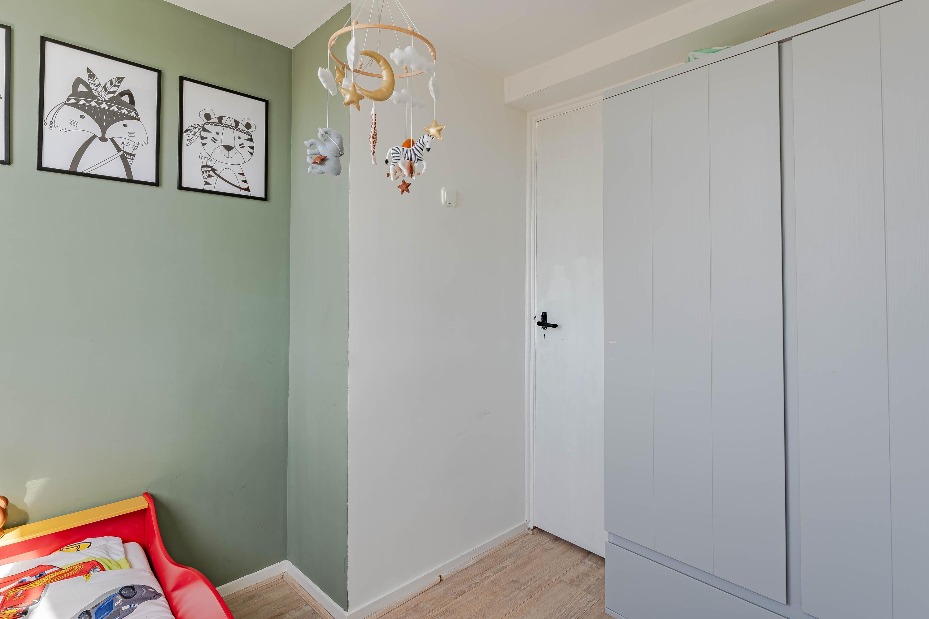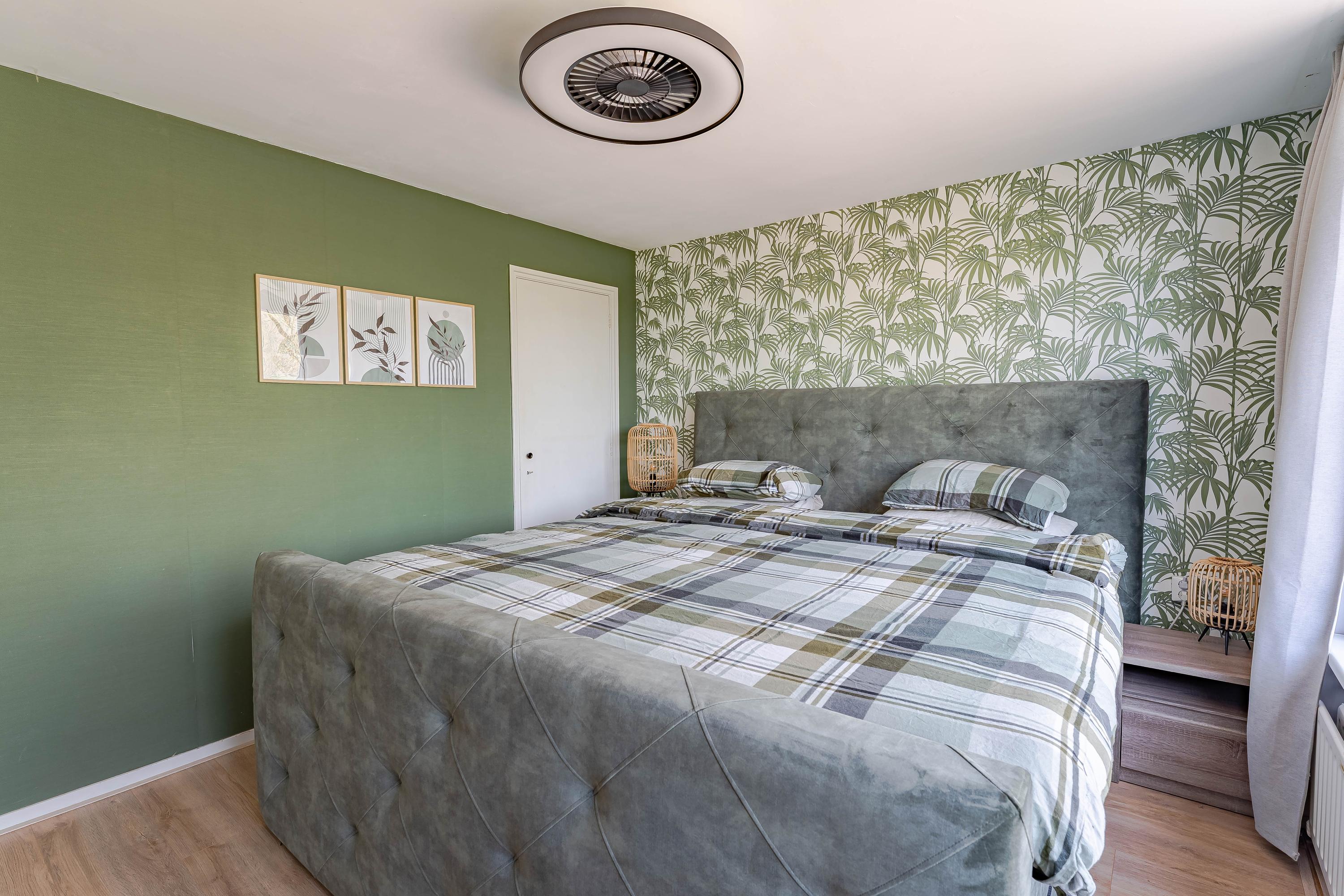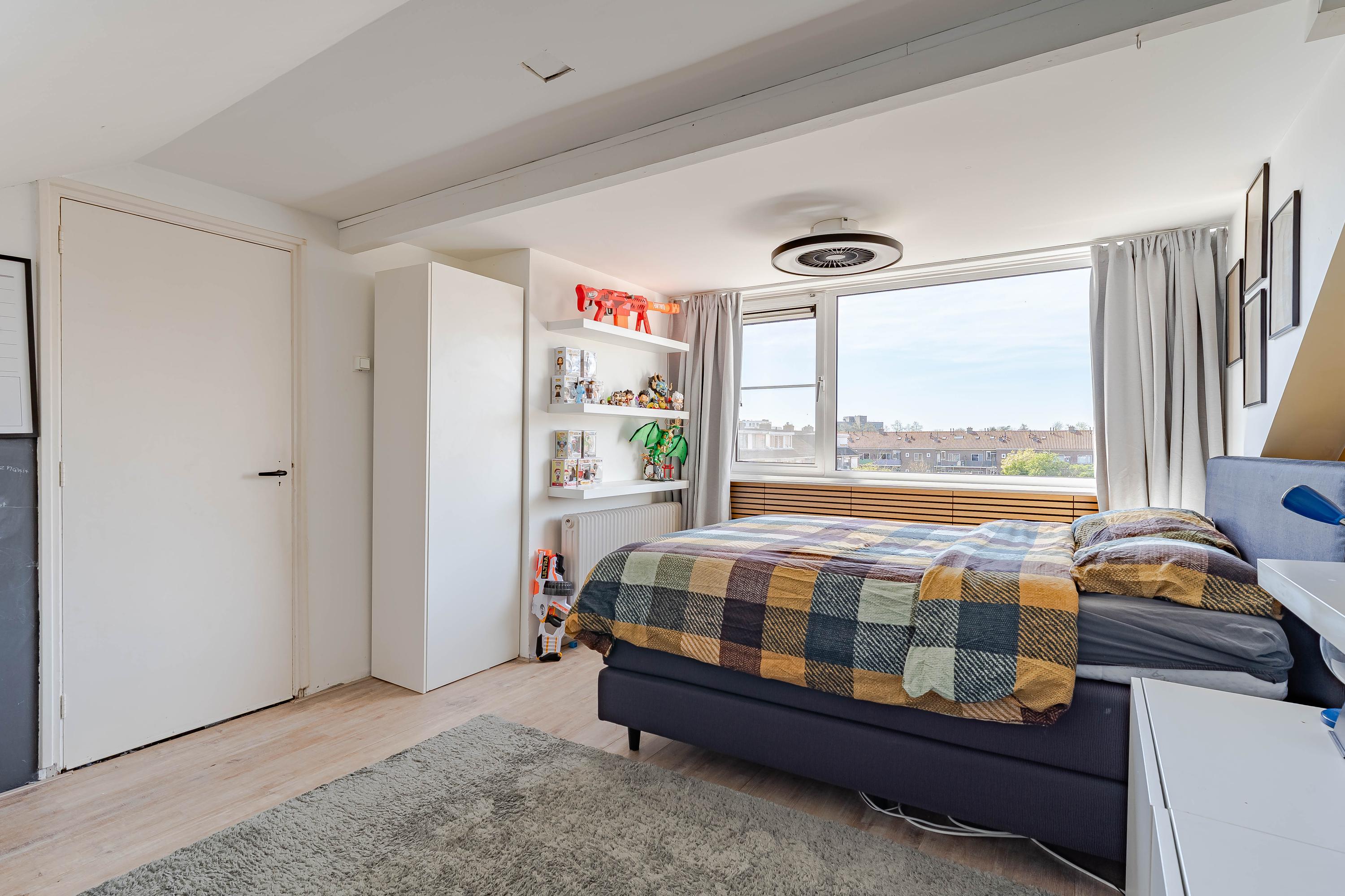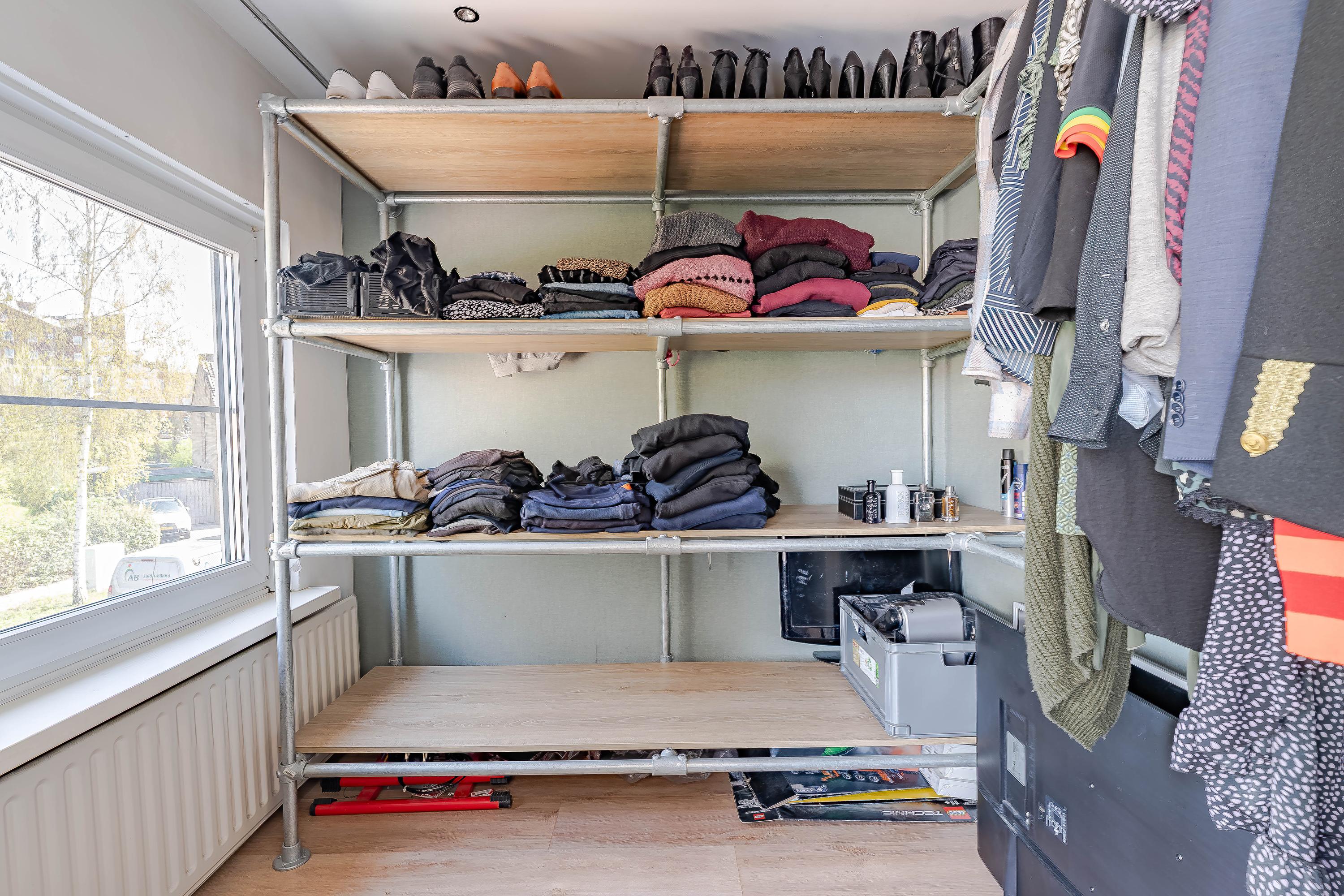 De slaapkamer aan de voorzijde is extra ruim doordat de voormalige badkamerruimte bij de slaapkamer is betrokken. Van deze ruimte is een inloopkast gemaakt.