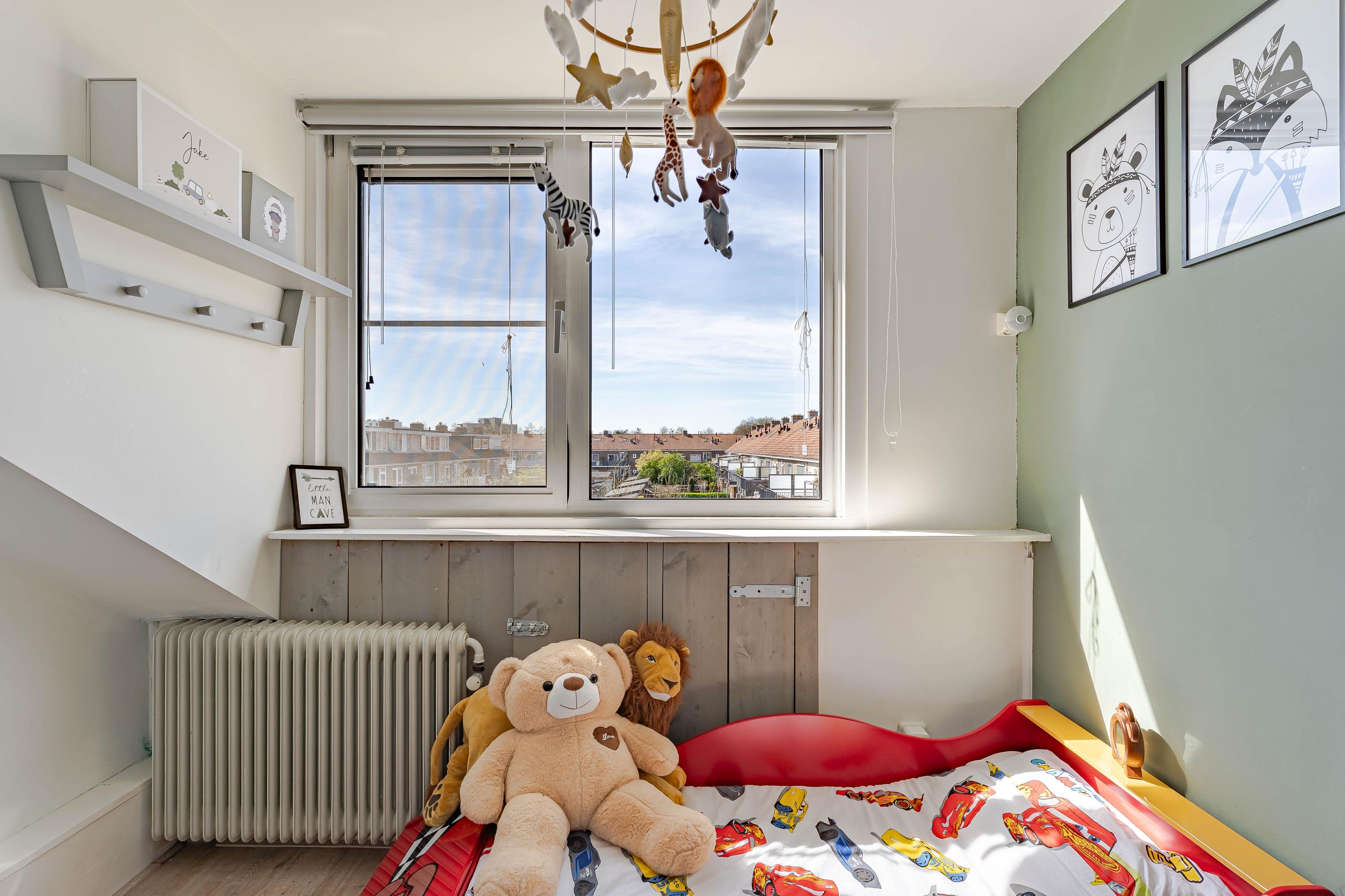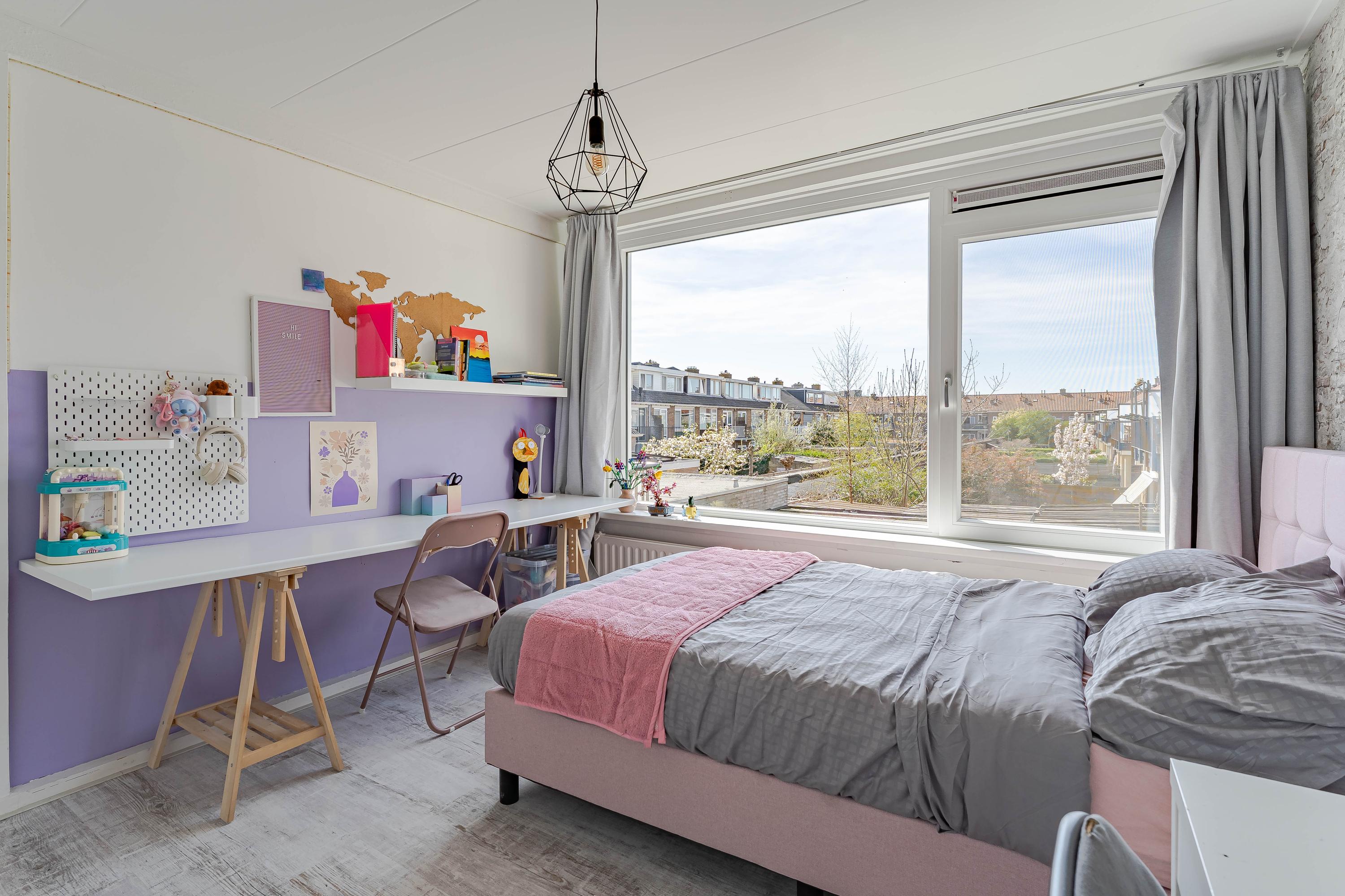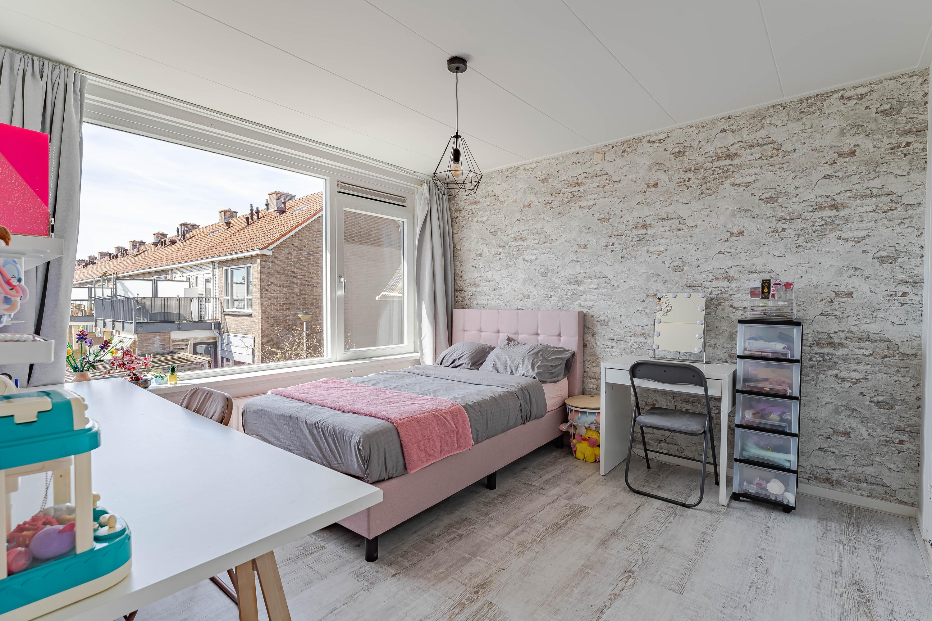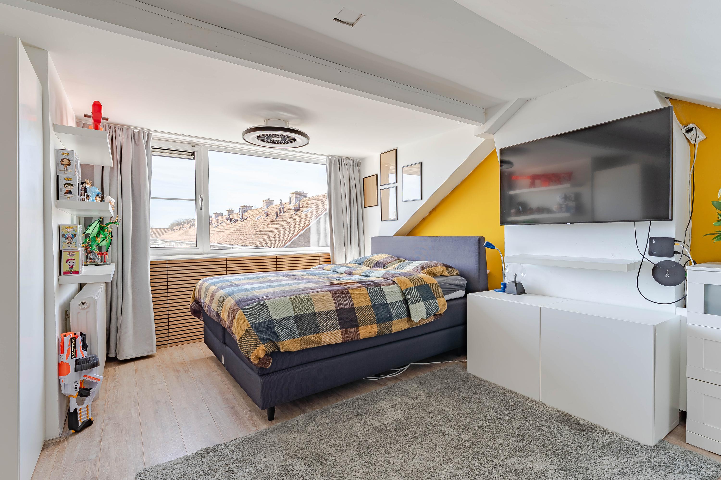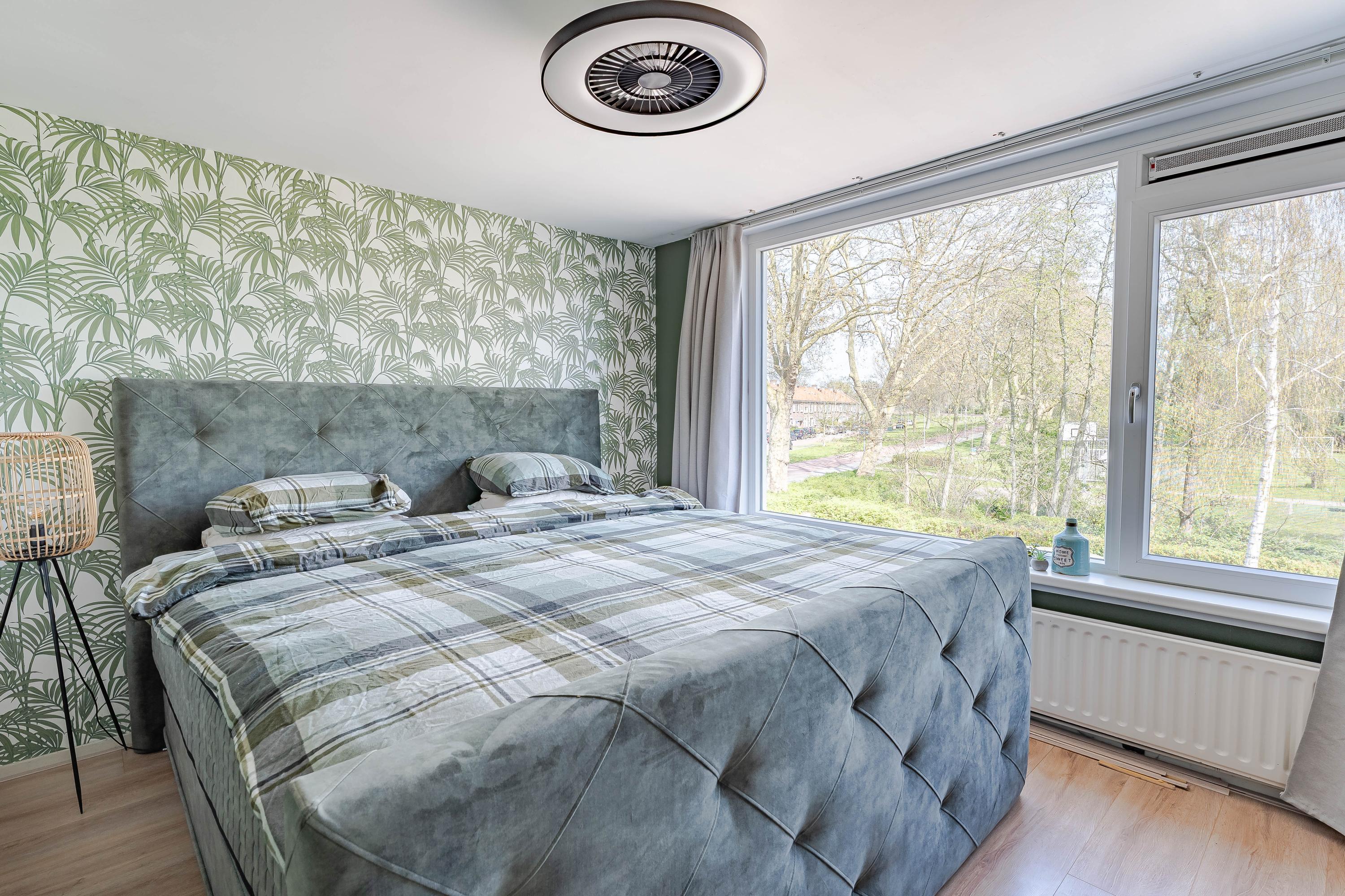 De slaapkamer aan de voorzijde is extra ruim doordat de voormalige badkamerruimte bij de slaapkamer is betrokken. Van deze ruimte is een inloopkast gemaakt.