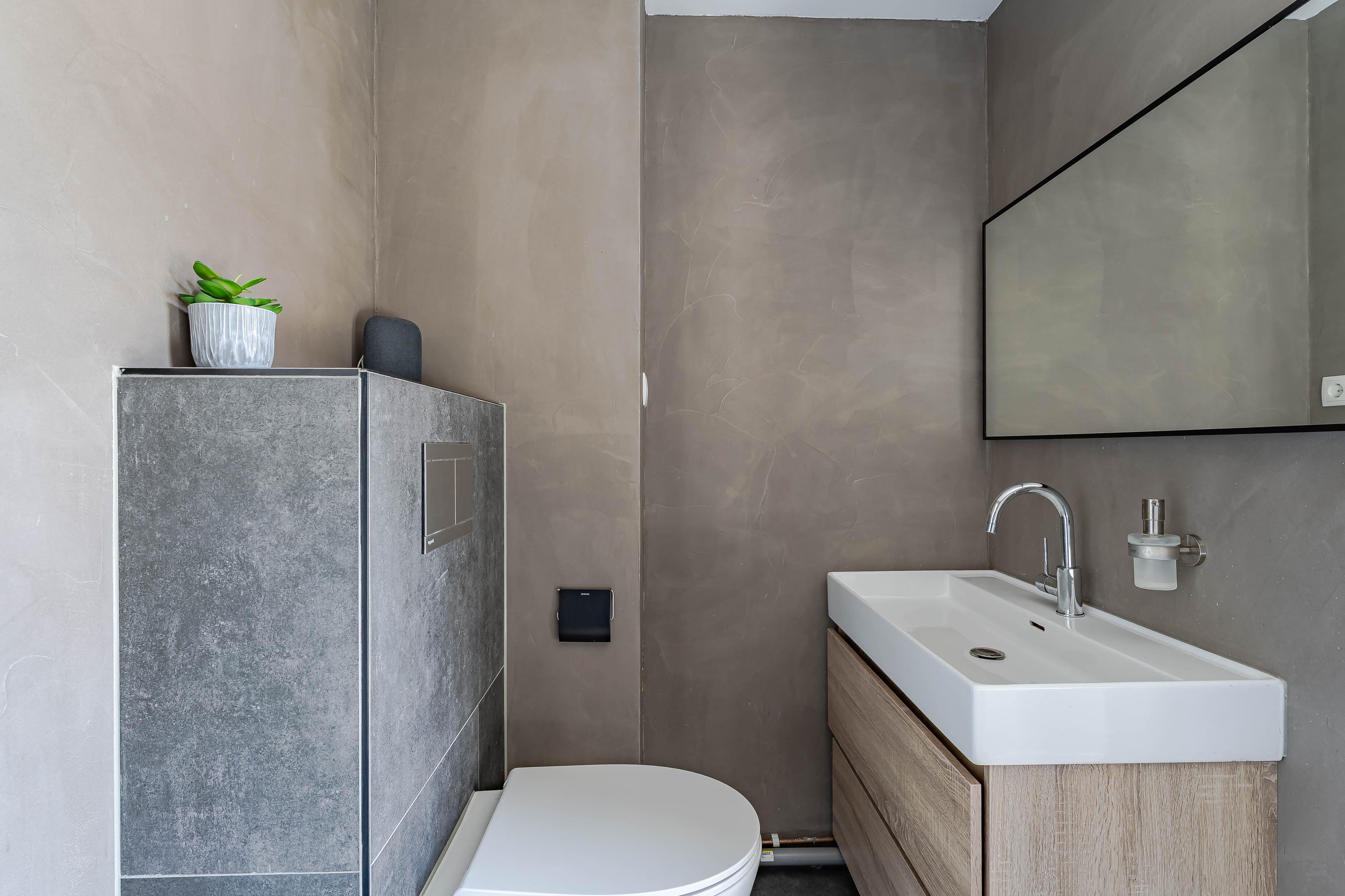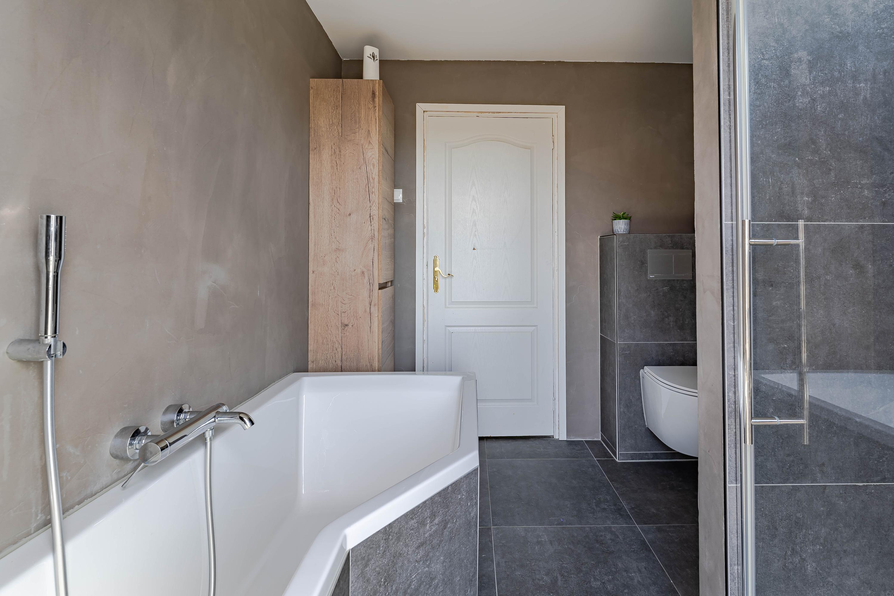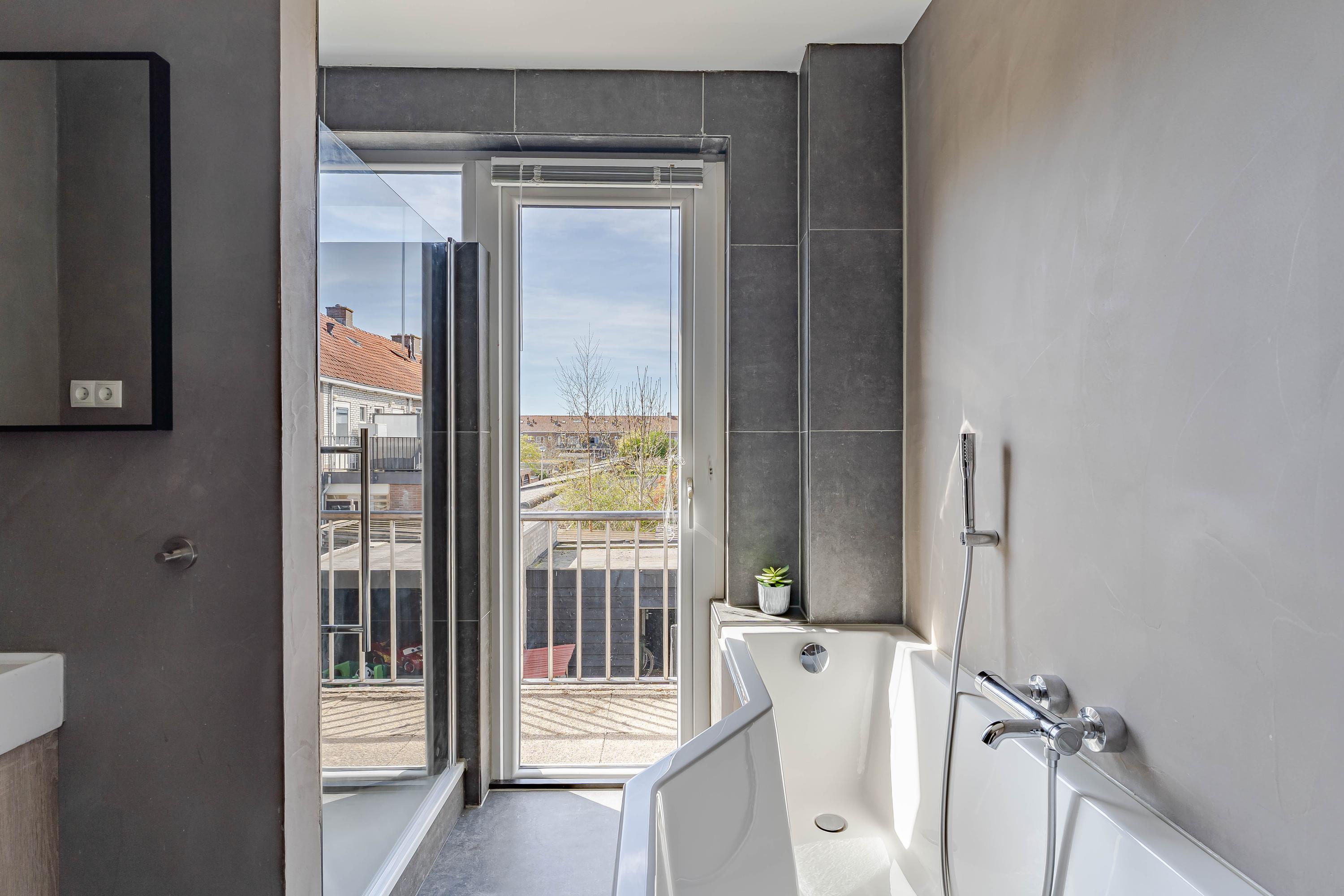 Aan de achterzijde van de woning bevindt zich de tweede slaapkamer met vaste kastruimte en de badkamer met toegang tot het balkon. De badkamer is in 2022 vernieuwd met een ligbad, douche, toilet en wastafel met meubel.