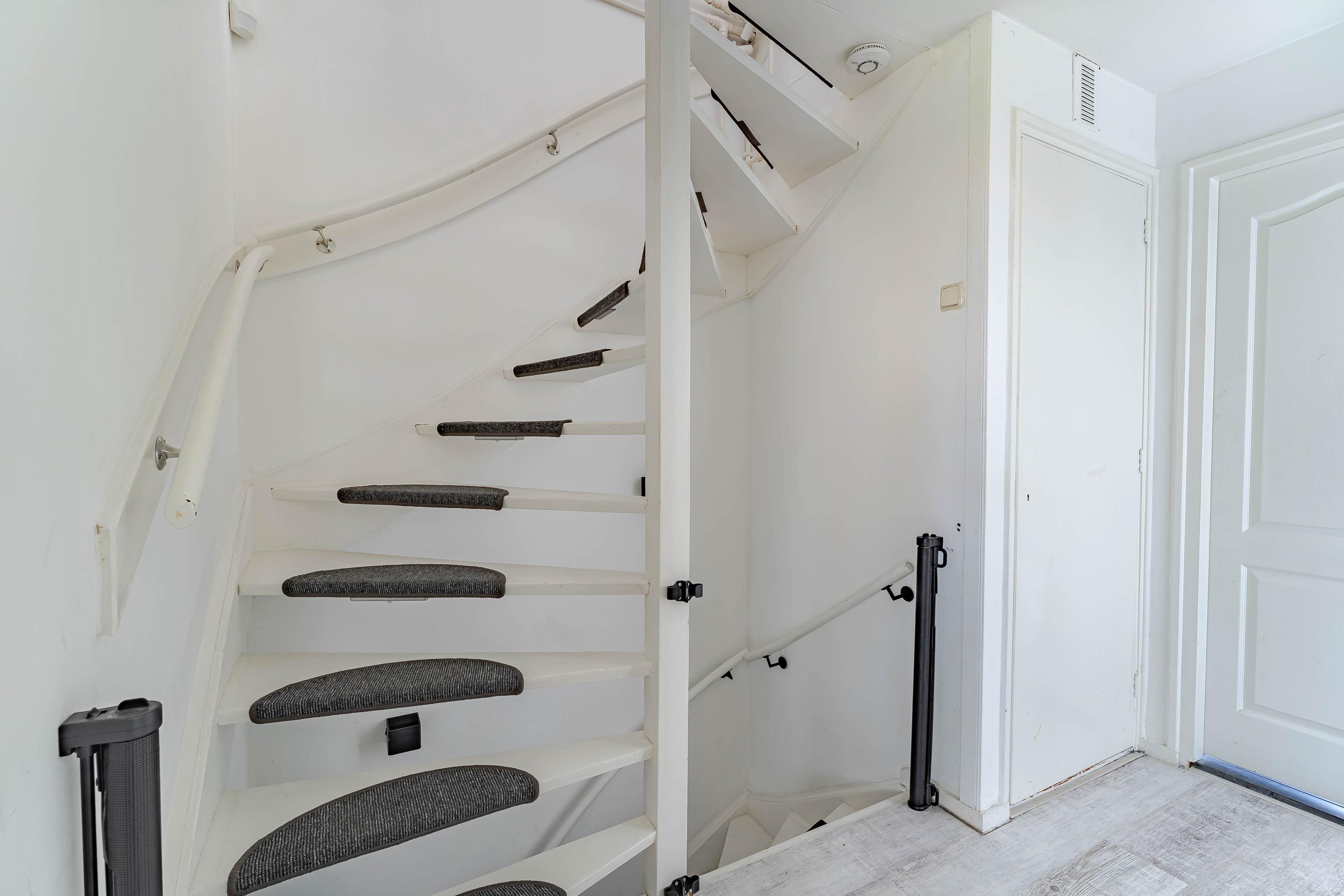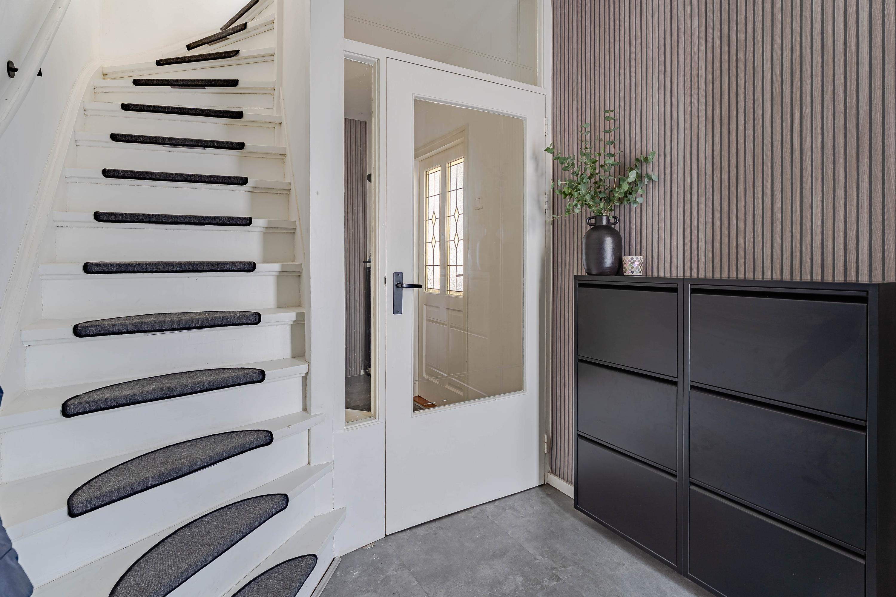 Entree met vernieuwde meterkast en de trap naar de eerste verdieping. Via de tussendeur komt u in de hal met trapkast, modern vernieuwd toilet en de lichte woonkamer met halfopen keuken.