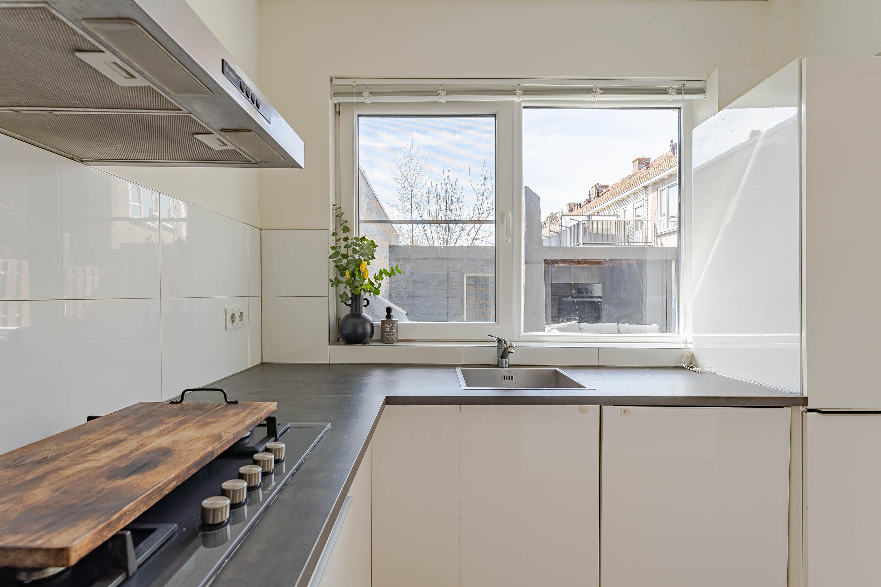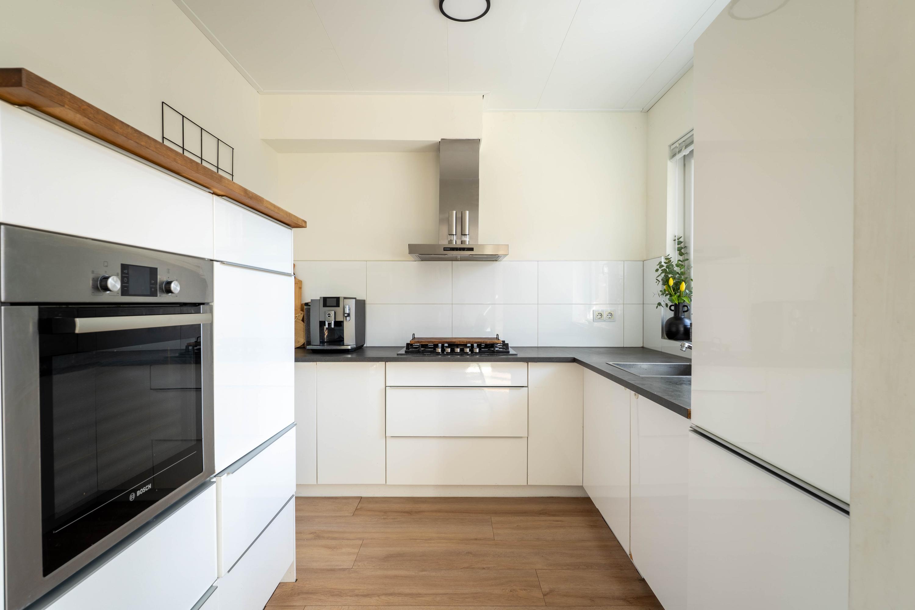 De moderne keuken is voorzien van voldoende kastruimte en de volgende inbouwapparatuur: vaatwasser, koelkast, vriezer, oven, gaskookplaat en een afzuigkap.