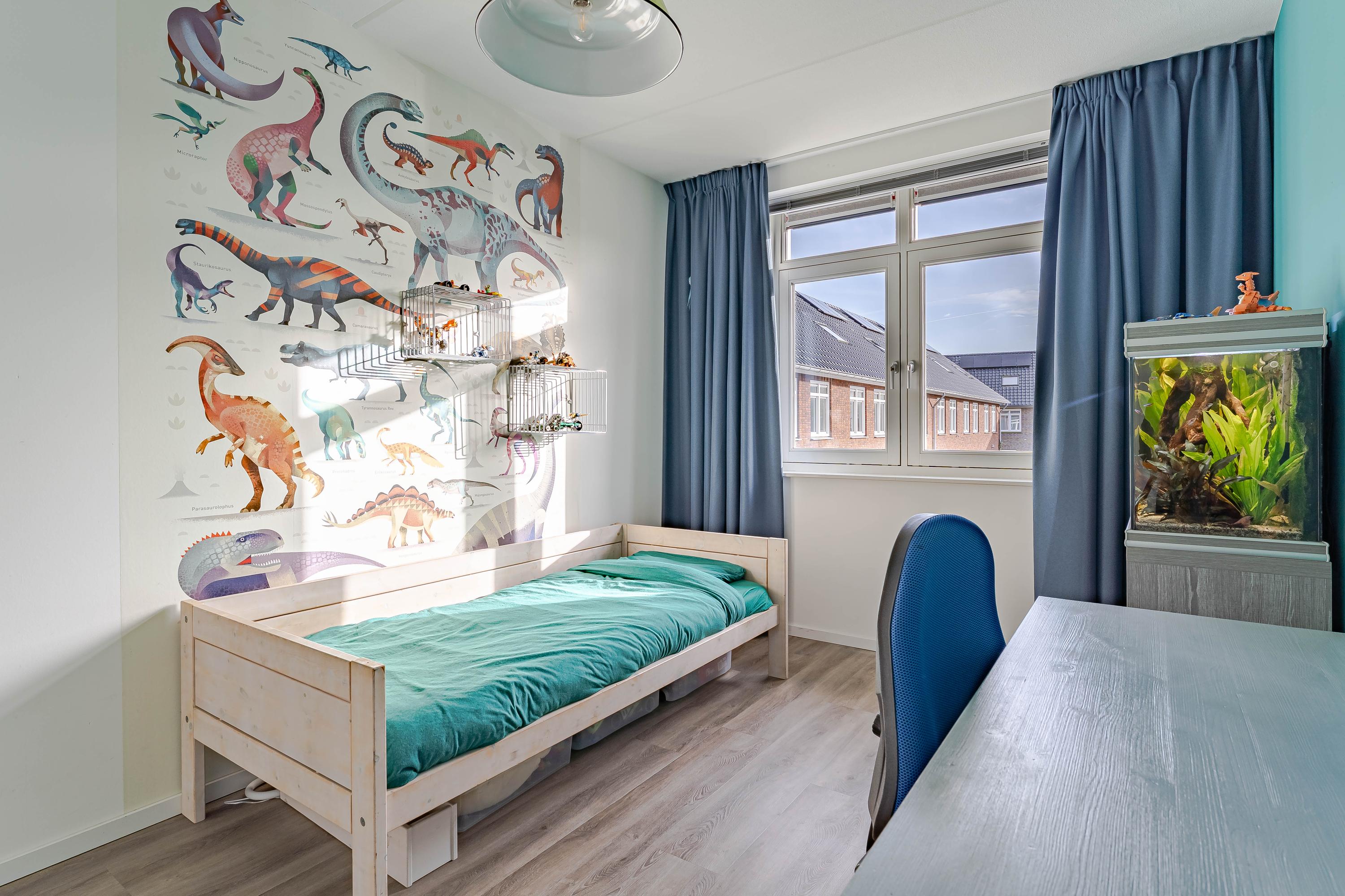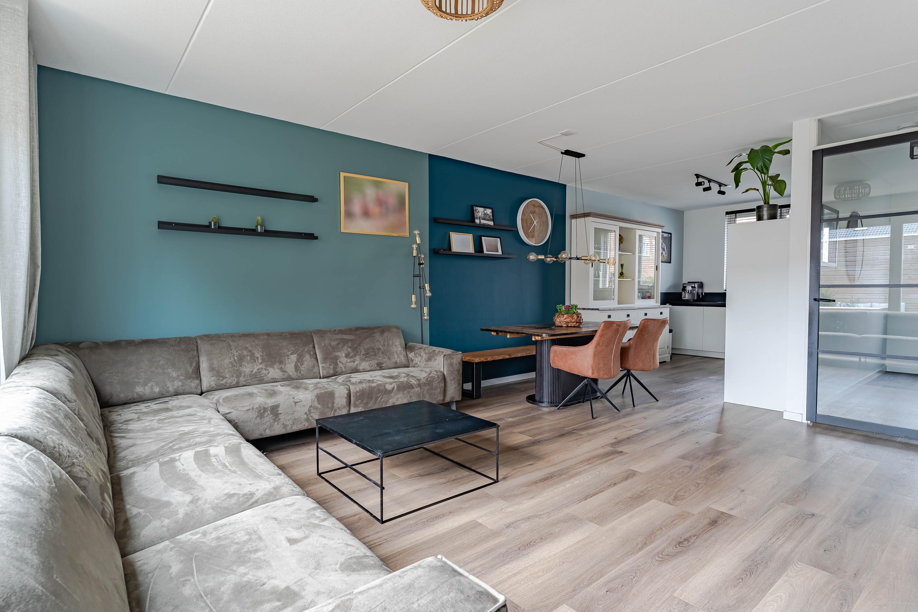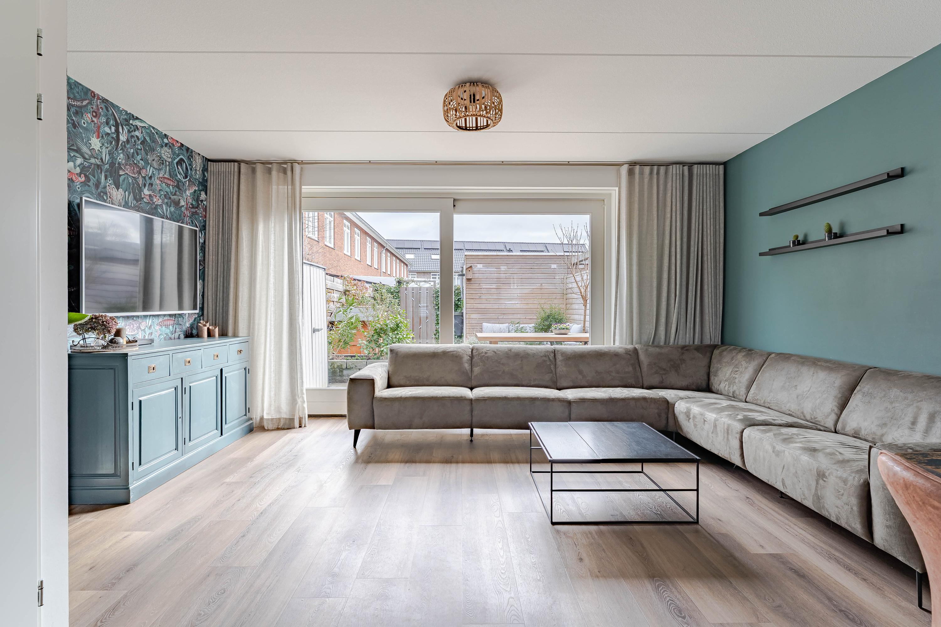 De woonkamer is een fijne ruimte. Er is een trapkast aanwezig en een schuifpui biedt toegang naar de op het oosten gelegen achtertuin. Tevens zorgt de brede schuifpui voor veel lichtinval.