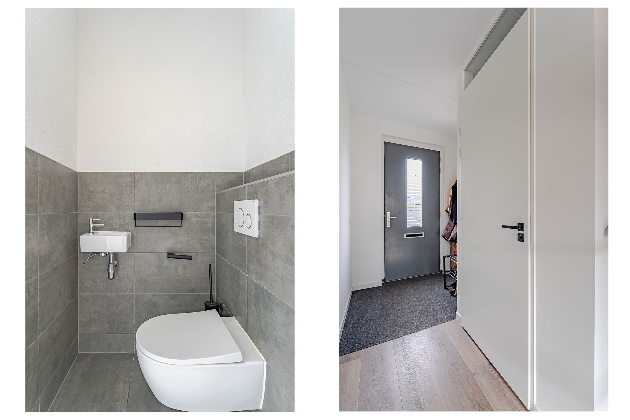 Begane grond: U komt binnen in de hal, die meer dan voldoende ruimte biedt om jassen en tassen op te hangen. Vanuit de hal is er toegang tot de trapopgang naar de eerste verdieping en de half betegelde toiletruimte, die voorzien is van een zwevend toilet en fonteintje.