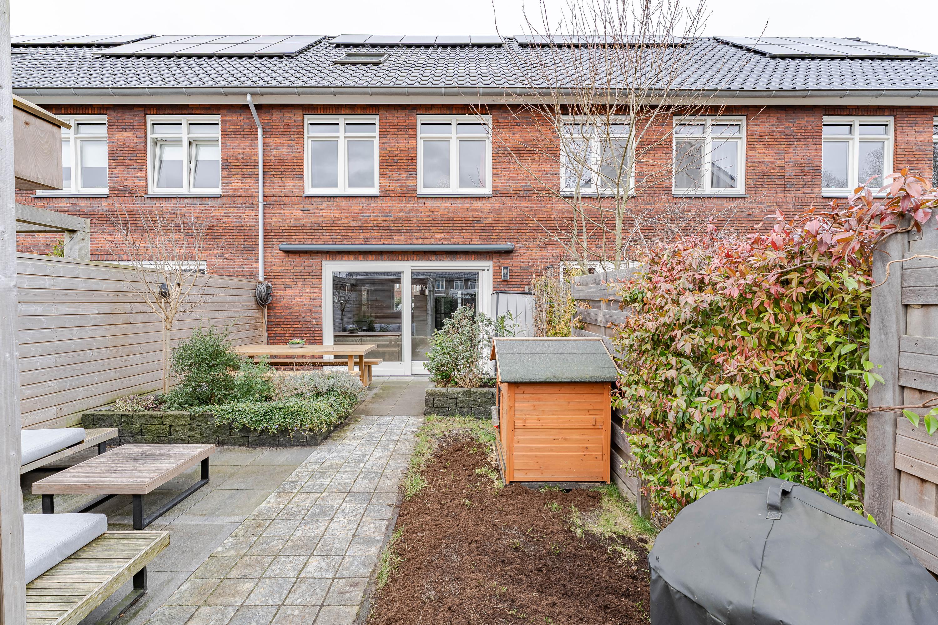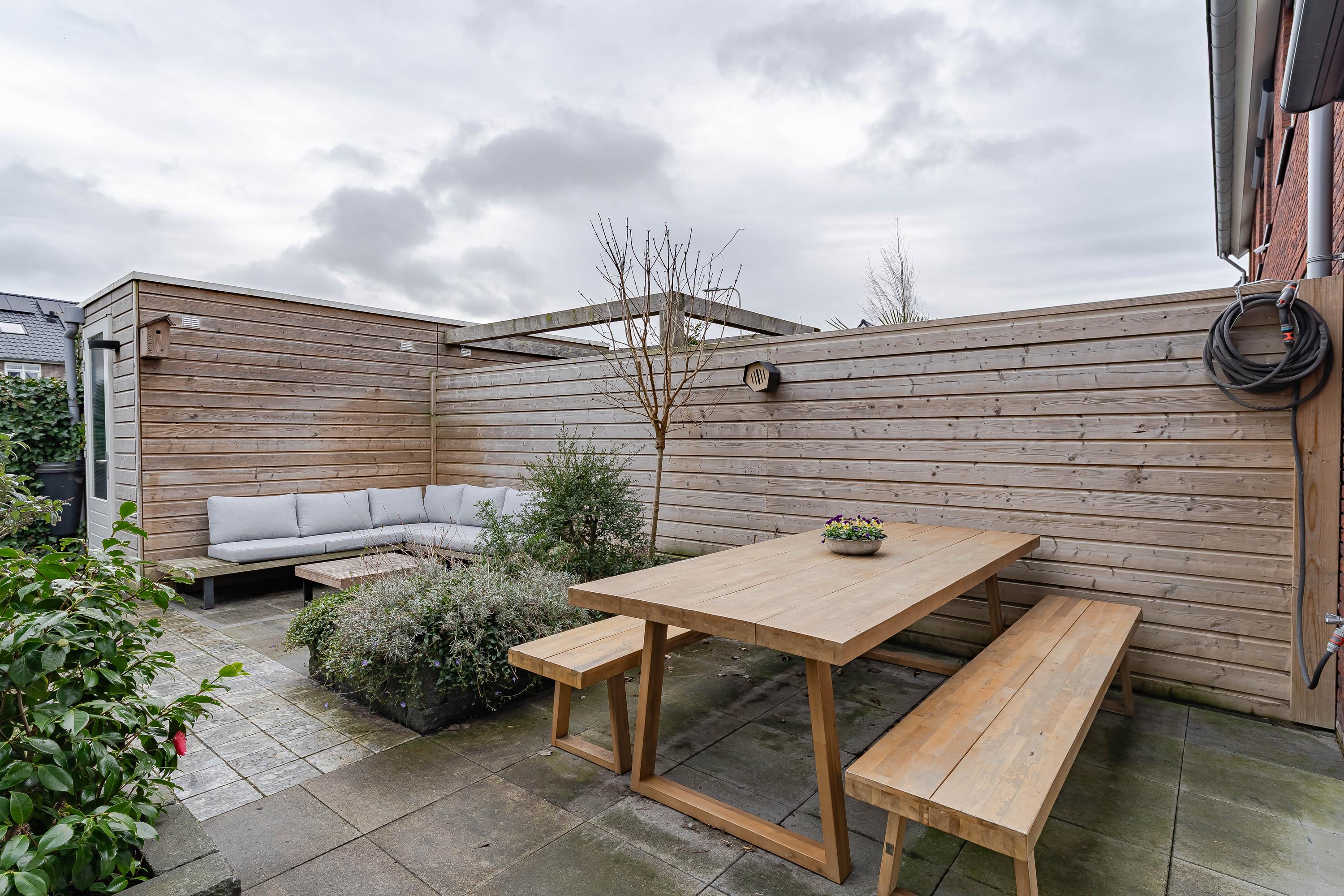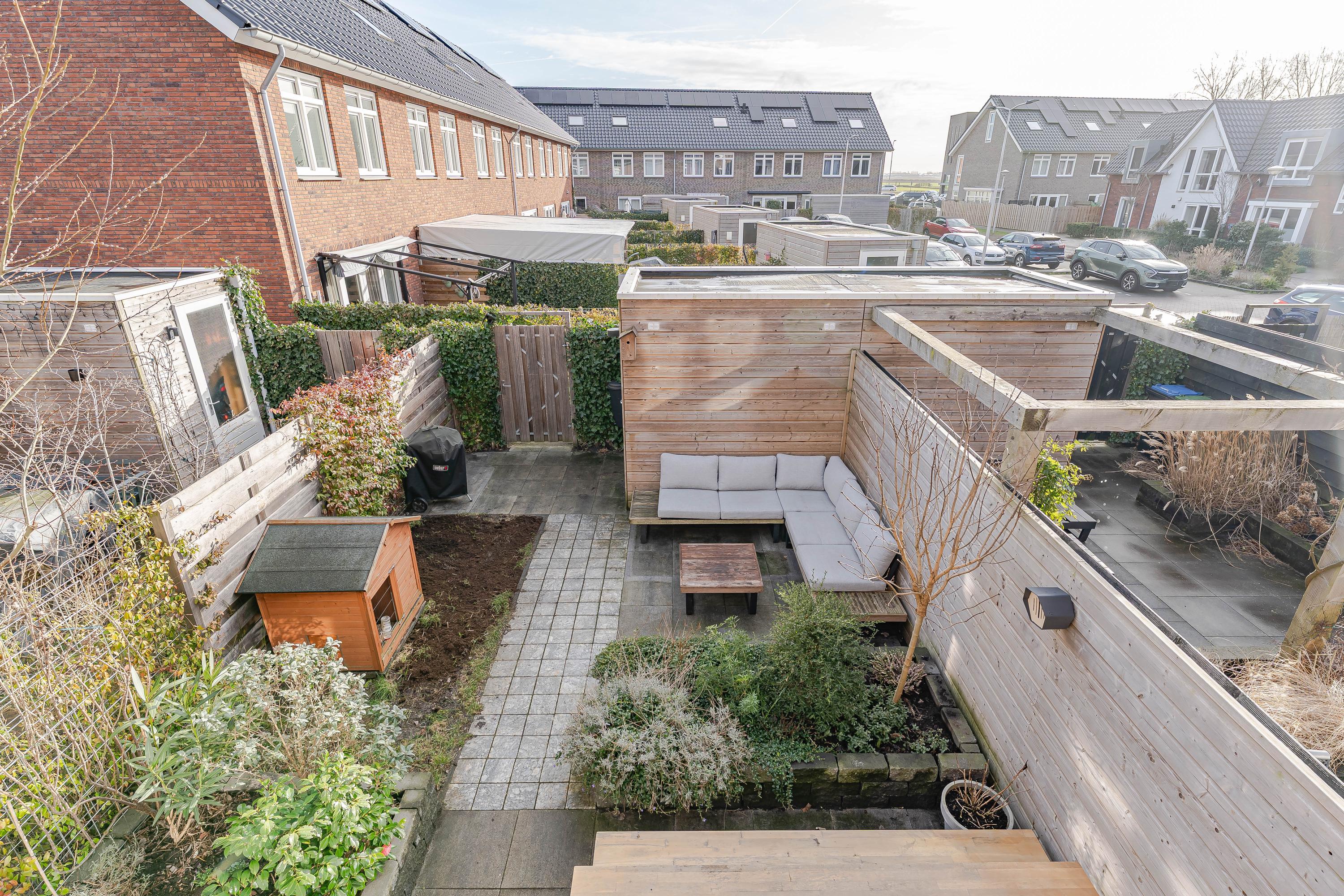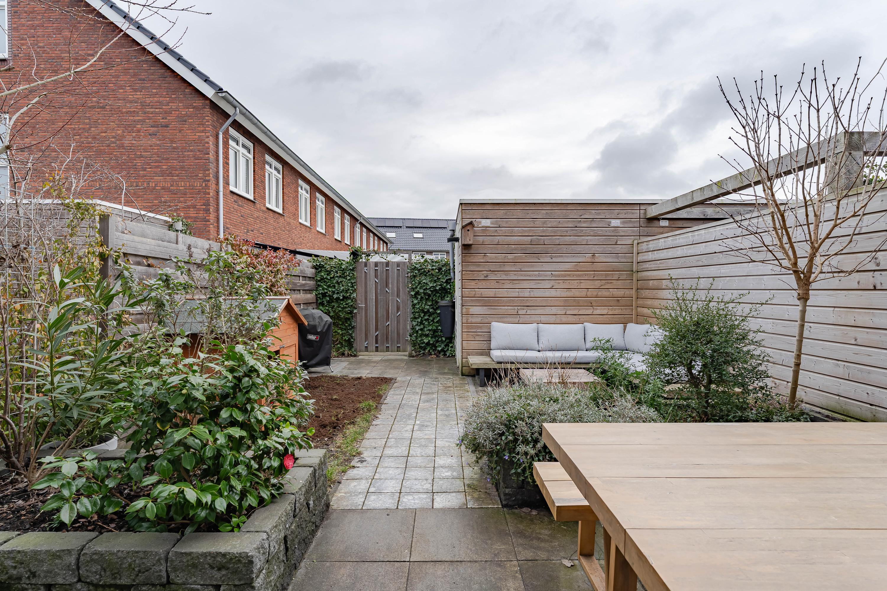 De op het oosten gelegen tuin is circa 9 meter diep, is divers aangelegd en vormt de perfecte plek om te ontspannen of gezellige momenten door te brengen. Achterin de tuin vindt u een houten berging met elektriciteitsaansluiting. Of u nu geniet van de ochtendzon met een kop koffie of 's avonds een drankje met vrienden, hier is het altijd fijn vertoeven.