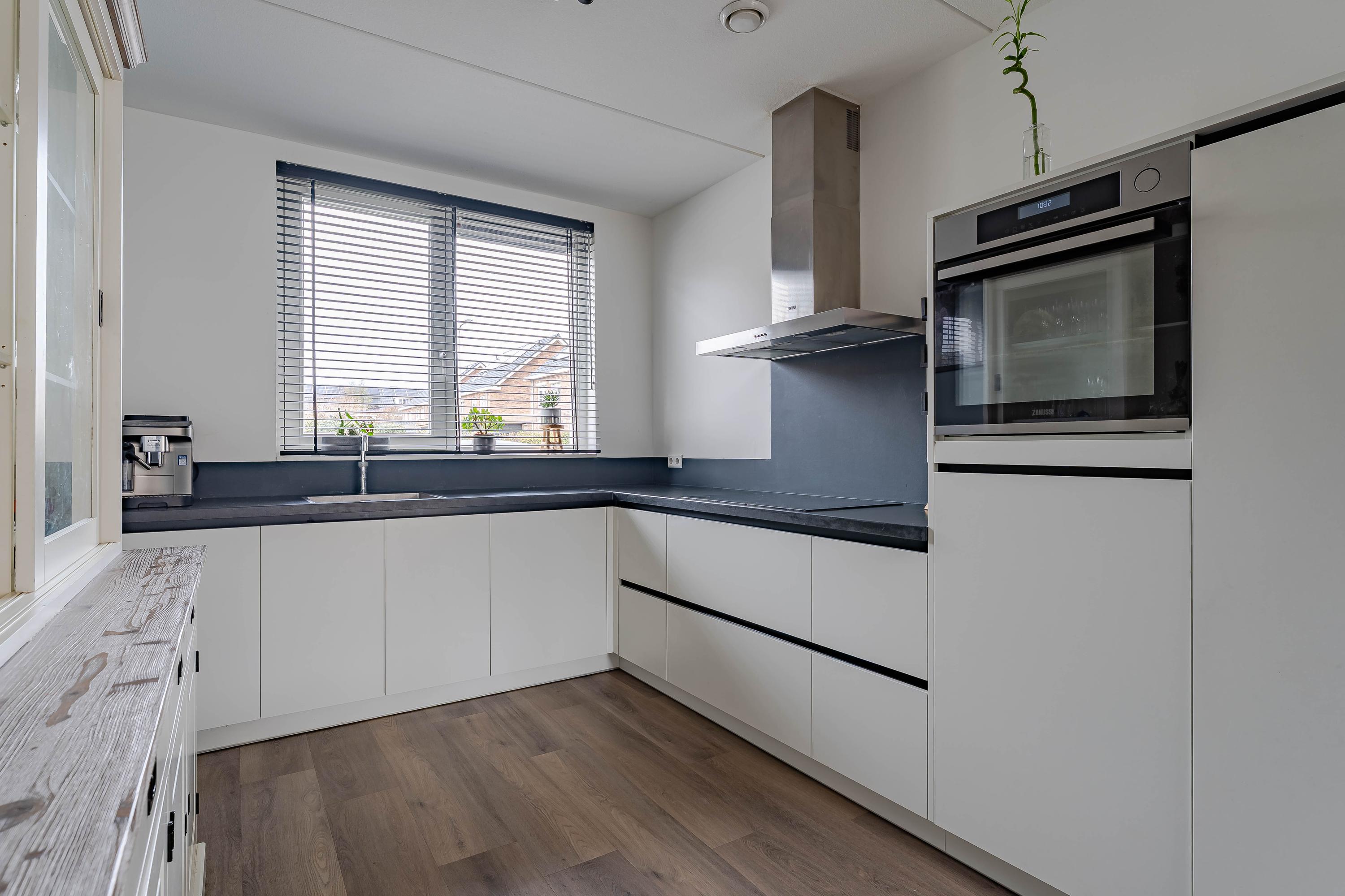 De lichte keukenopstelling is gesitueerd aan de voorzijde van de woning en voorzien van een stenen aanrechtblad. De opstelling is royaal en is compleet uitgerust met inbouwapparatuur, zoals een koelkast, vriezer, 4-pits inductiekookplaat, afzuigkap, stoomoven, vaatwasser en een Quooker. De kasten bieden voldoende bergruimte.