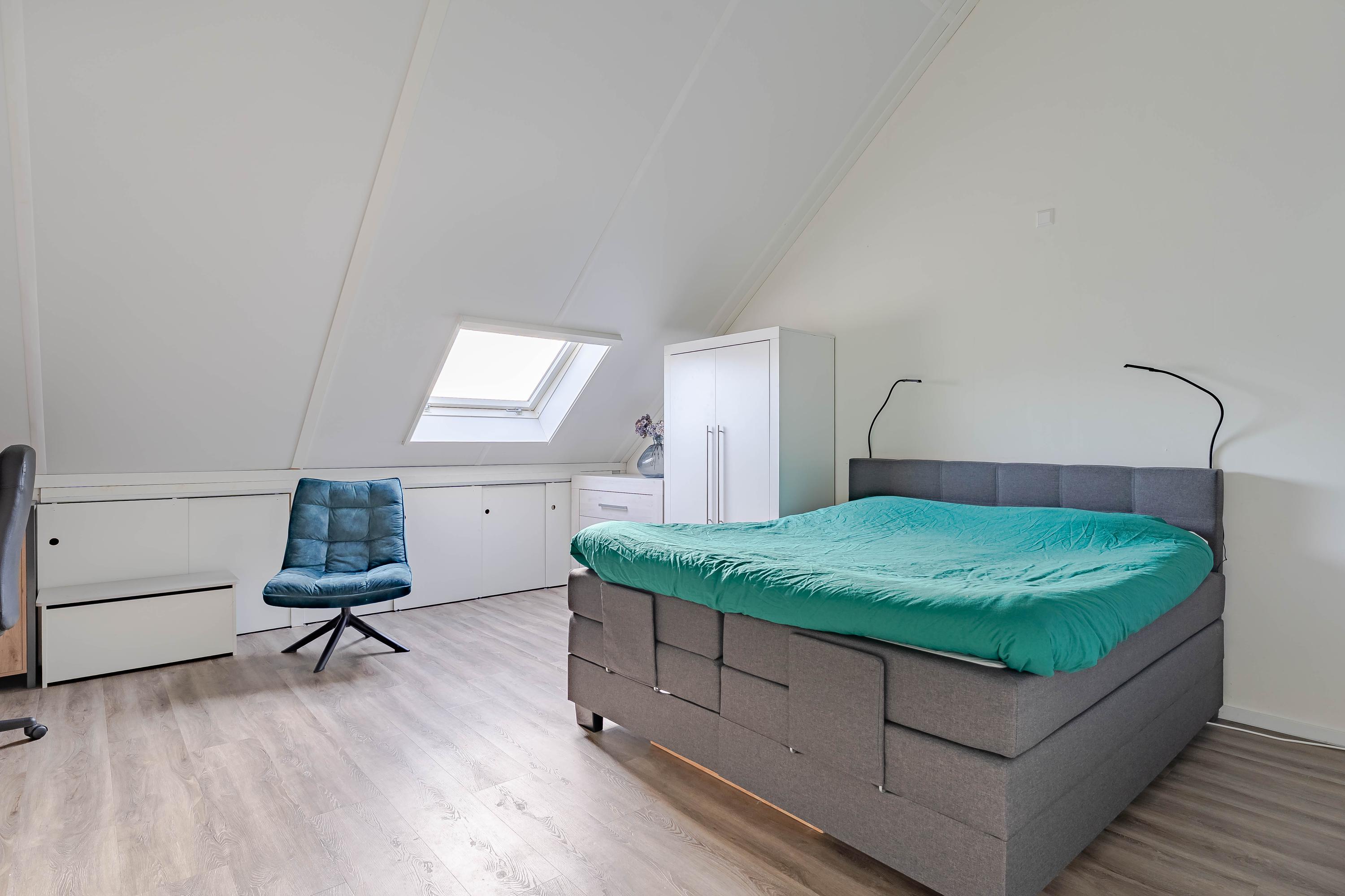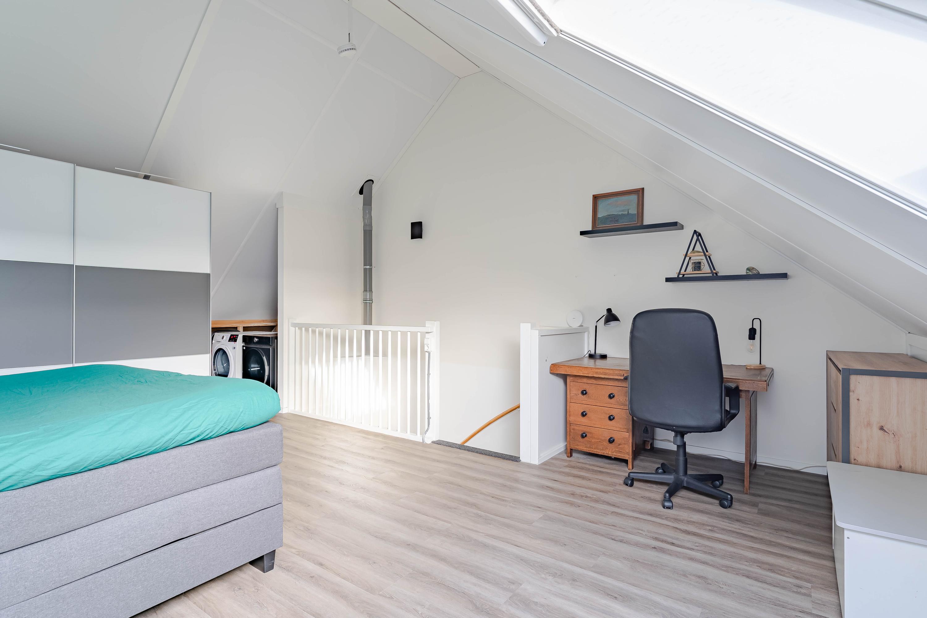 De tweede verdieping is een grote open ruimte die momenteel door een grote kastenwand wordt gesplitst. Indien gewenst kunt u hier één of twee slaapkamers creëren. U vindt hier ook de cv-ketel (Intergas, bouwjaar ca. 2020), de omvormer van de zonnepanelen en mechanische ventilatiebox. Daarnaast kunt u hier uw wasmachine en droger kwijt. Achter de knieschotten is voldoende bergruimte voor de spullen die u niet elders in het huis wilt bewaren.