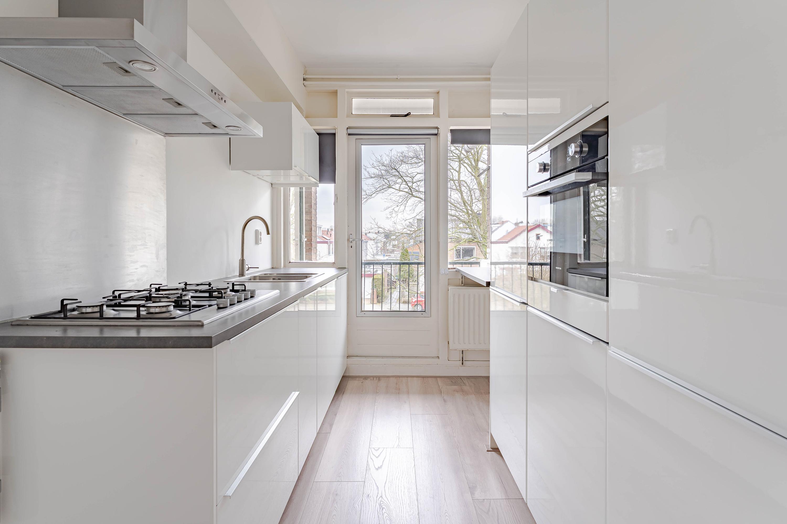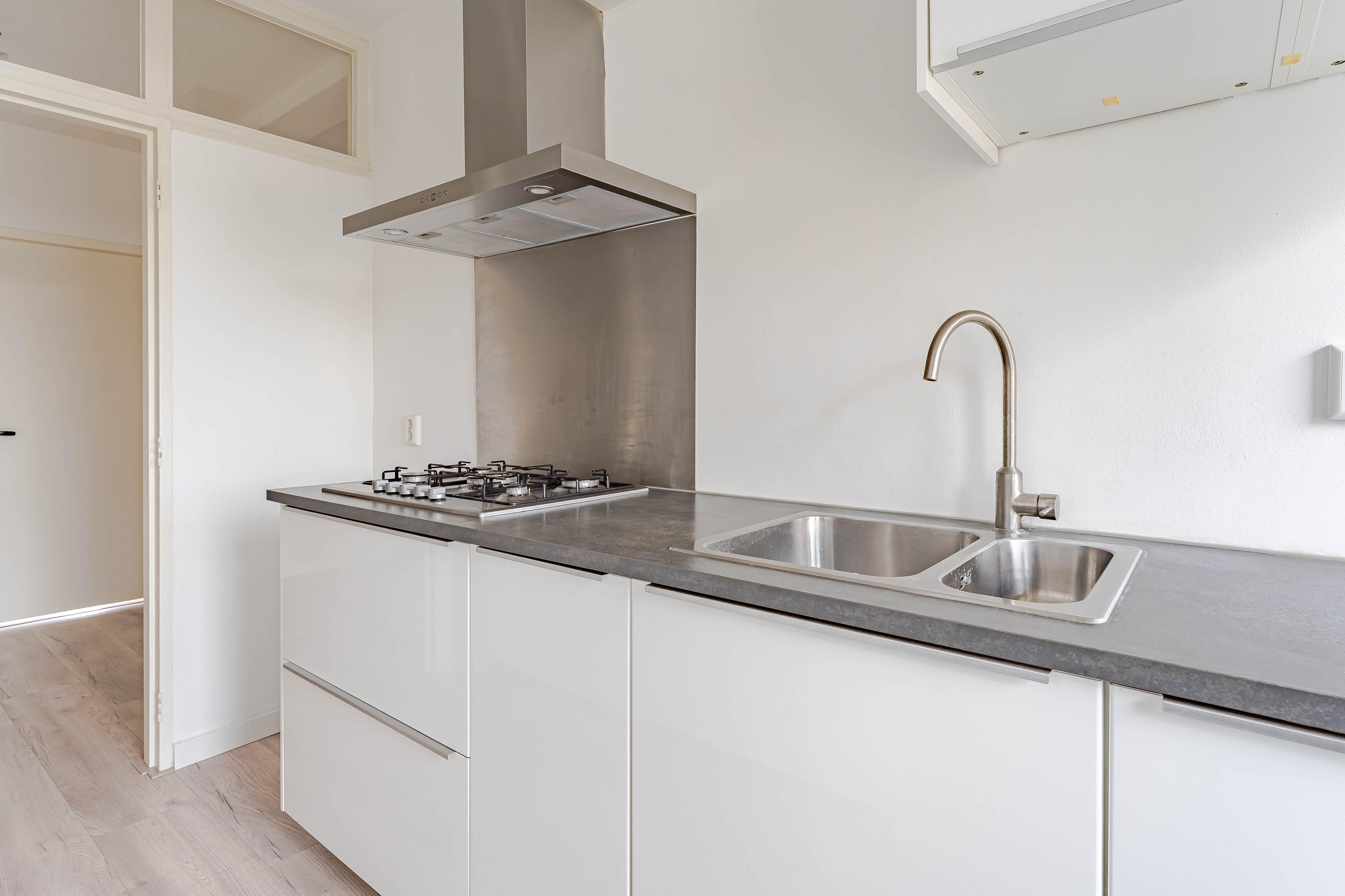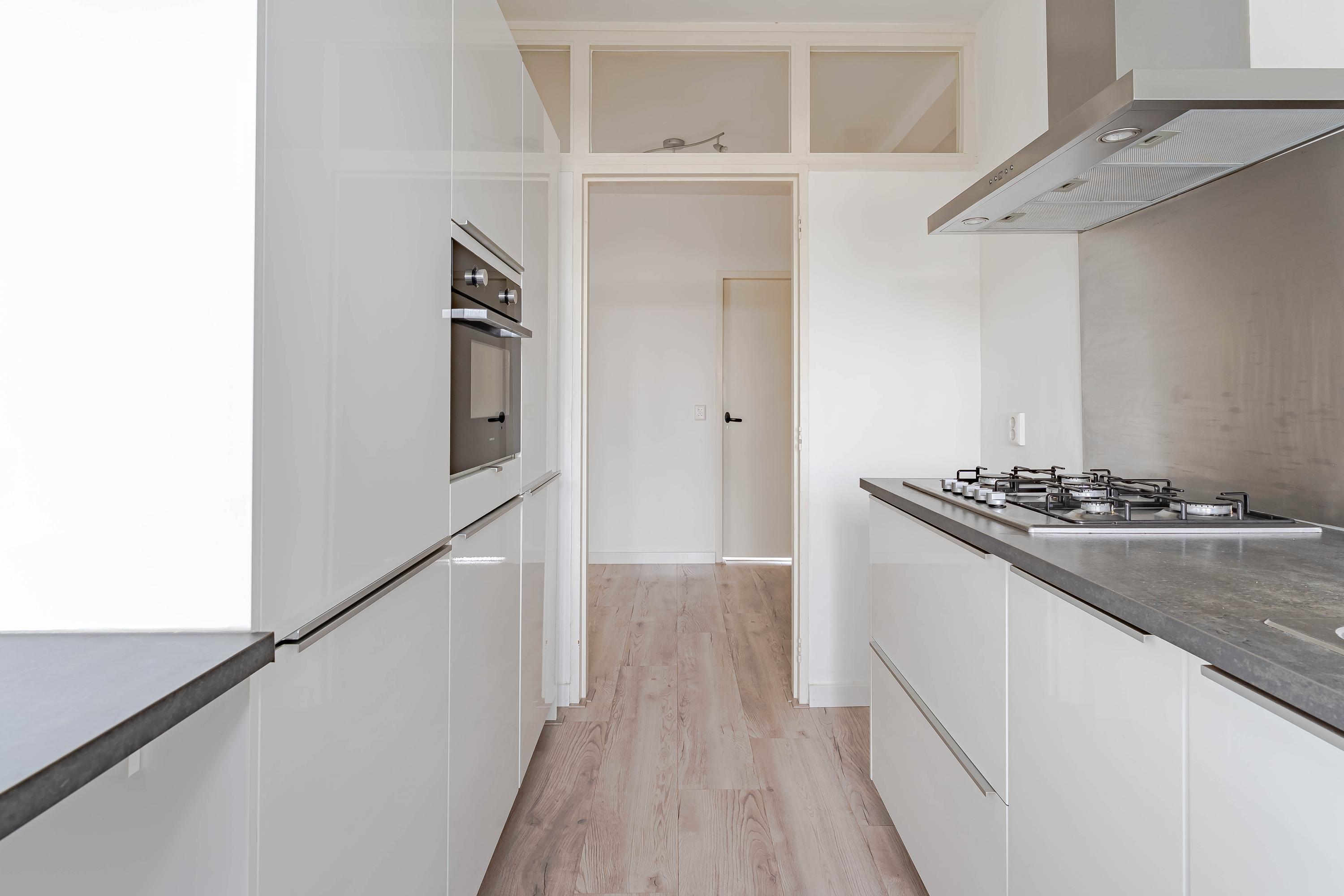 De keuken is modern ingericht, vernieuwd in 2016, met aan twee zijden kastruimte en de volgende inbouwapparatuur; gaskookplaat, afzuigkap, combioven, koelkast, vrieskast en vaatwasser. Ook de HR combiketel (Remeha uit 2016) is hier geplaatst.