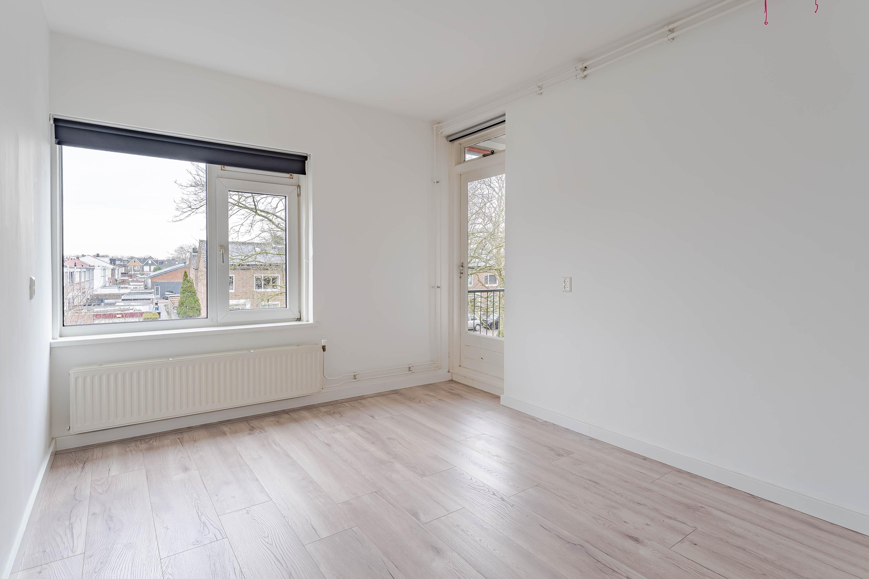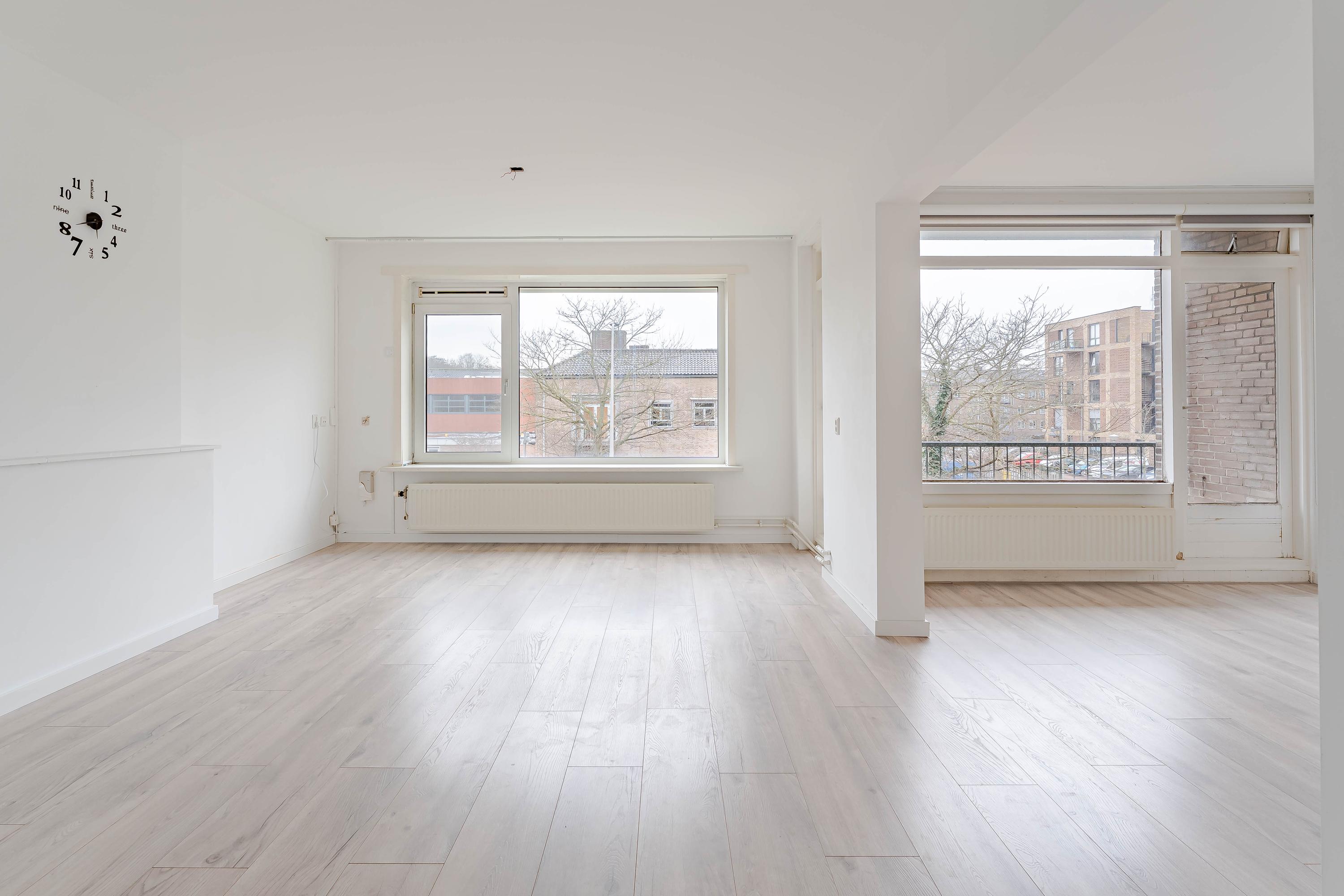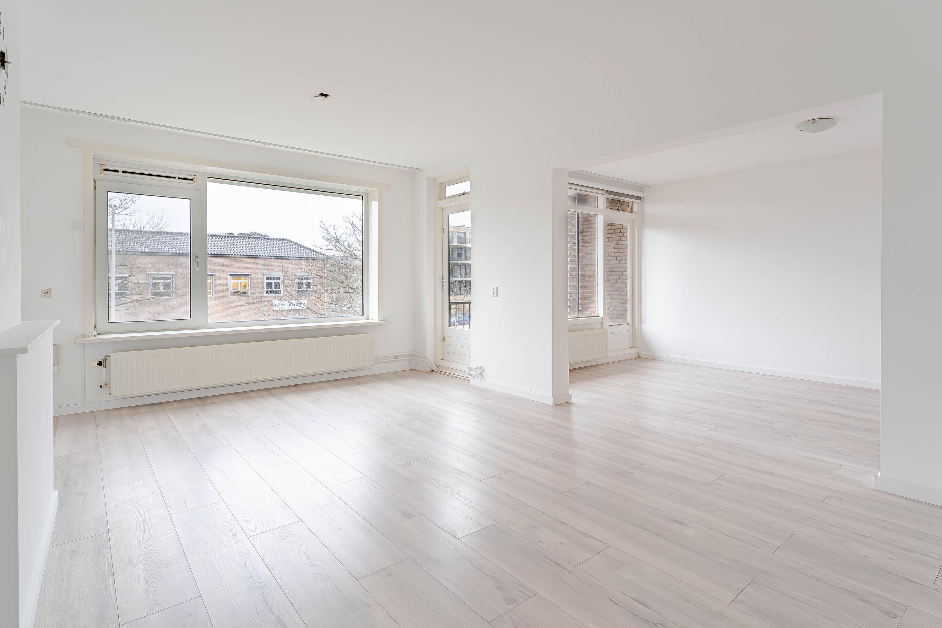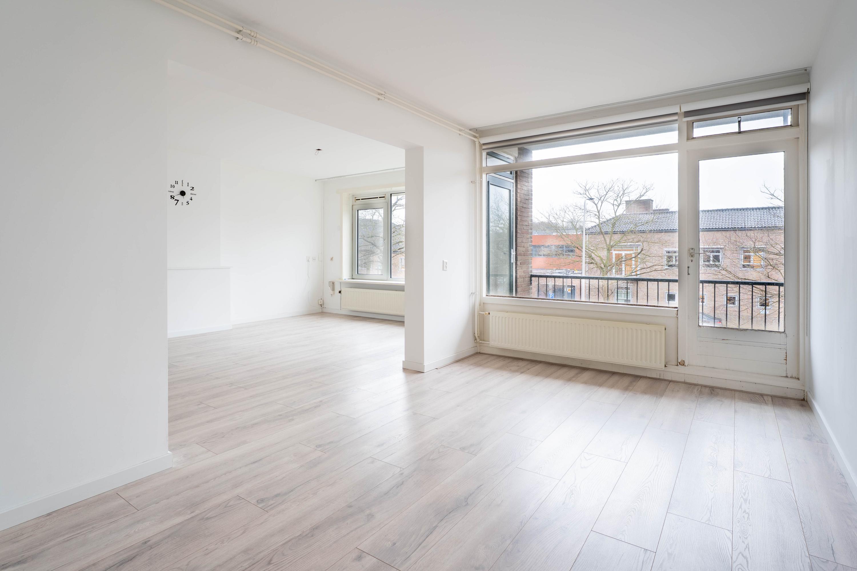 We lopen door naar de ruime en lichte woonkamer met toegang tot het balkon van circa 5 m² op het westen. De slaapkamer is bij de woonkamer betrokken, de opening in de muur is eenvoudig weer dicht te maken. Nu is er een aparte ruime eetkamer gecreëerd. Deze ruimte zou ook perfect zijn als werkruimte, in verbinding met de woonkamer. Ook via de eetkamer is het balkon bereikbaar. Aan de voorzijde is in 2025 elektrische zonwering geplaatst.