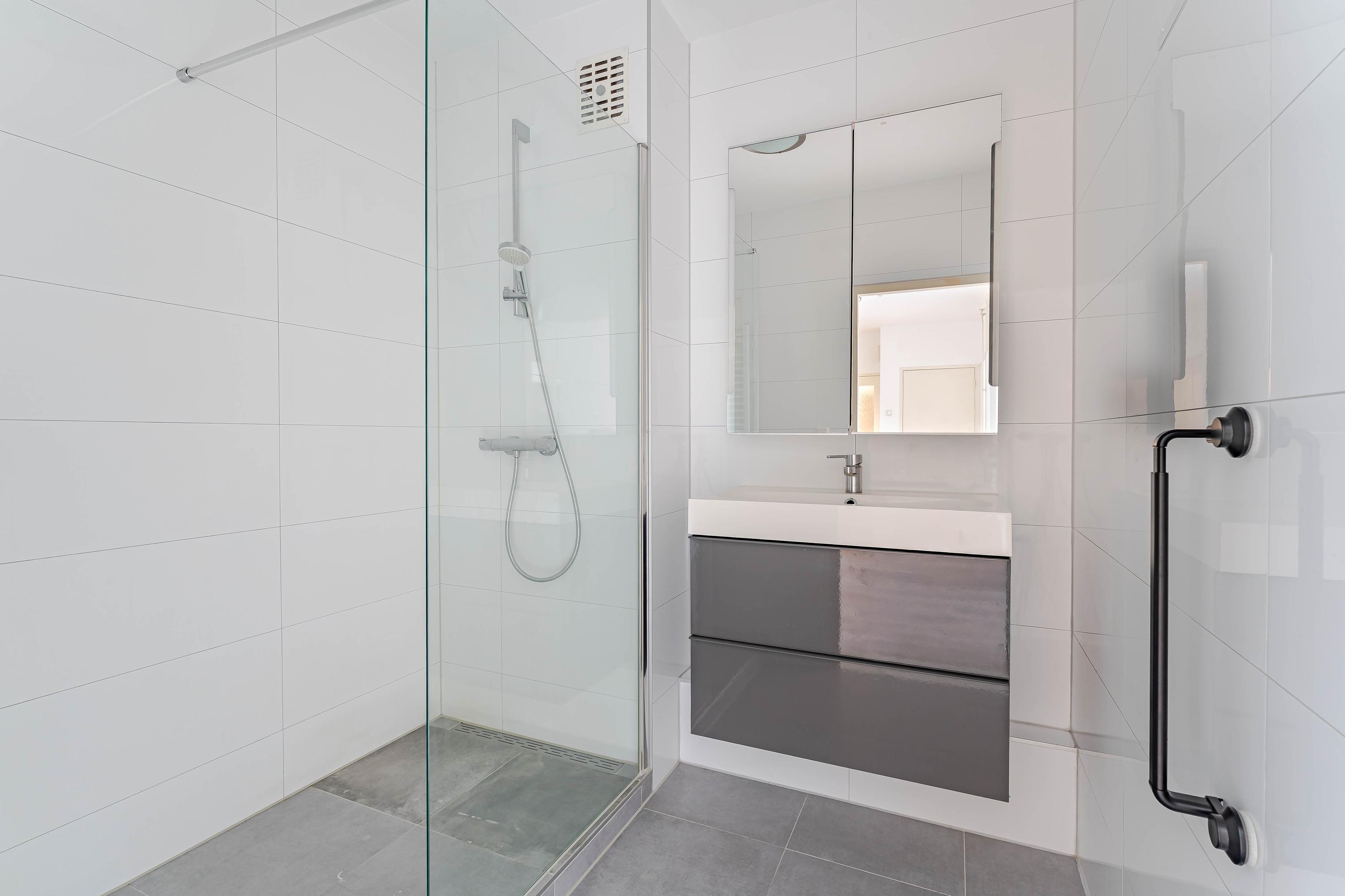 De moderne badkamer is in 2016 vernieuwd en voorzien van een inloopdouche, wastafel met meubel en spiegelkast.
