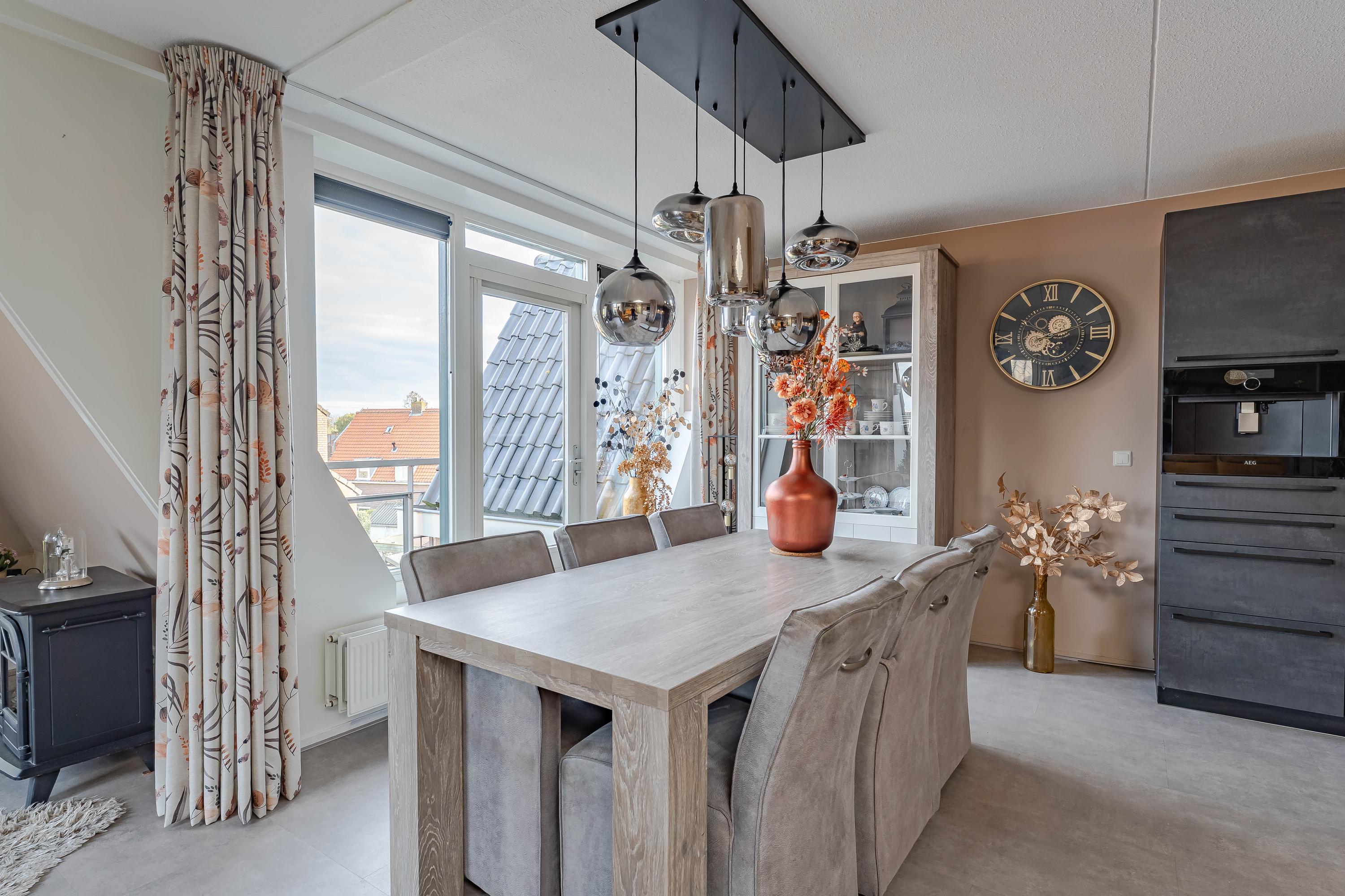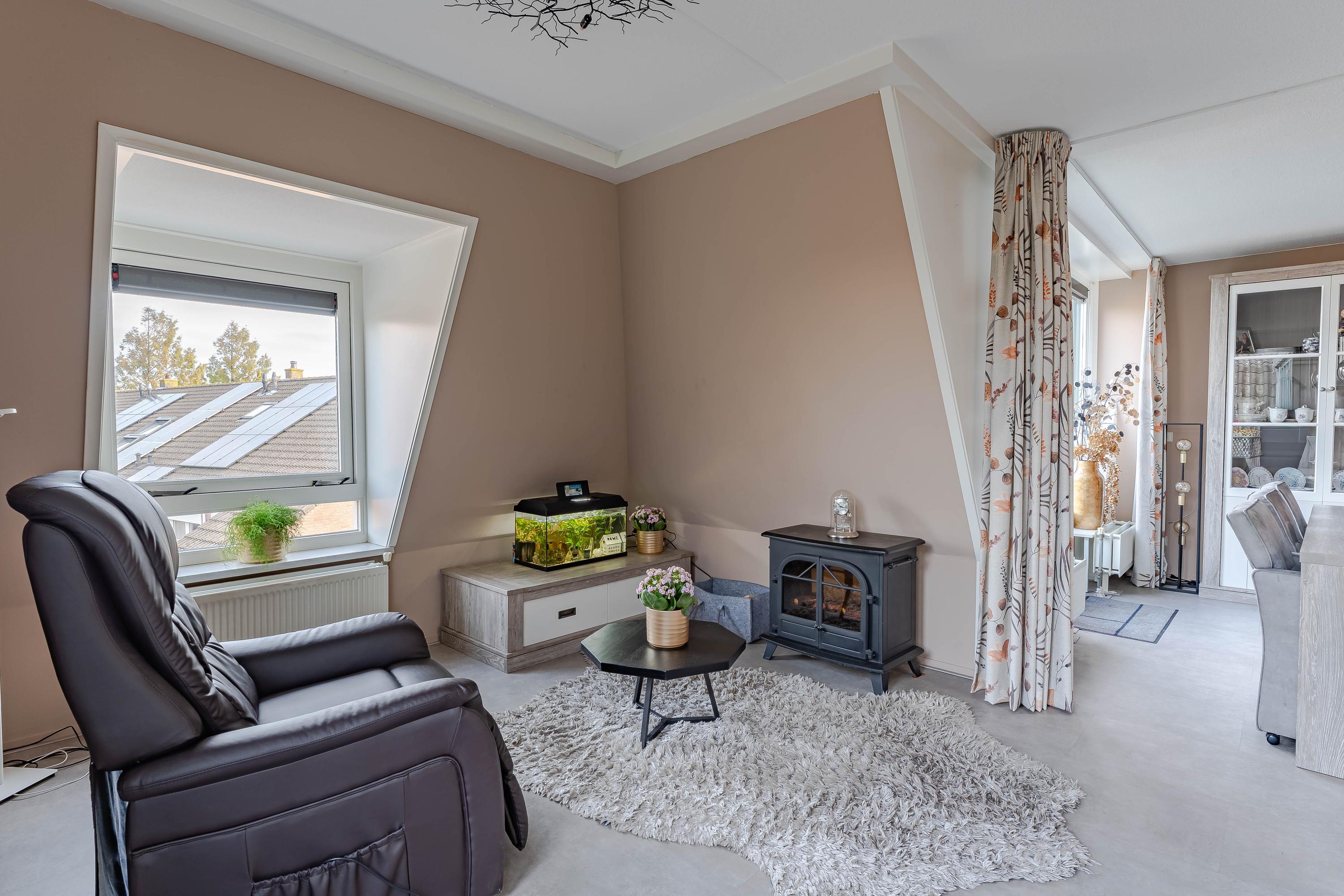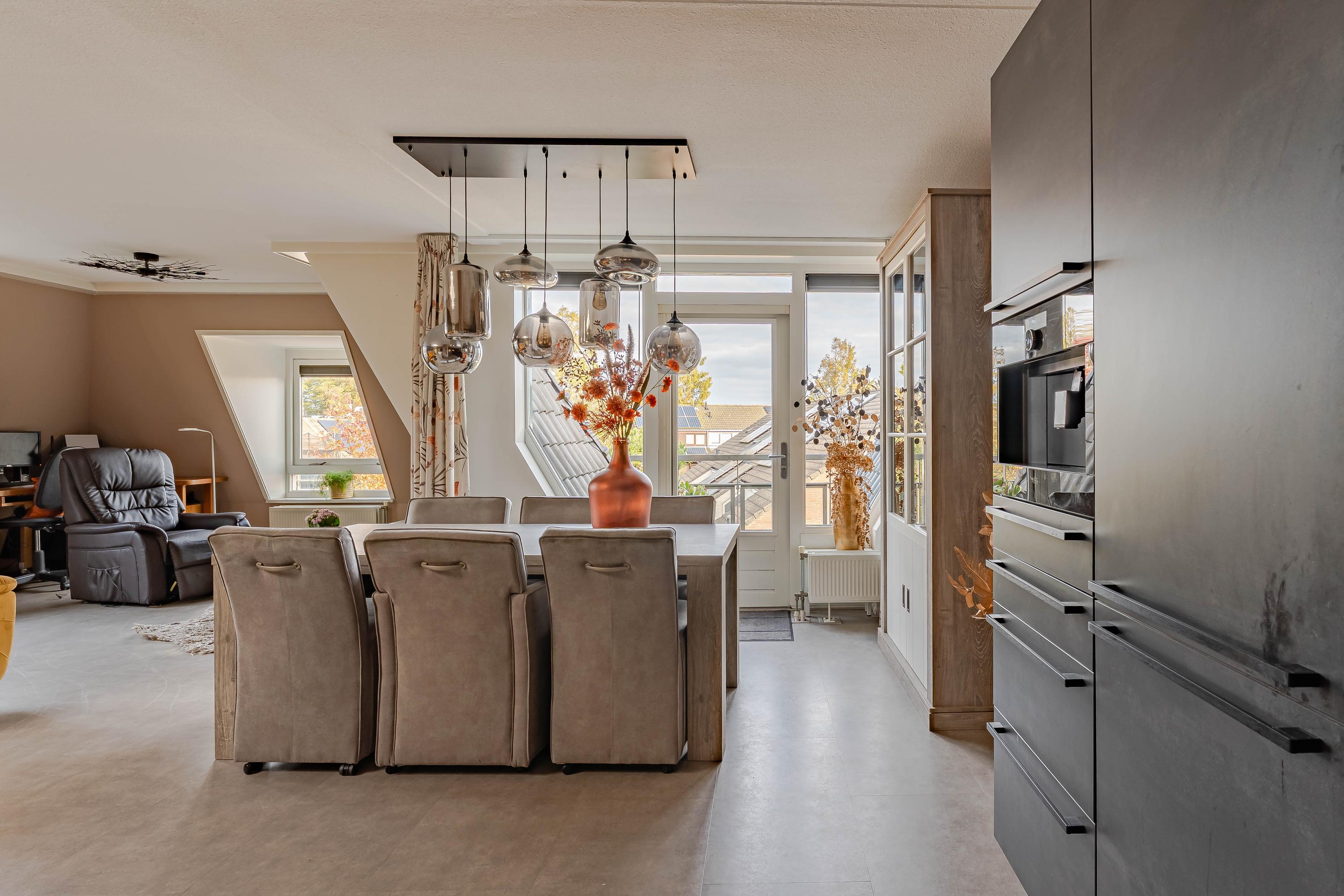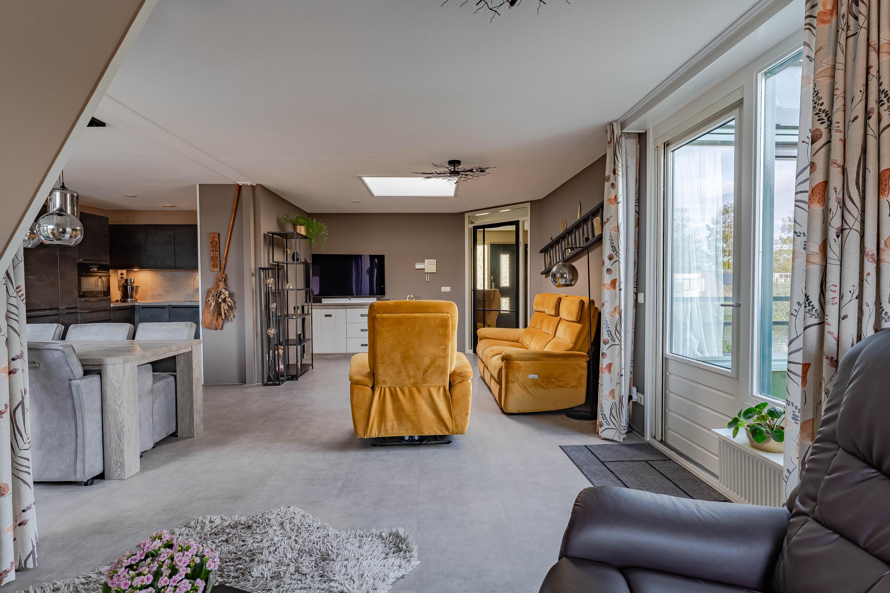De woonkamer met open keuken is heerlijk licht, dit komt door de vele raampartijen en de lichtkoepel die in het midden van de kamer is geplaatst. Alle ruimte voor het plaatsen van al uw meubels. De in 2022 vernieuwde keuken is ruim opgezet en heeft een luxe uitstraling. Aan inbouwapparatuur treft u het volgende aan: 4-pits inductiekookplaat met geïntegreerde afzuiging, combioven, extra ruime koelkast, Quooker en een koffieautomaat. De kasten bieden voldoende bergruimte voor al uw voorraad en keukengerei. Het aanrecht is van kunststof.