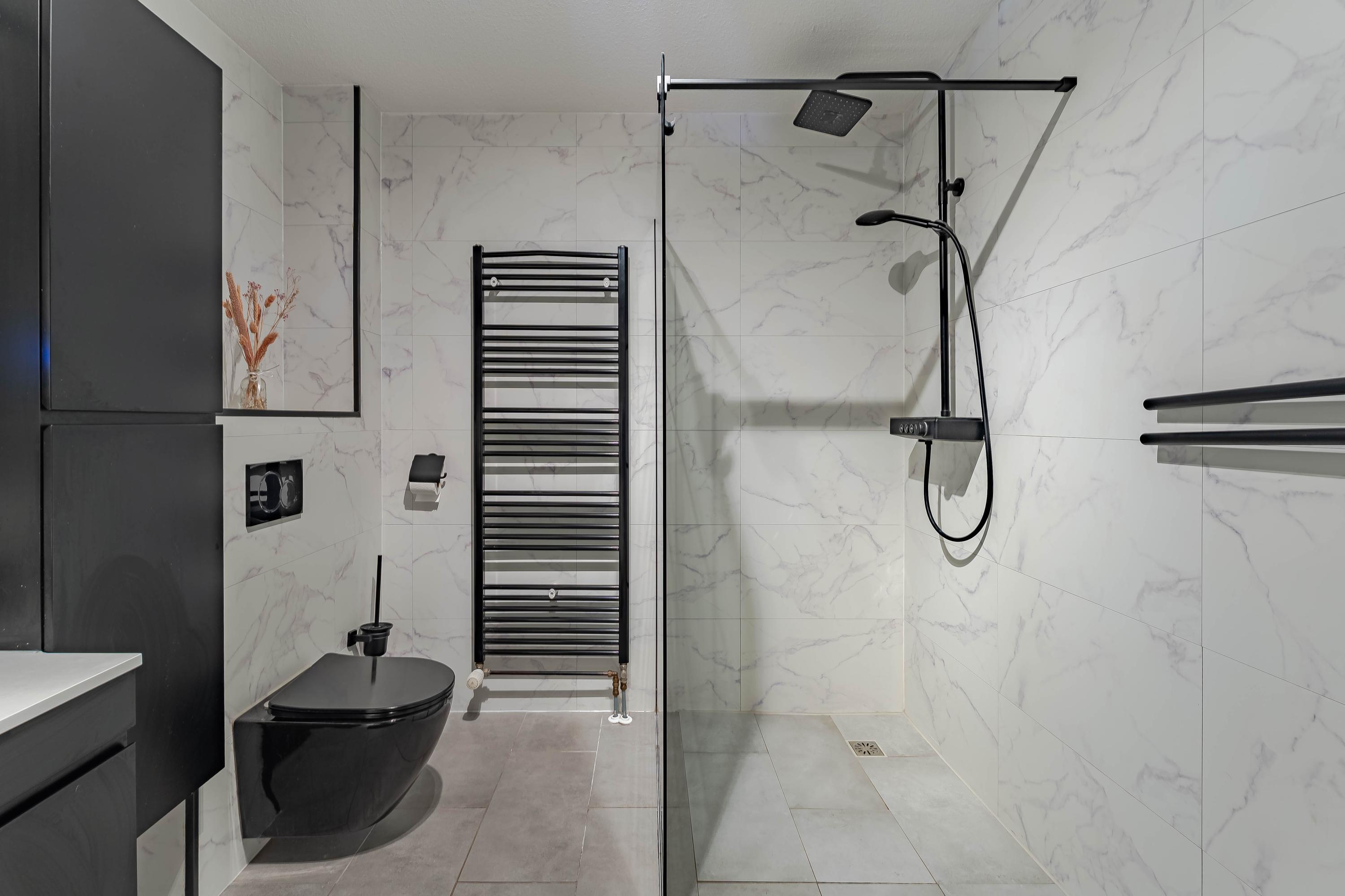 In 2022 zijn tevens de badkamer en toiletruimte vernieuwd. De badkamer is royaal, volledig betegeld en voorzien van een inloopdouche, zwevend closet, wastafel met meubel, spiegelkast en kolomkast. Daarnaast vindt u hier de wasmachine- en drogeropstelling. Uiteraard kunnen beiden ook met gemak in de technische ruimte/berging geplaatst worden. De separate toiletruimte is uitgevoerd met een zwevend closet en een fonteintje. Ook deze heeft een moderne uitstraling.