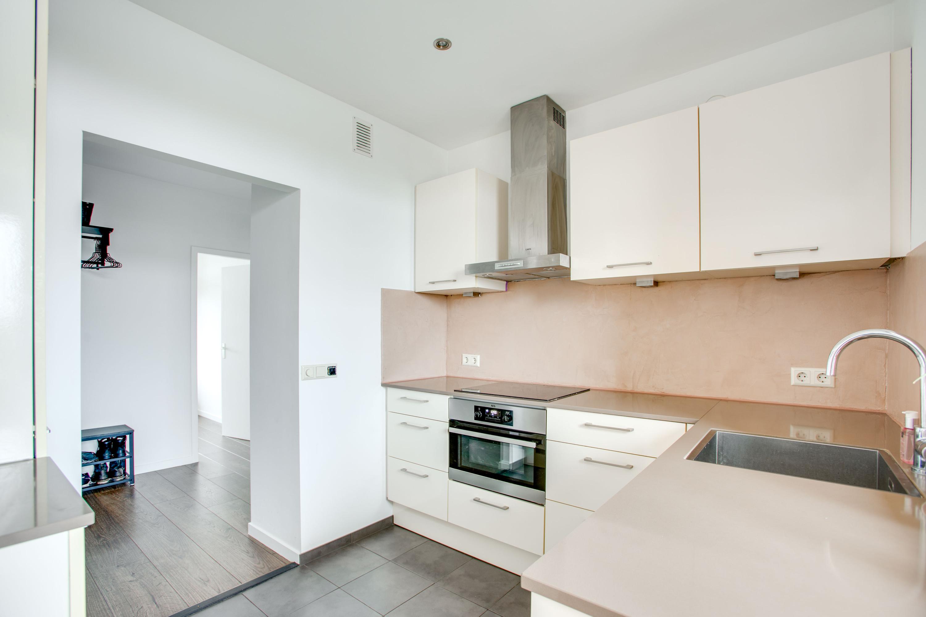 De dichte keuken heeft een hoekopstelling en is ingericht met een 4-pits inductiekookplaat, afzuiging, koelkast, vriezer, combioven en een vaatwasser. Het aanrecht is voorzien van een stenen blad, er is voldoende bergruimte in de kasten. De keuken wordt verwarmd door middel van elektrische vloerverwarming. Een loopdeur biedt toegang tot het tweede balkon, waar u nog een tuinkast aantreft. In deze kast is de boiler (eigendom, bj. 2016) opgesteld.