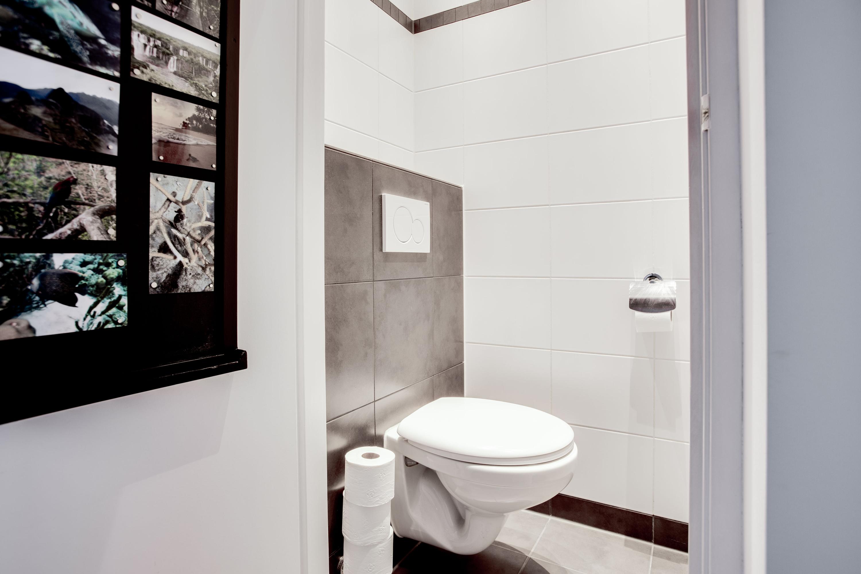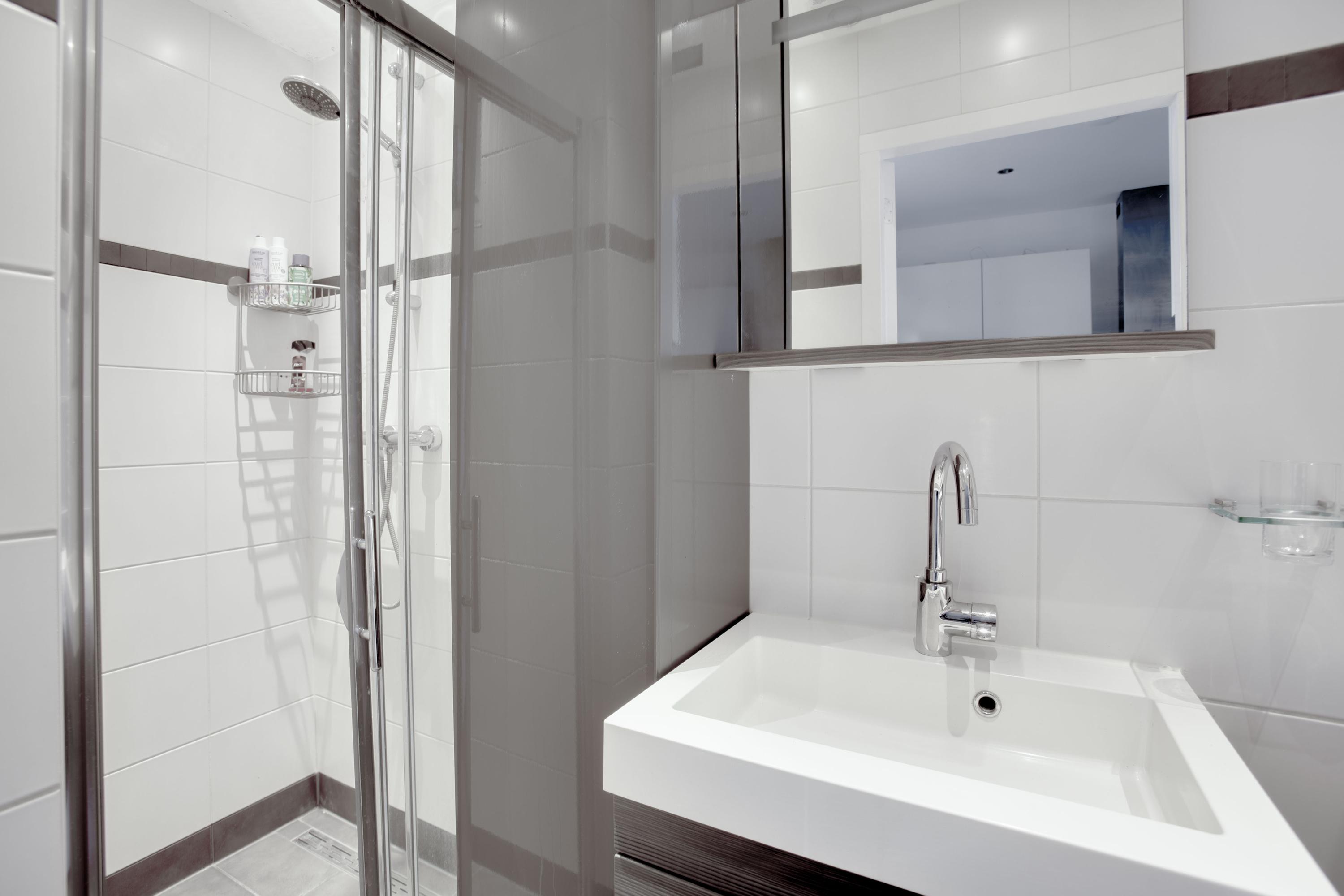 Naast de keuken bevindt zich de nette badkamer. Deze is geheel betegeld, voorzien van een douche en wastafel met meubel. In de badkamer treft u tevens de aansluiting voor de wasmachine.