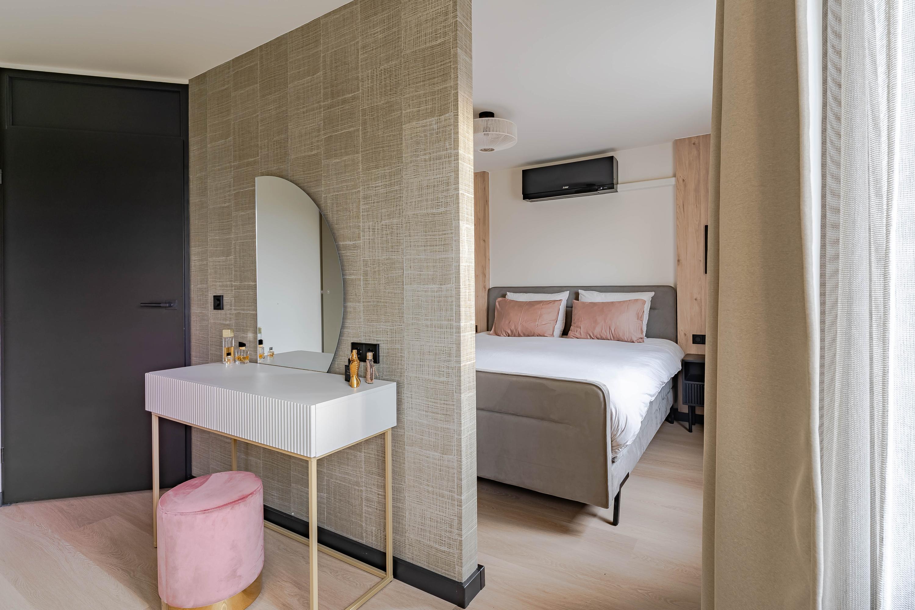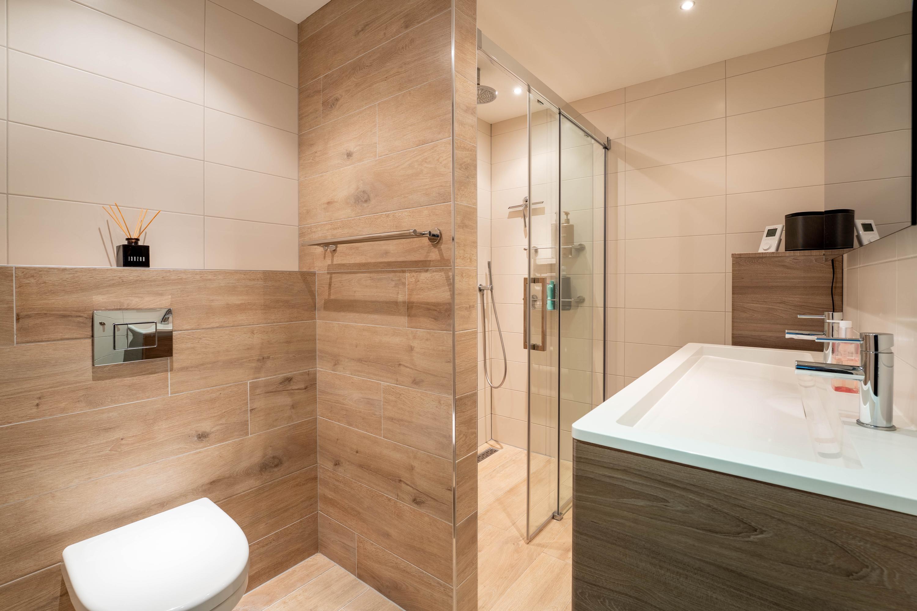 De badkamer is in 2015 vernieuwd, volledig betegeld en ingericht met vloerverwarming, een inloopdouche, modern toilet, wastafel met meubel en spiegel met infraroodverwarming.