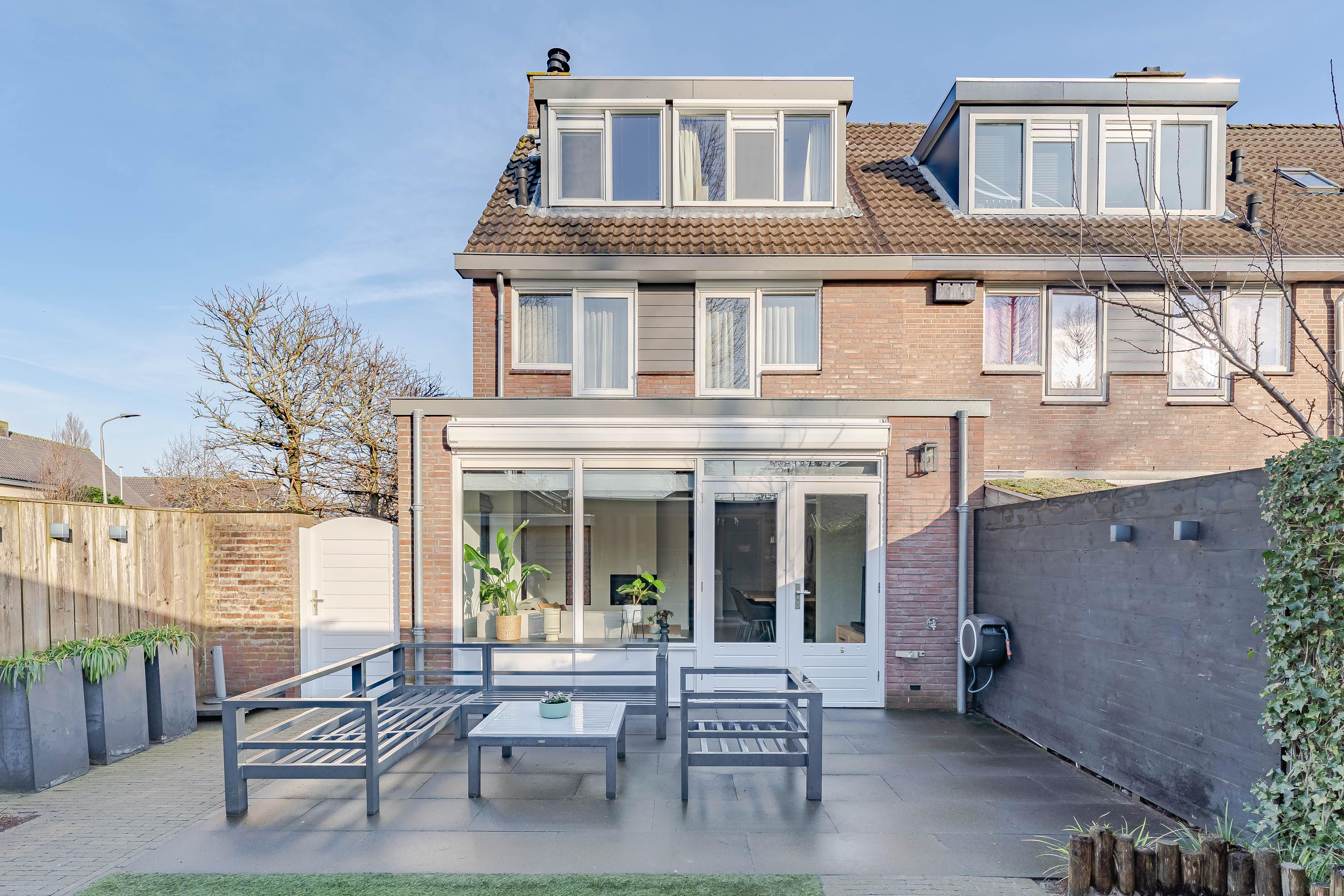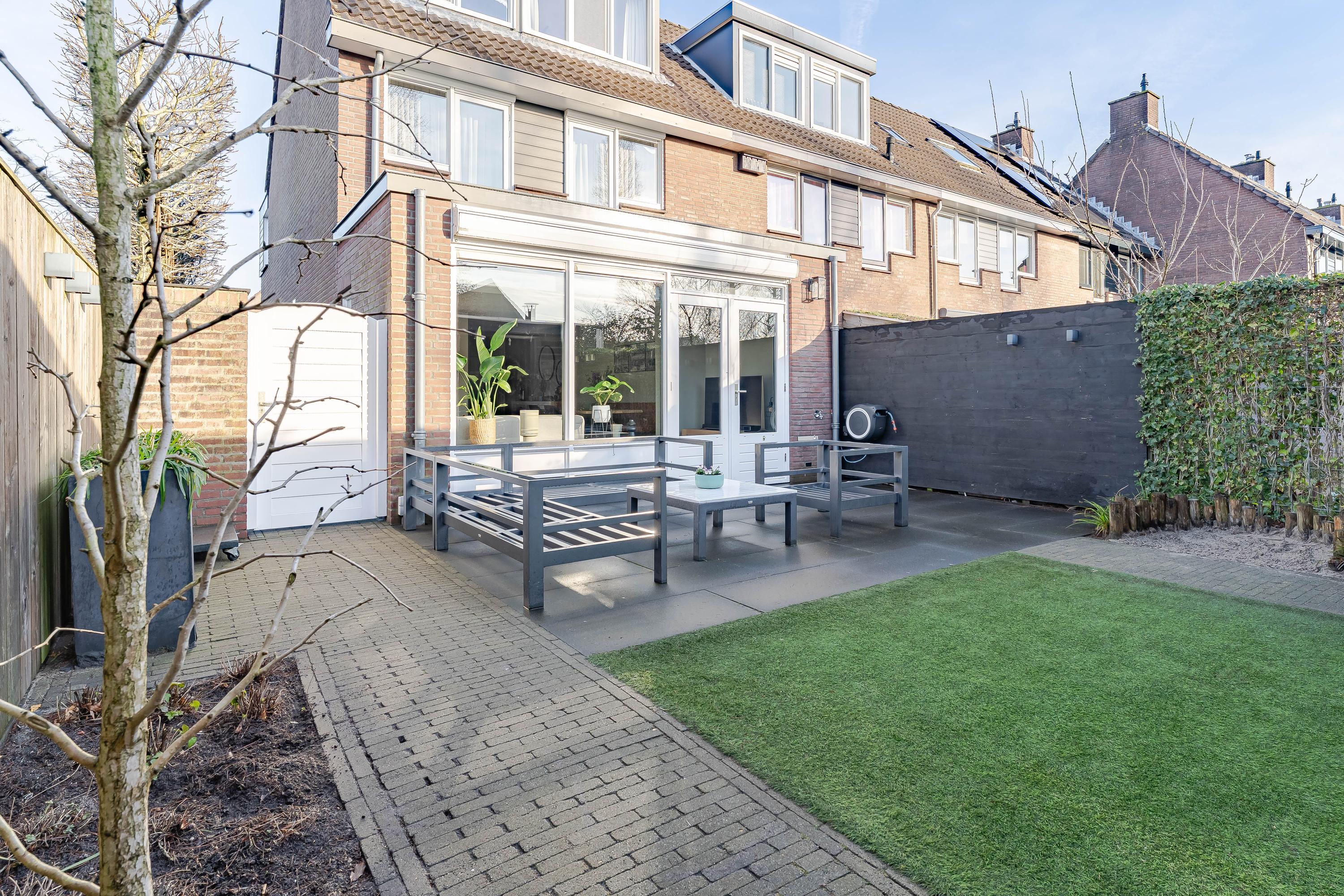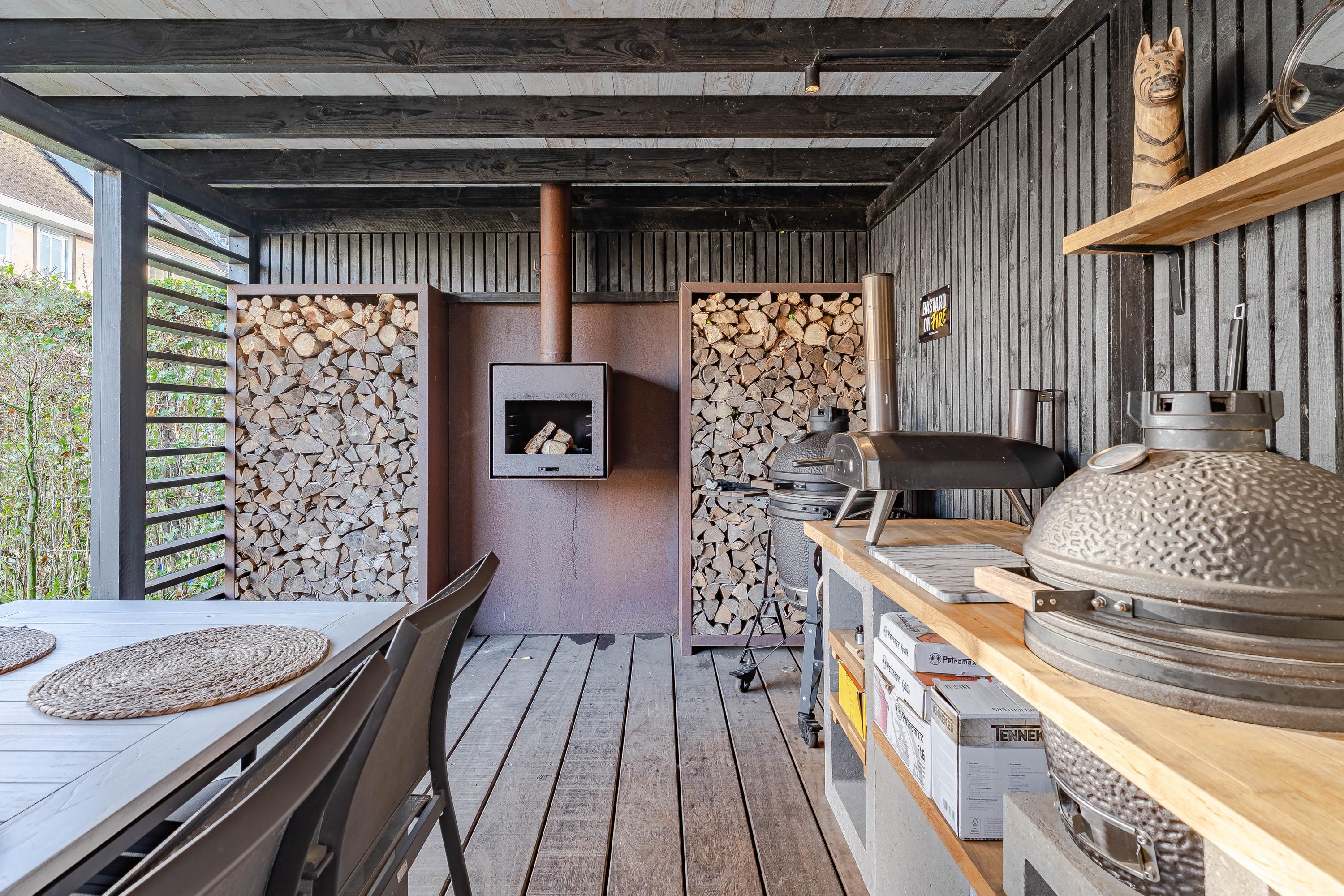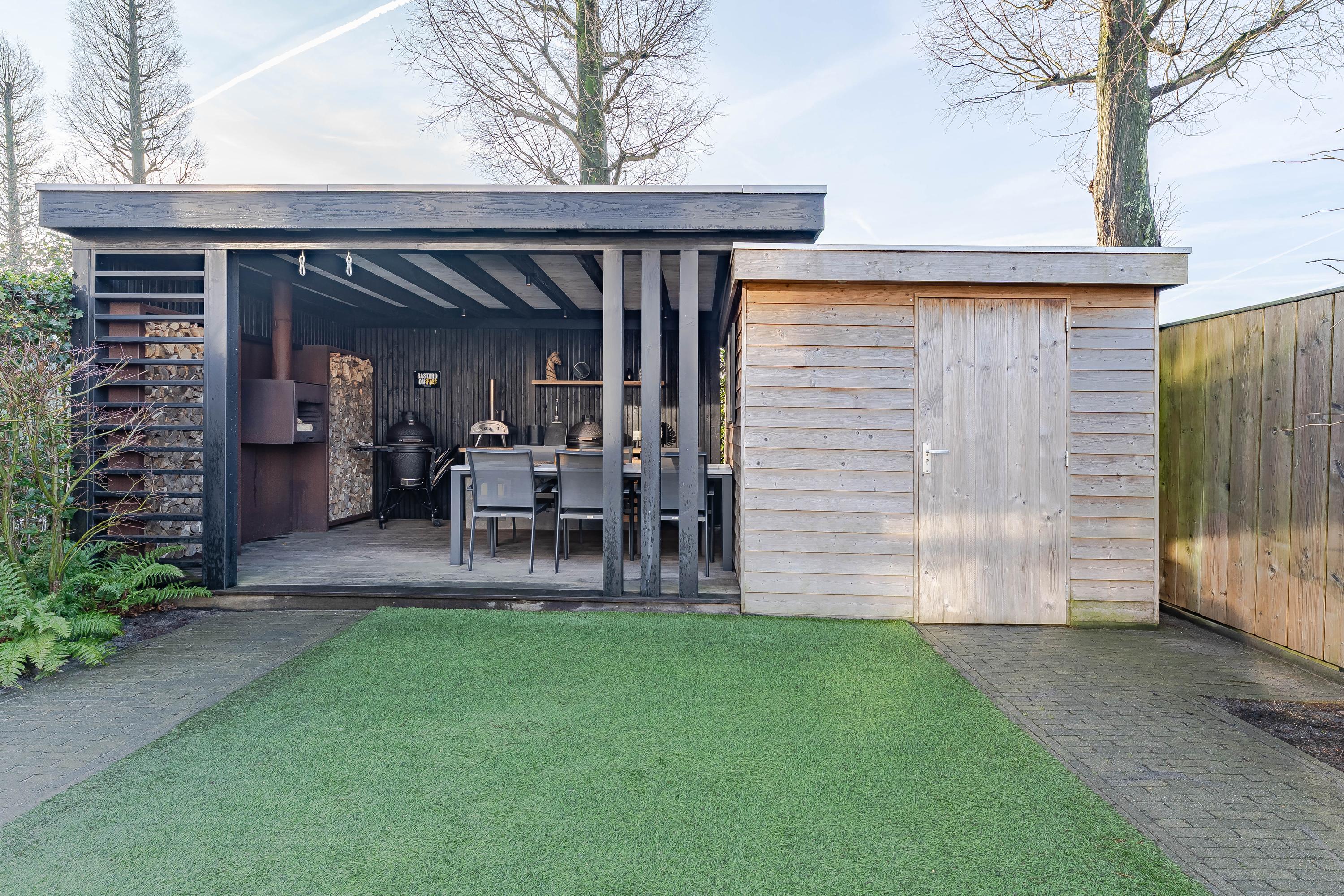 Vanuit de woonkamer stapt u in de in 2017 nieuw aangelegde achtertuin. De tuin ligt op het zuiden en beschikt over een achterom via de zijtuin. De houten berging (2017) is ideaal voor het opbrengen van de tuinkussens, fietsen en andere tuinspullen. Drie jaar geleden is de overkapping geplaatst met een vaste buitenhaard, een heerlijk plek om van het buitenleven te genieten!