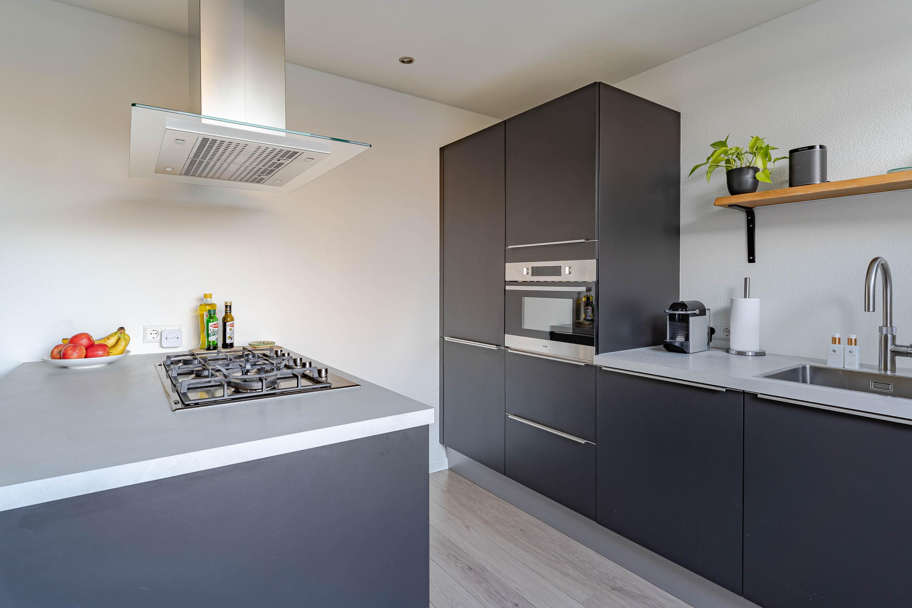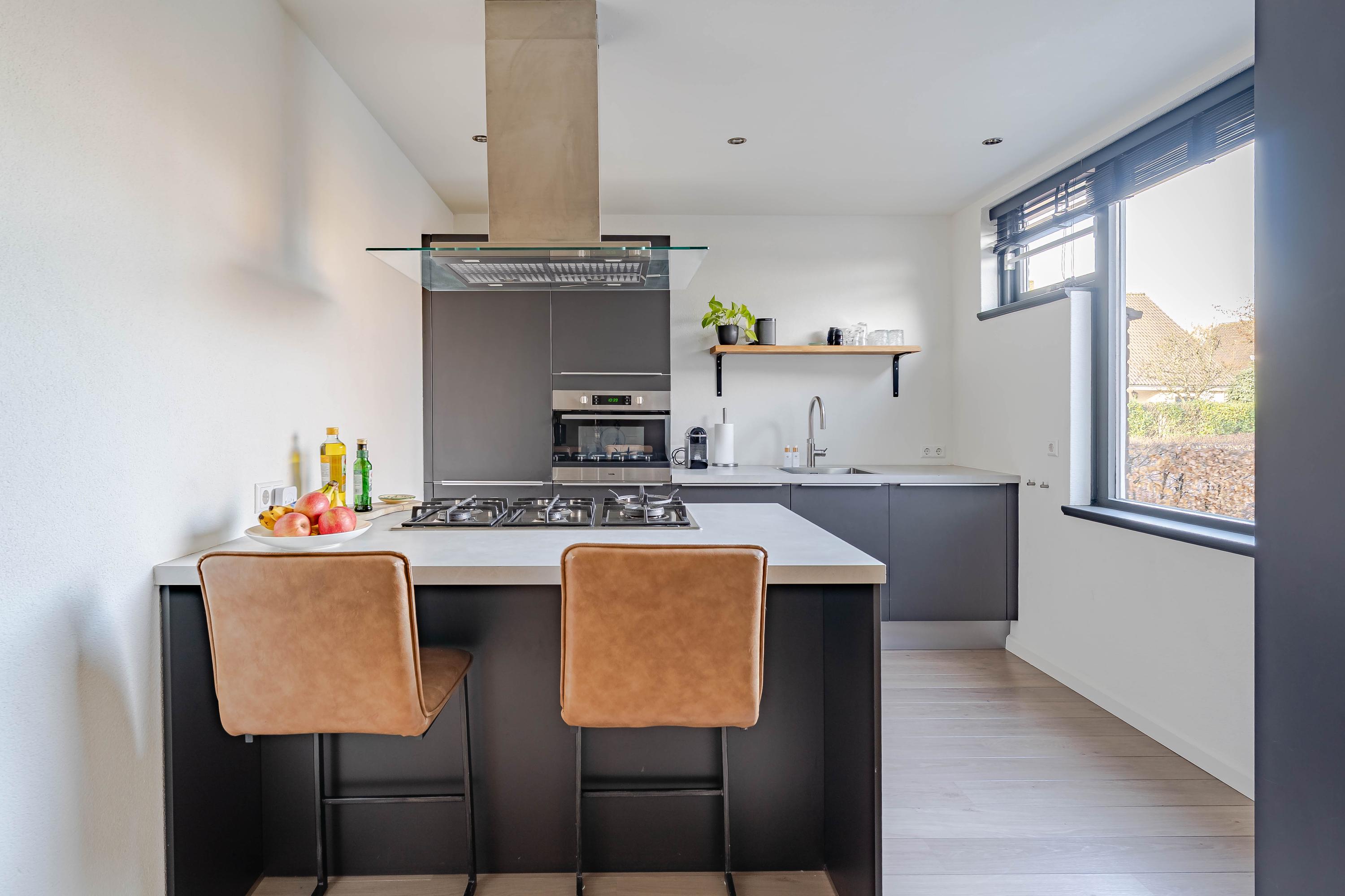 De open keuken bevindt zich aan de voorzijde van de woning en kijkt uit op de straat. De keuken is in 2019 volledig vernieuwd en ingericht met een kookeiland met 5-pits gasfornuis, afzuigkap, vaatwasser, koel-/vriescombinatie, combi-oven en Quooker.