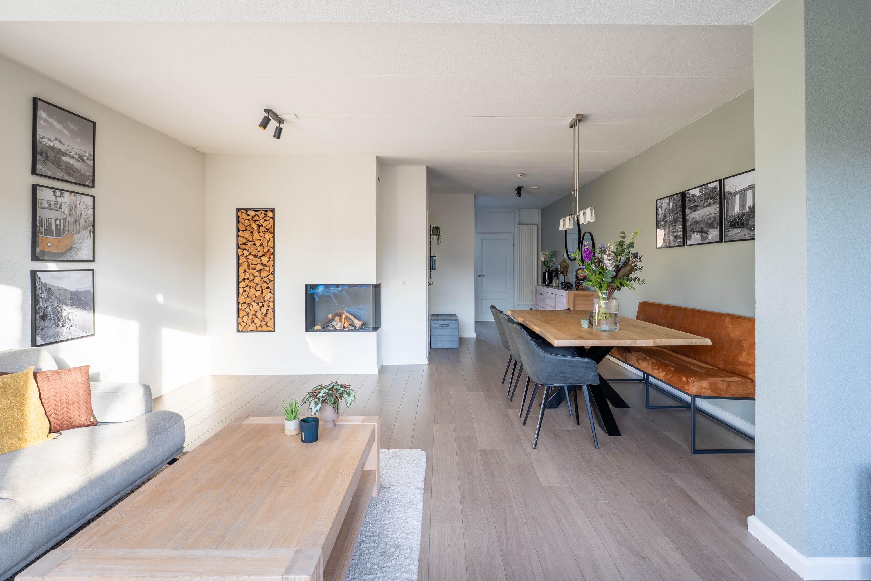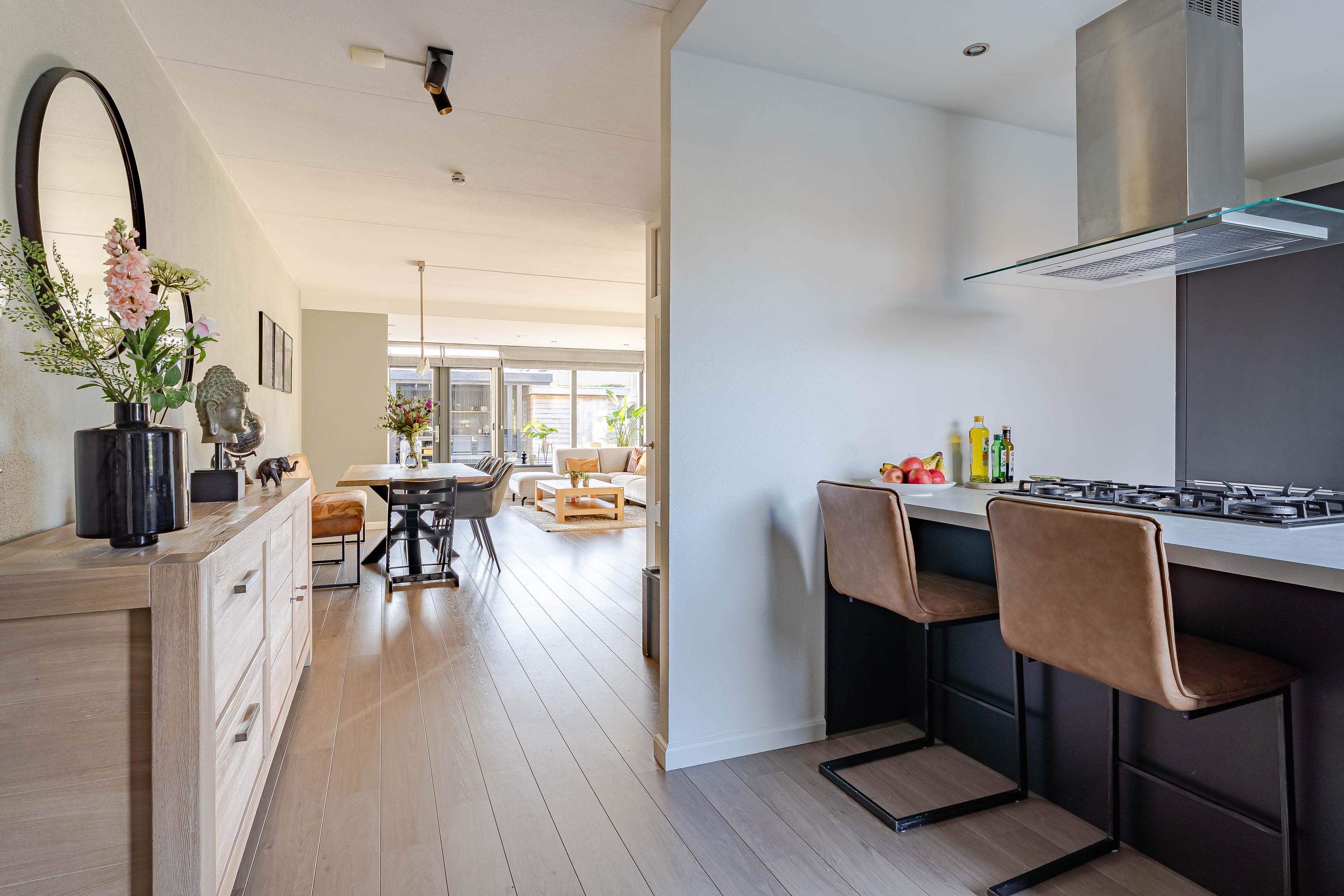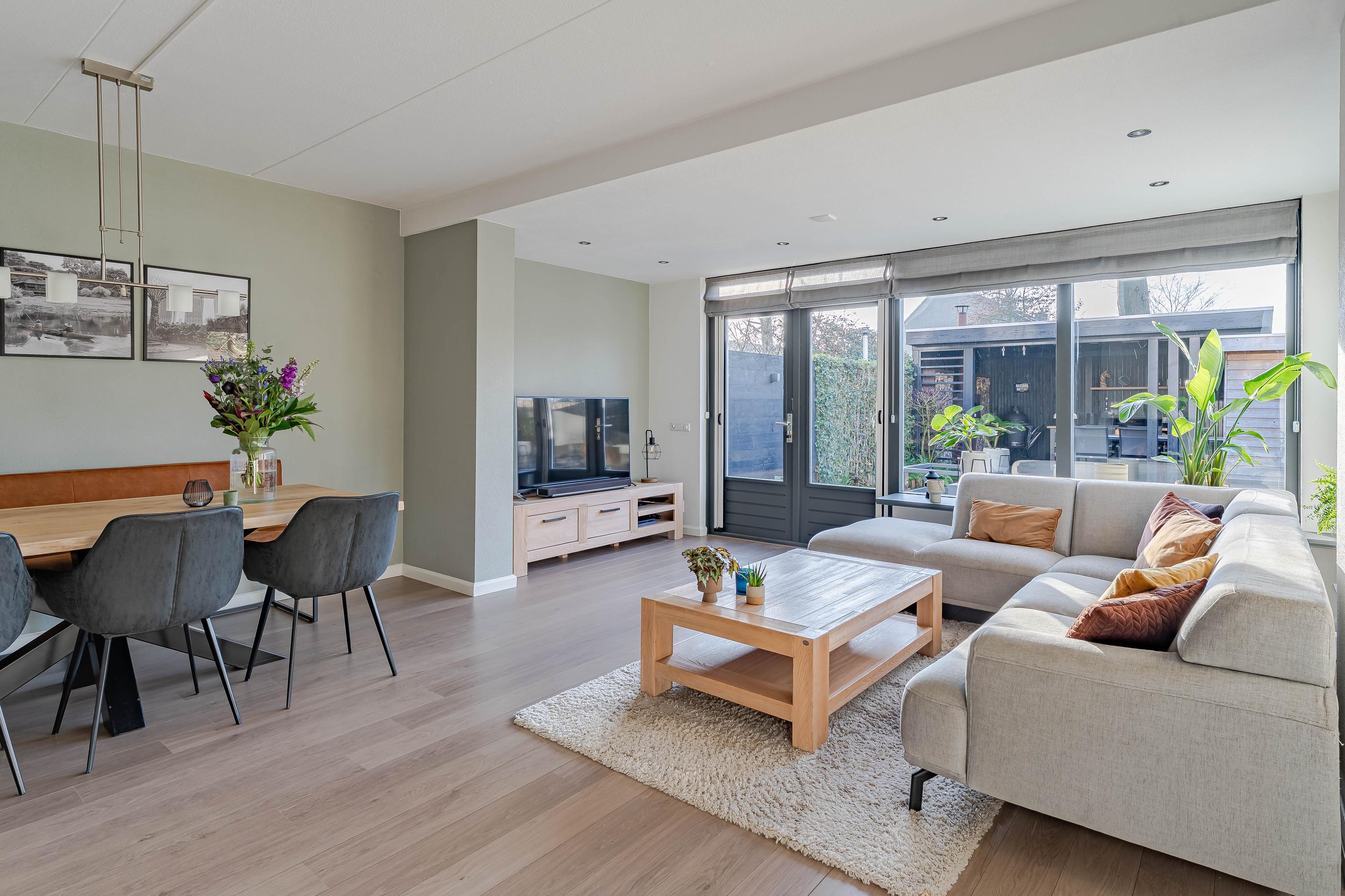 Dankzij de grote raampartijen en het zijraam beschikt de tuingerichte woonkamer over veel daglicht. Er is voldoende ruimte voor een eethoek en zithoek. Verder geeft de gashaard in de winter extra warmte en sfeer. Het elektrische zonnescherm zorgt in de zomermaanden juist voor schaduw.