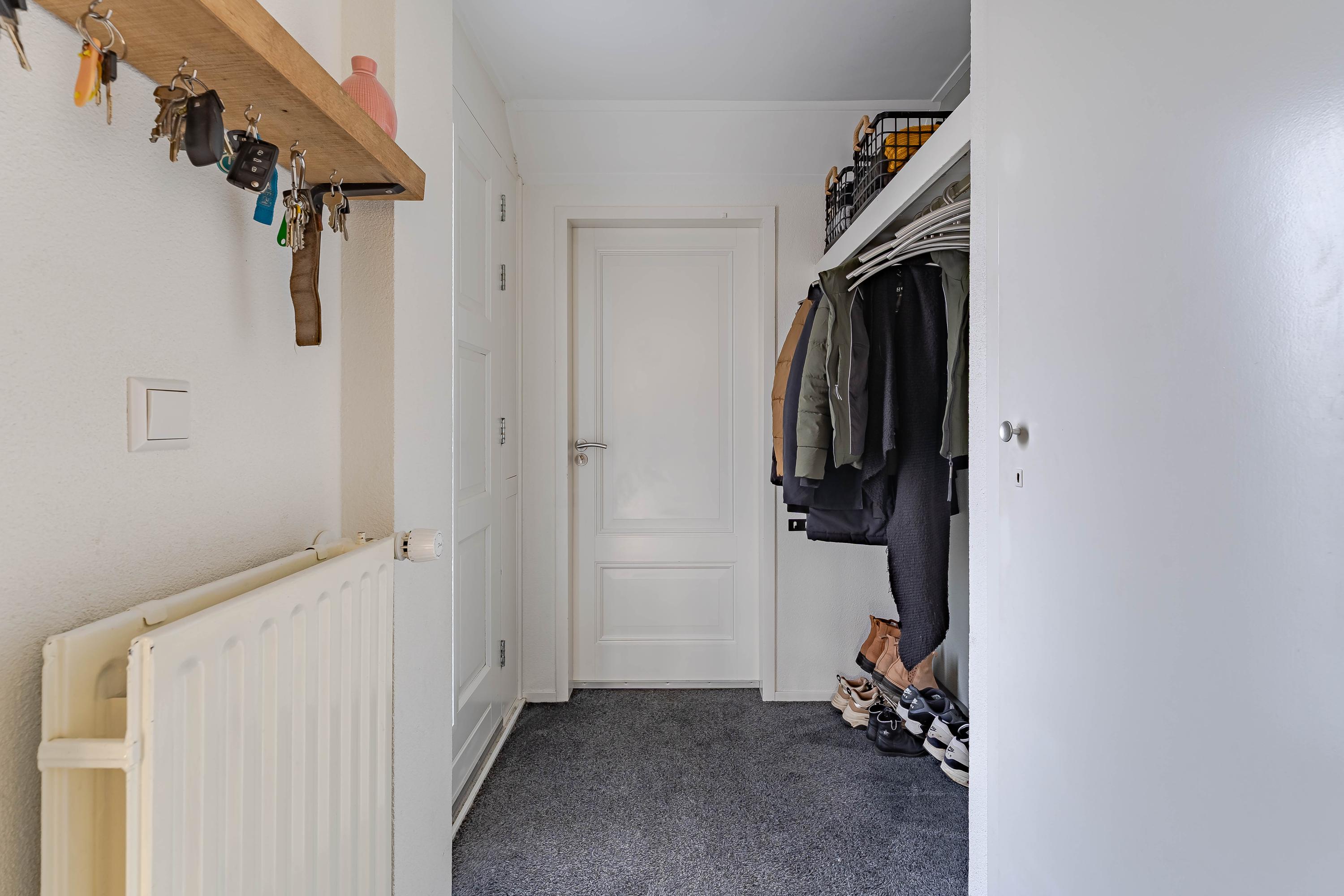 Via de oprit/voortuin komt u de woning binnen in de hal met vernieuwde meterkast. De hal geeft toegang tot de woonkamer en toegang tot de voormalige berging. De huidige eigenaren hebben de berging verbouwd tot bijkeuken, ideaal als bergruimte of garderobe.