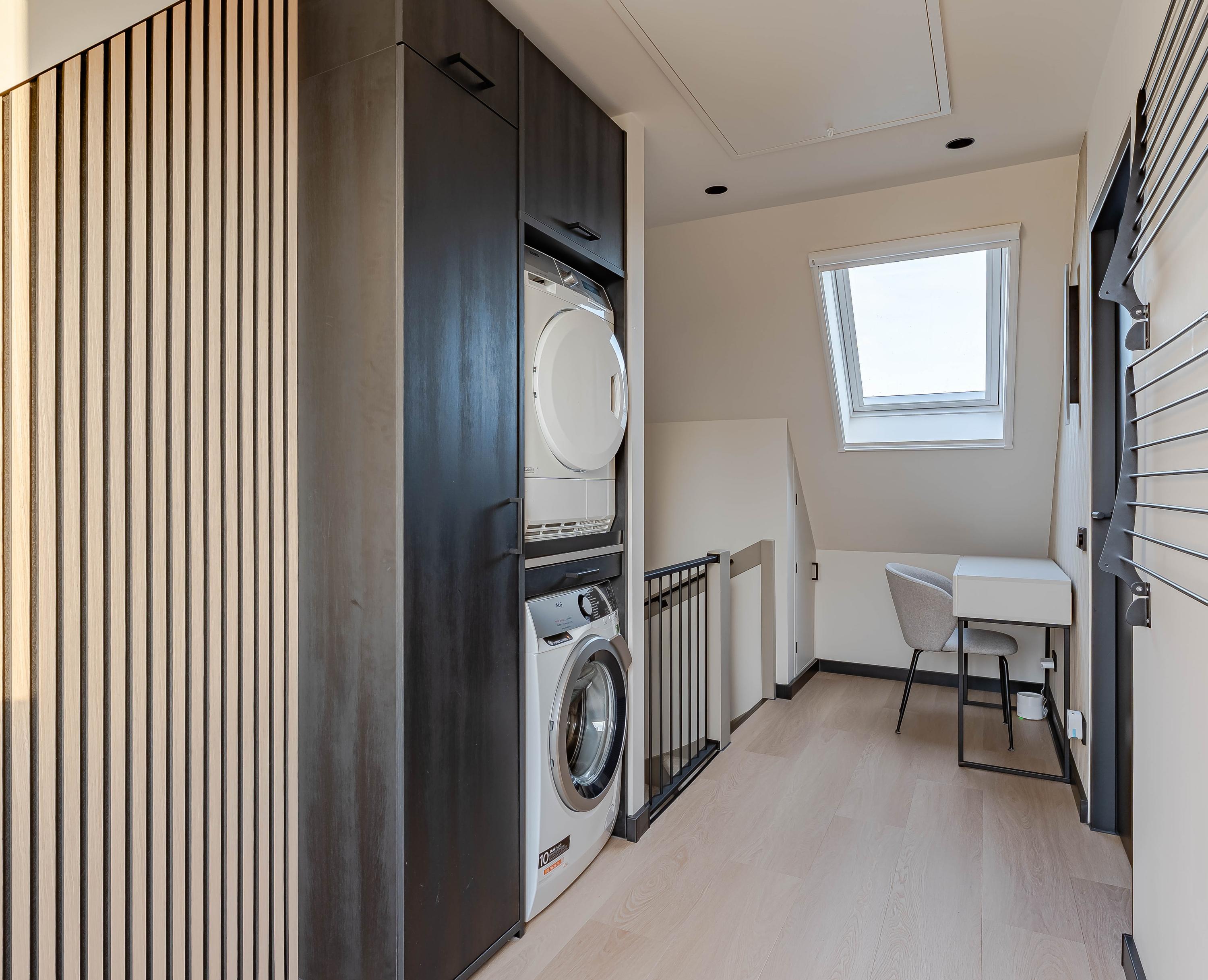 Ruime overloop met opstelling van de wasmachine/droger en HR combiketel (Intergas uit 2024). De vliering is bereikbaar middels vlizotrap, loopt door over de gehele breedte van de woning en geeft extra bergruimte.