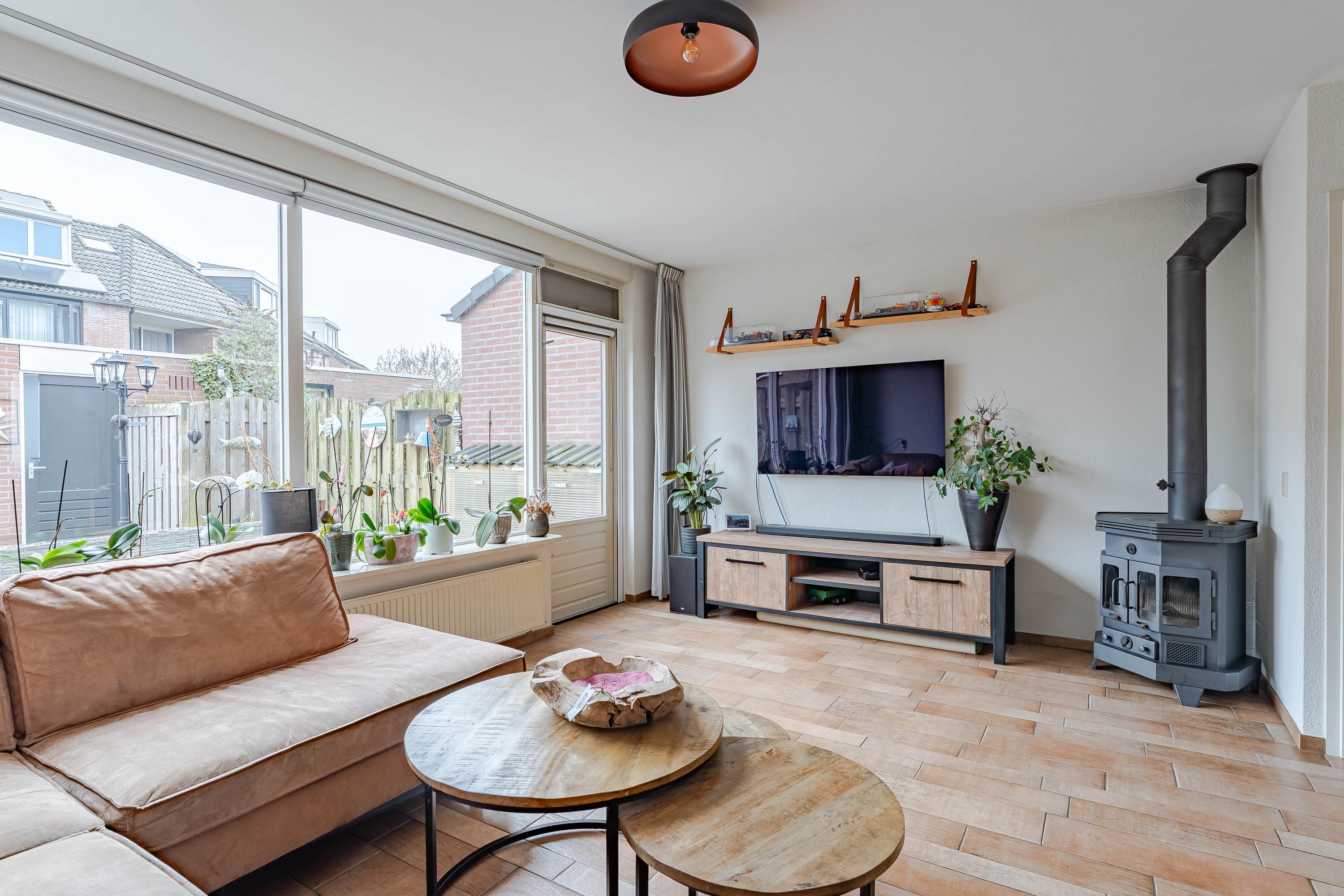 De tuingerichte woonkamer heeft veel lichtinval door de grote raampartijen. Er is voldoende ruimte voor een zit- en eethoek. De houtkachel geeft extra warmte en sfeer in de wintermaanden en de trapkast is ideaal voor extra bergruimte. De begane grond is voorzien van vloerverwarming en een plavuizenvloer.