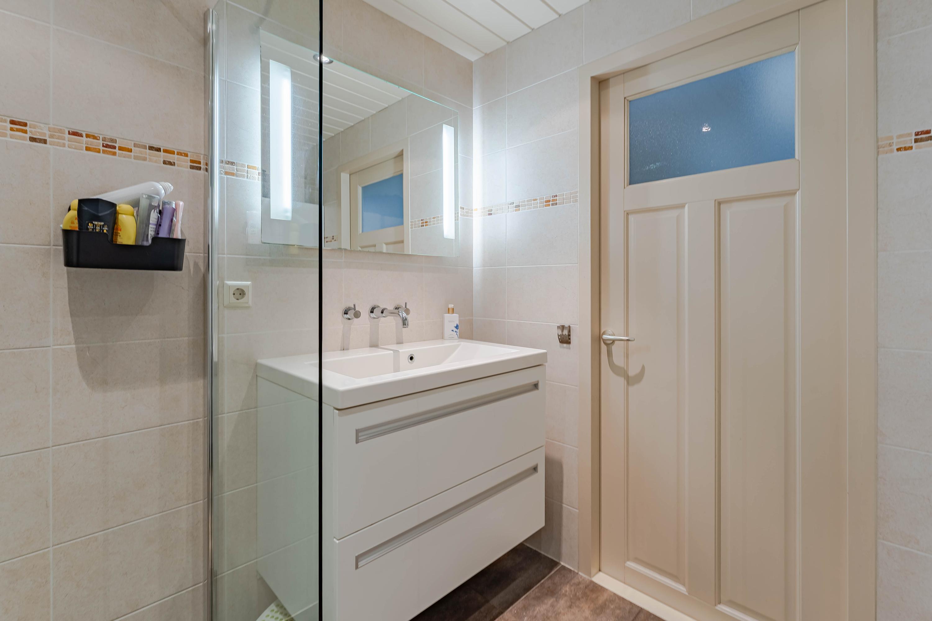 De badkamer is ruim en ingericht met een inloopdouche, toilet, wastafel met meubel, mechanische ventilatie en een designradiator.
