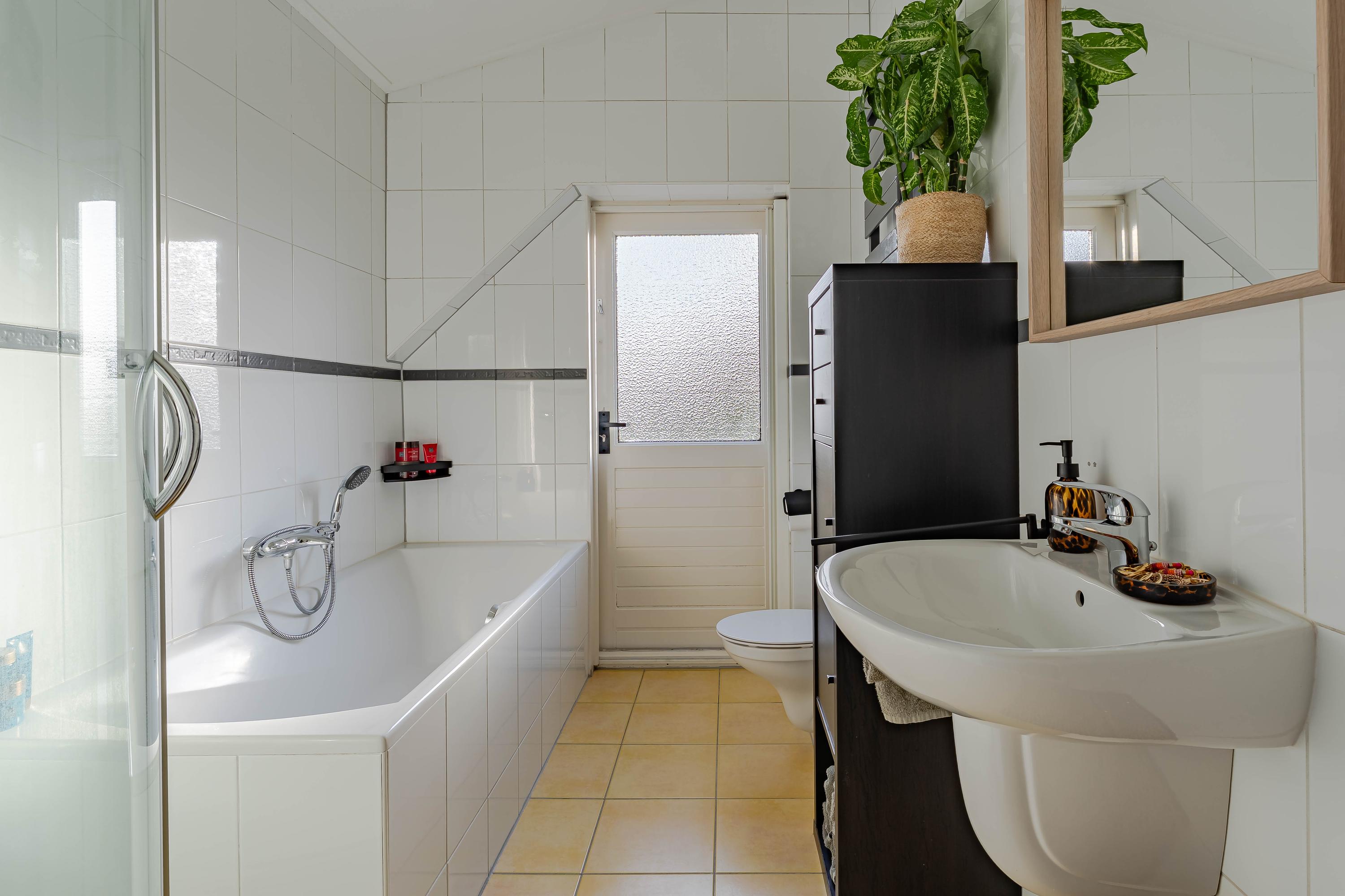 De badkamer is voorzien van een douchecabine, een ligbad, een zwevend toilet en een wastafel. Vanuit de badkamer heeft u toegang tot het dakterras.