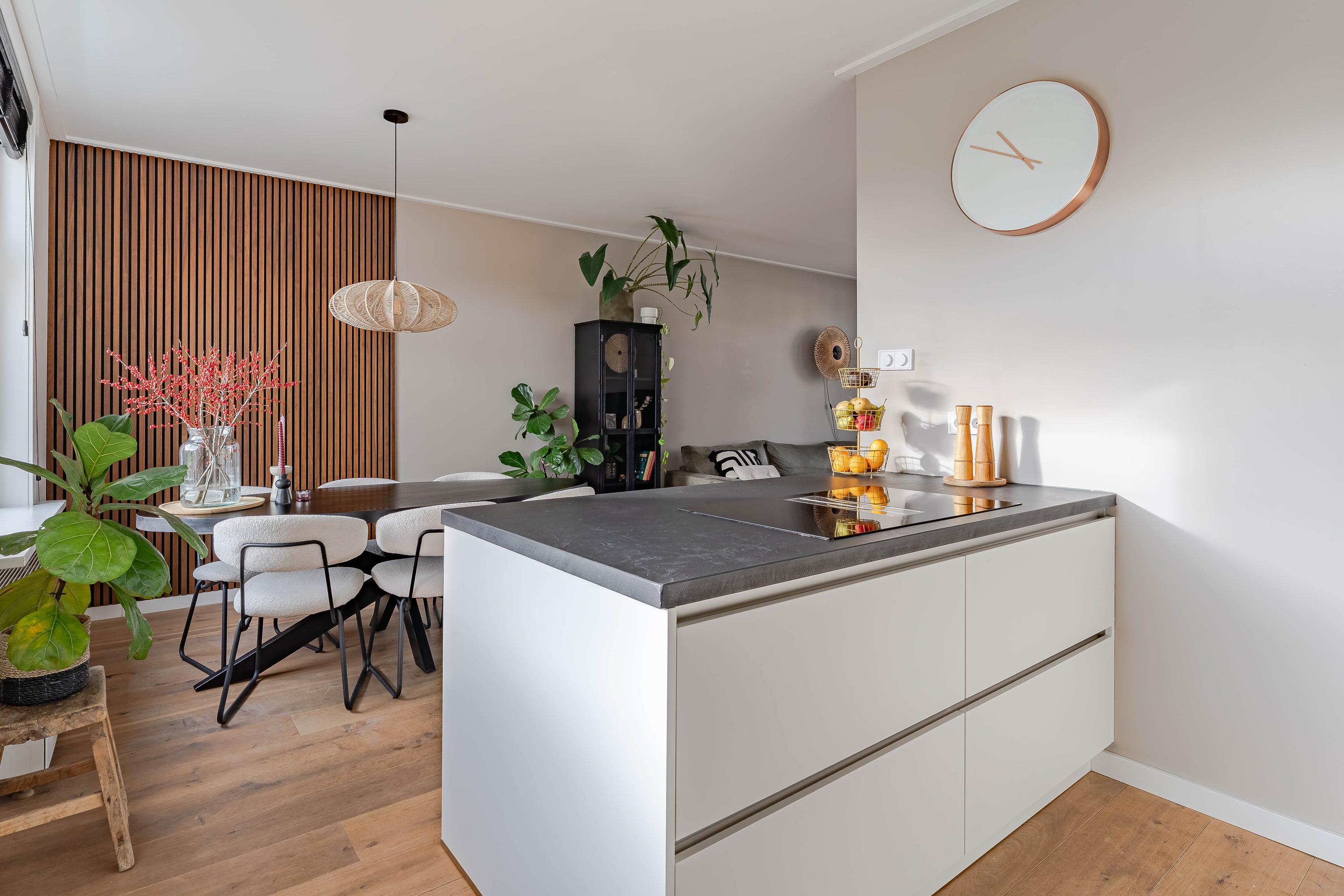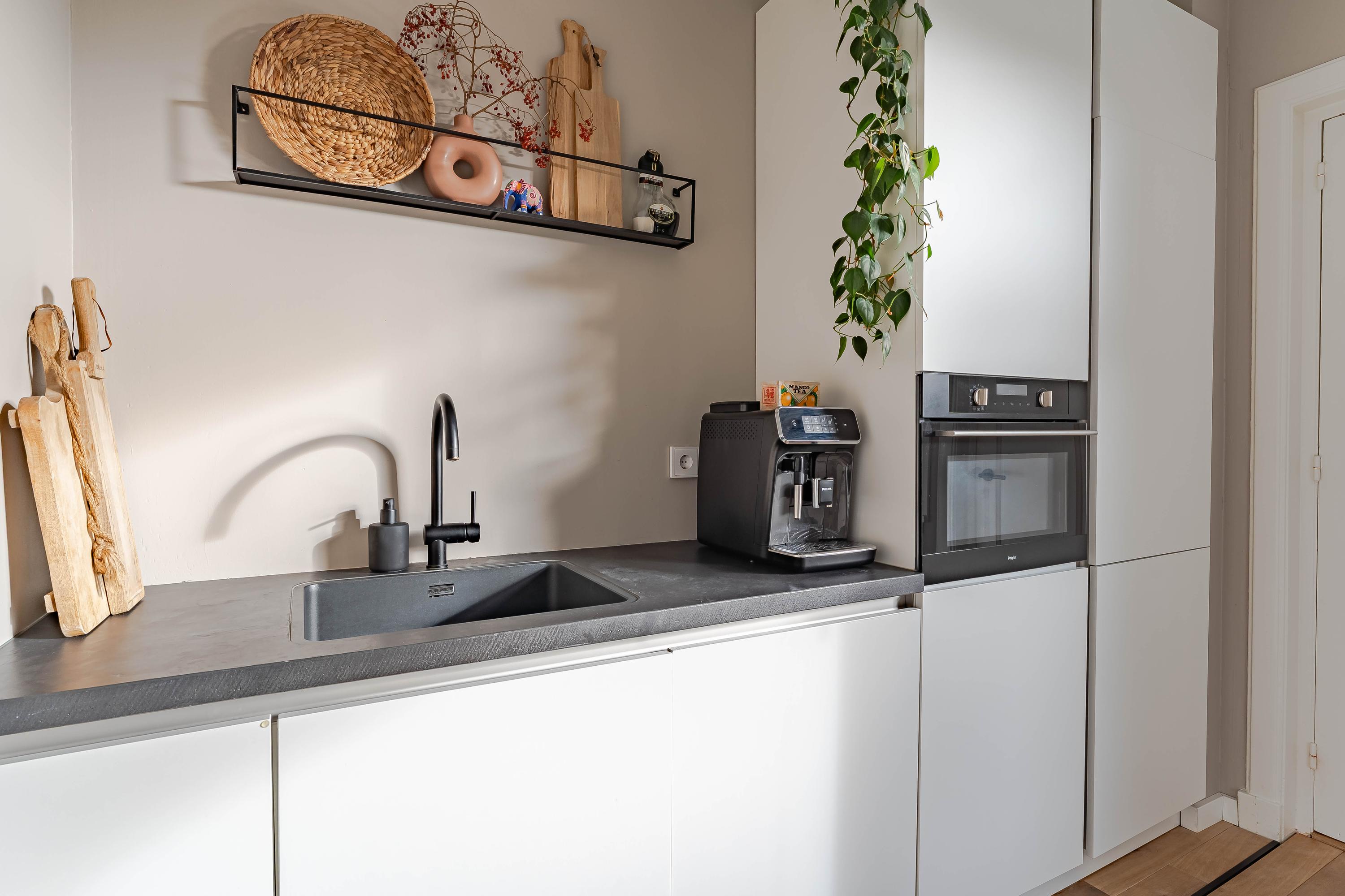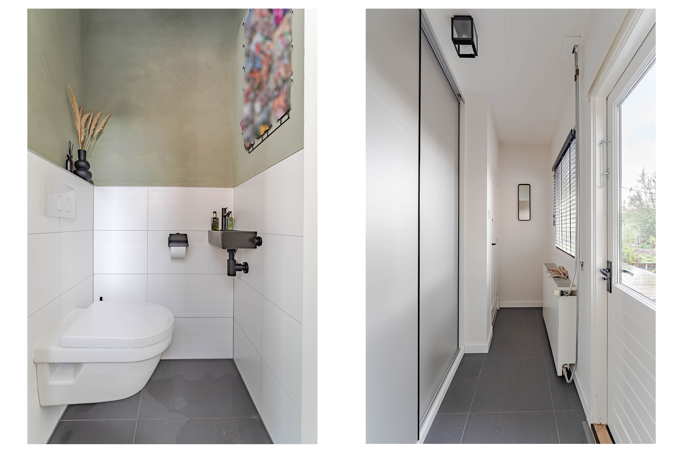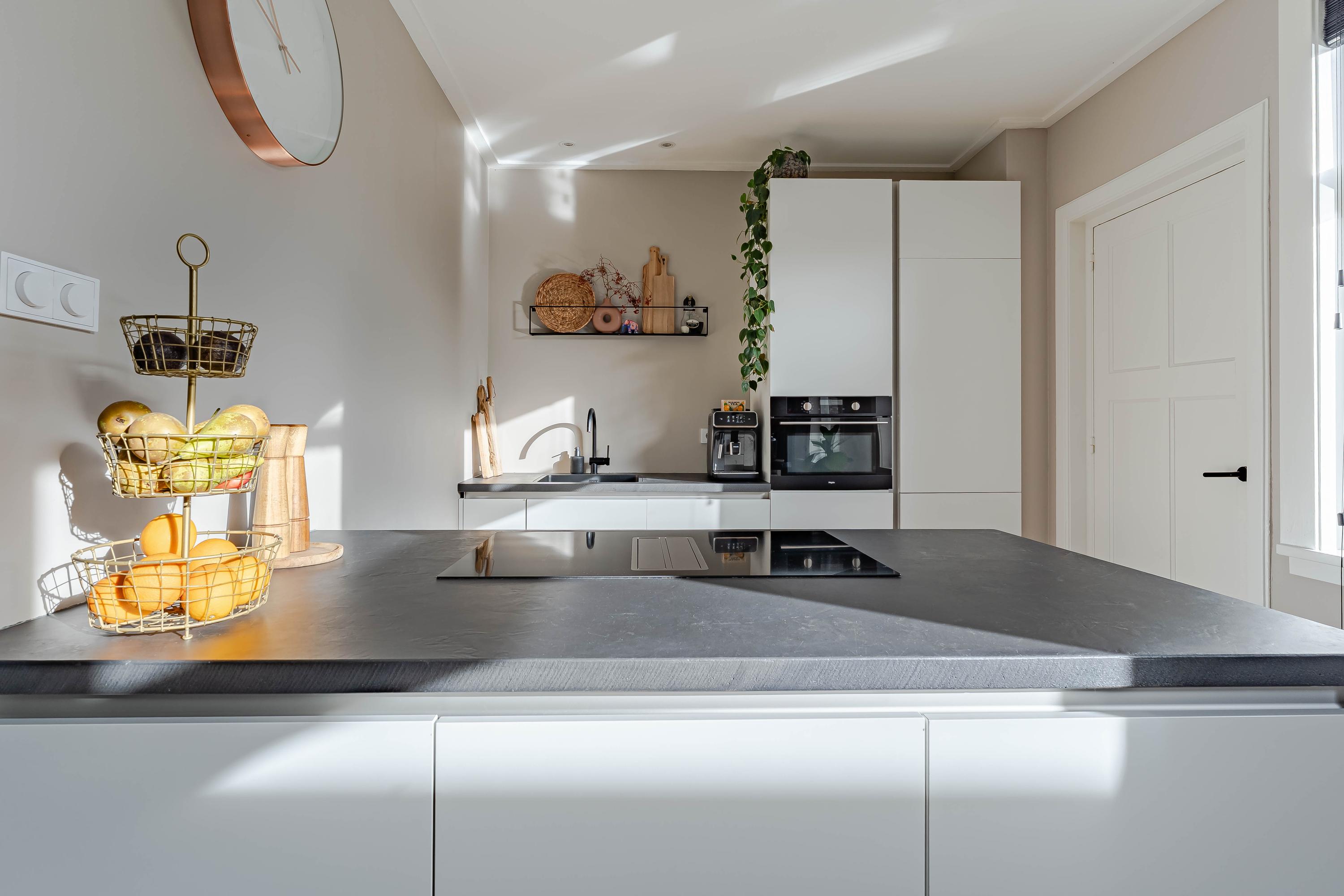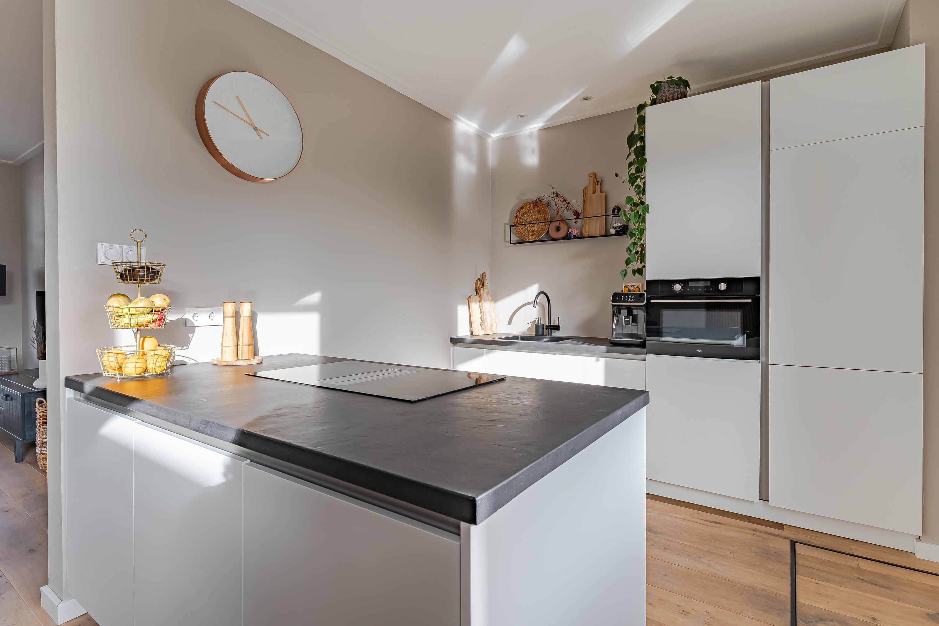 De keuken bevindt zich aan de achterzijde. Deze is voorzien van een recht keukenblok, een half vrijstaand kookeiland én is volledig uitgerust met een inductiekookplaat met geïntegreerde afzuiging, een koelkast, vriezer, vaatwasser en combioven. De kasten bieden voldoende bergruimte en het stenen blad maakt de keuken compleet. In de aanbouw aan de achterzijde bevindt zich een vaste kast, waarin de wasmachine is geplaatst. Er is ook ruimte voor extra opslag. Aan het einde van de aanbouw bevindt zich de modern ingerichte toiletruimte, voorzien van een zwevend toilet en een fonteintje.